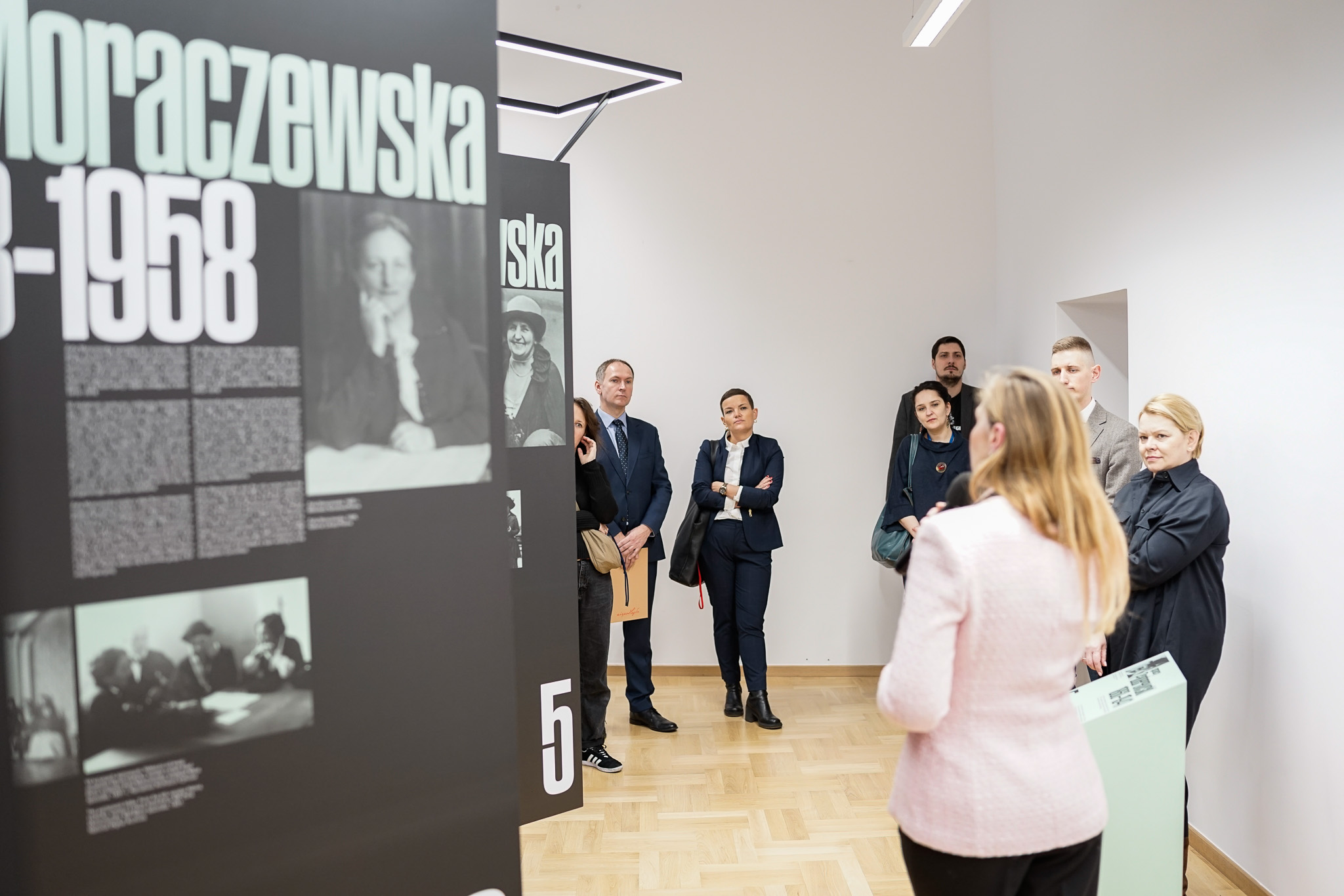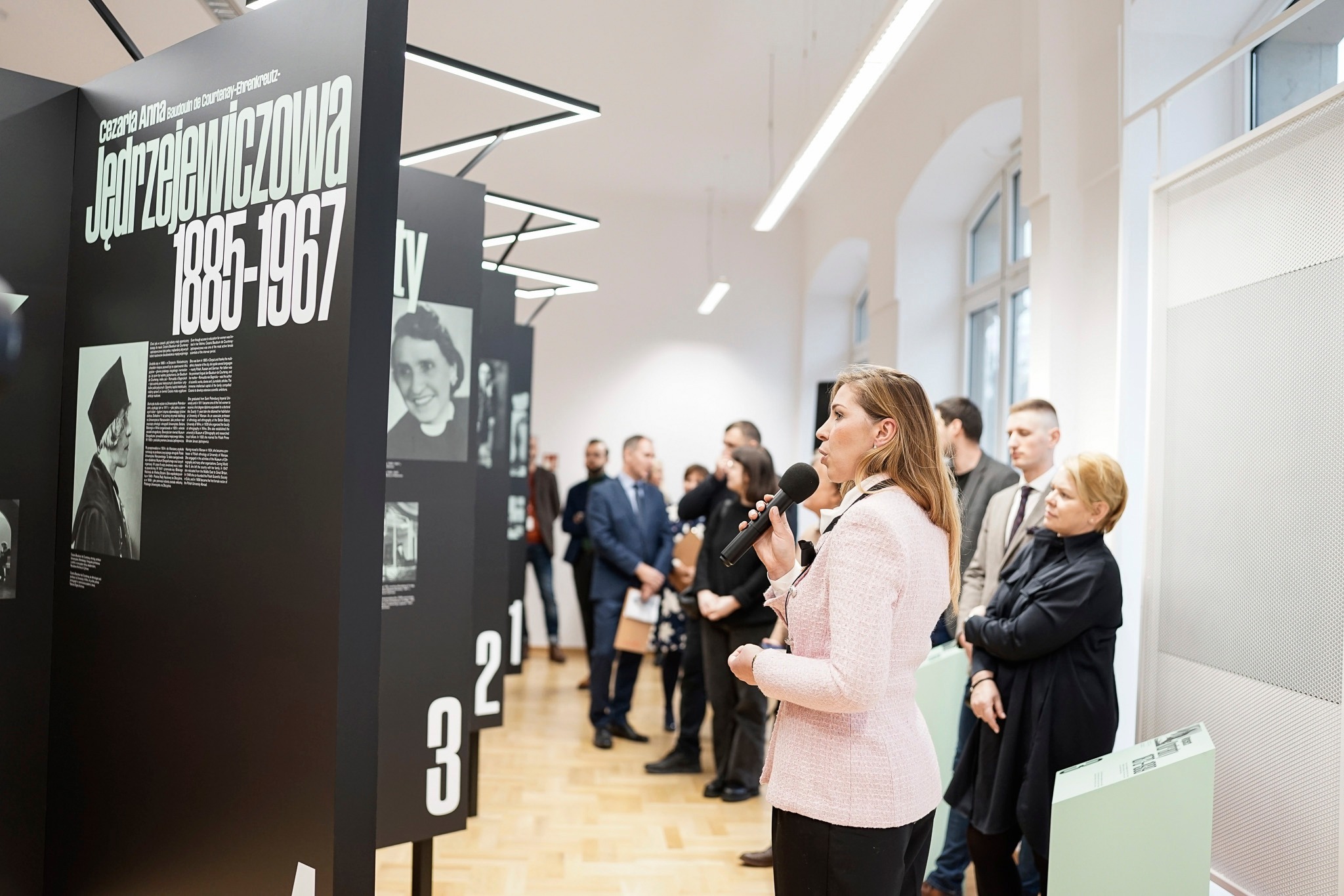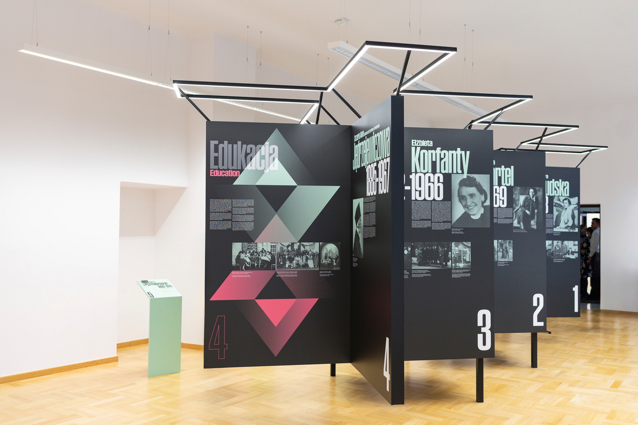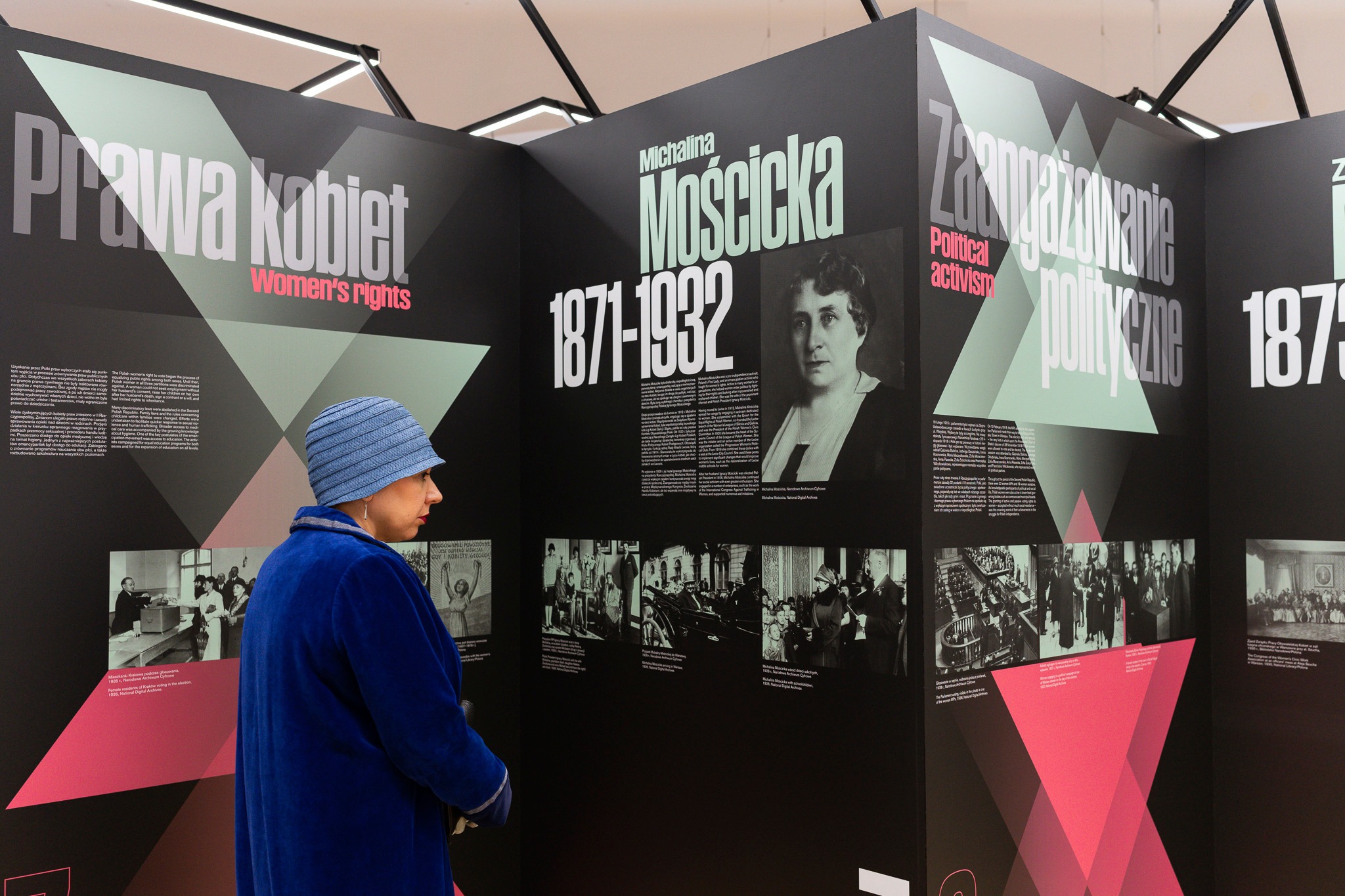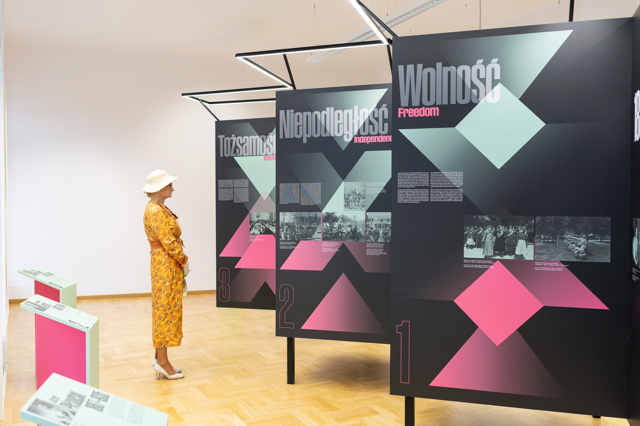 Główna treść wystawy jest umieszczona na ciemnym stalowym ekspozytorze. Mocny, dynamiczny kształt, sprawiający wrażenie delikatnie unoszącego się, symbolizuje siłę Polek - ich energię i ogromny wysiłek, który włożyły w urzeczywistnienie swoich celów. Uzupełnienie stanowią zielone pulpity przedstawiające Józefa Piłsudskiego, Kazimierza Bartla, Wojciecha Korfantego, Janusza Jędrzejewicza, Ignacego Paderewskiego, Jędrzeja Moraczewskiego i Ignacego Mościckiego. Umieszczenie ich na osobnych elementach podkreśla wzajemną niezależność, ale i nierozłączność prezentowanych postaci.