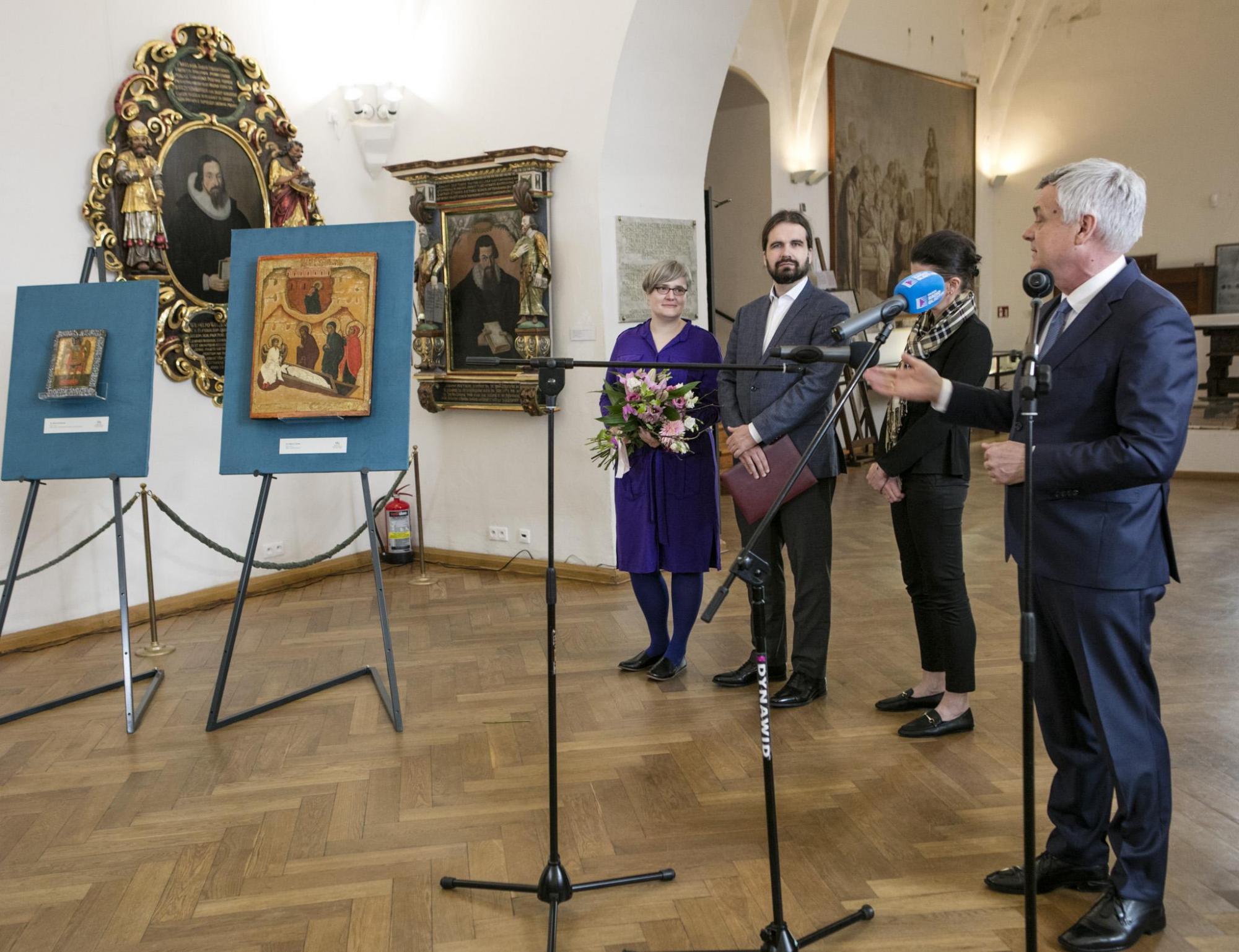 „Jesteśmy bardzo szczęśliwi, że po ponad 30 latach piękna ikona „Trzy Marie u grobu” właśnie dziś, w Wielki Piątek, ostatecznie wróciła do macierzystego Muzeum. Na odnalezienie czeka jeszcze 27 ikon ze zbioru skradzionego w grudniu 1990 roku. Zapewniam Państwa, że Ministerstwo Kultury i Dziedzictwa Narodowego dołoży wszelkich starań, aby je odnaleźć i odzyskać” – napisał wiceminister kultury, generalny konserwator zabytków dr Jarosław Sellin w liście odczytanym podczas przekazania odzyskanego obrazu do zbiorów Muzeum Warmii i Mazur w Olsztynie.