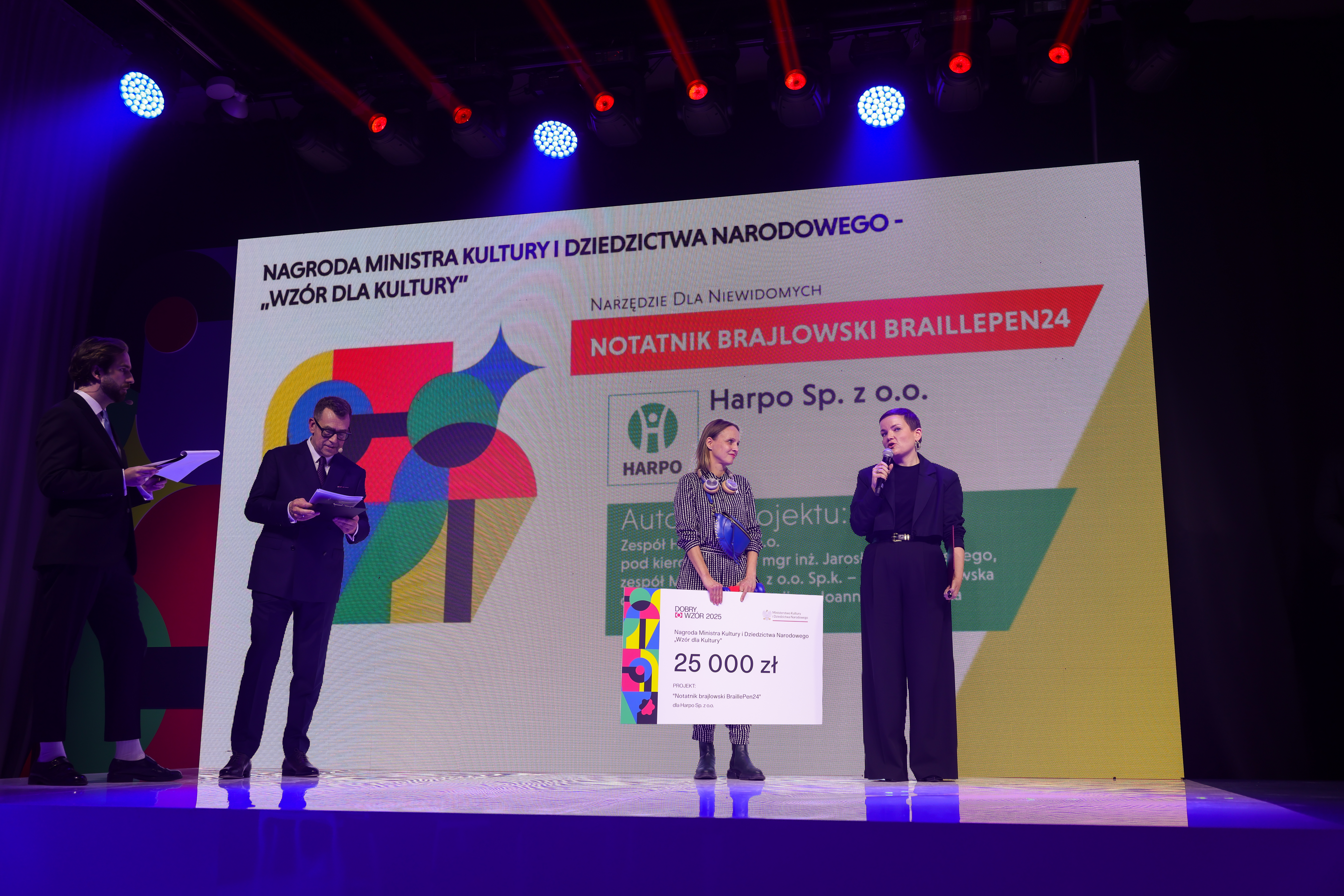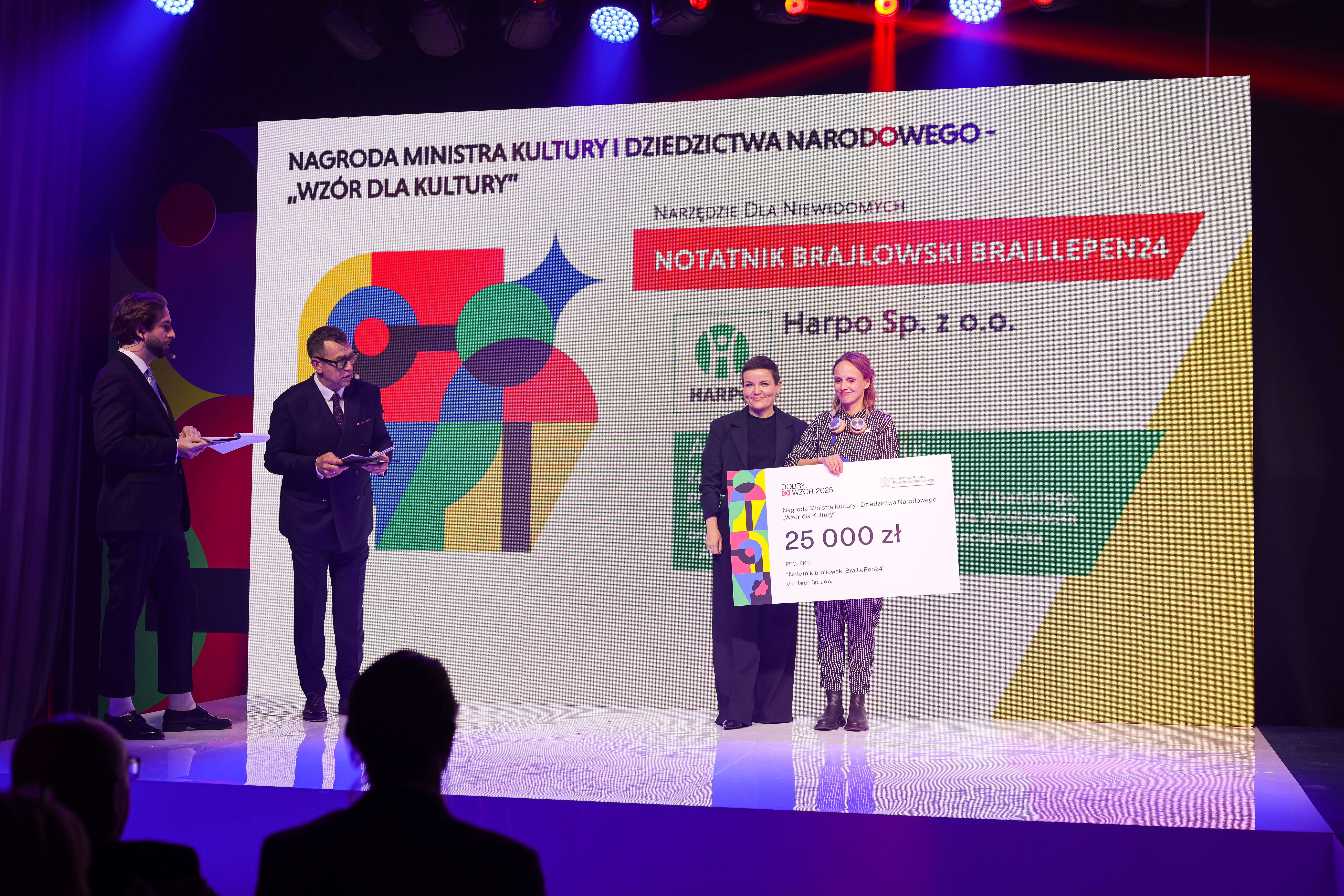 Notatnik brajlowski BraillePen24 to tegoroczny laureat nagrody specjalnej „Wzór roku dla kultury 2025”, przyznawanej przez Ministra Kultury i Dziedzictwa Narodowego w ramach konkursu „Dobry Wzór”. Projekt został zrealizowany przez zespół Harpo pod kierownictwem mgr. inż. Jarosława Urbańskiego we współpracy z Anną Wróblewską z agencji Metaphor oraz projektantkami Joanną Leciejewską i Agnieszka Mazurek z Ekierki Design Studio. Nagrodę wręczyła Marta Cienkowska, ministra kultury i dziedzictwa narodowego, podczas gali 32. edycji konkursu „Dobry Wzór”.
