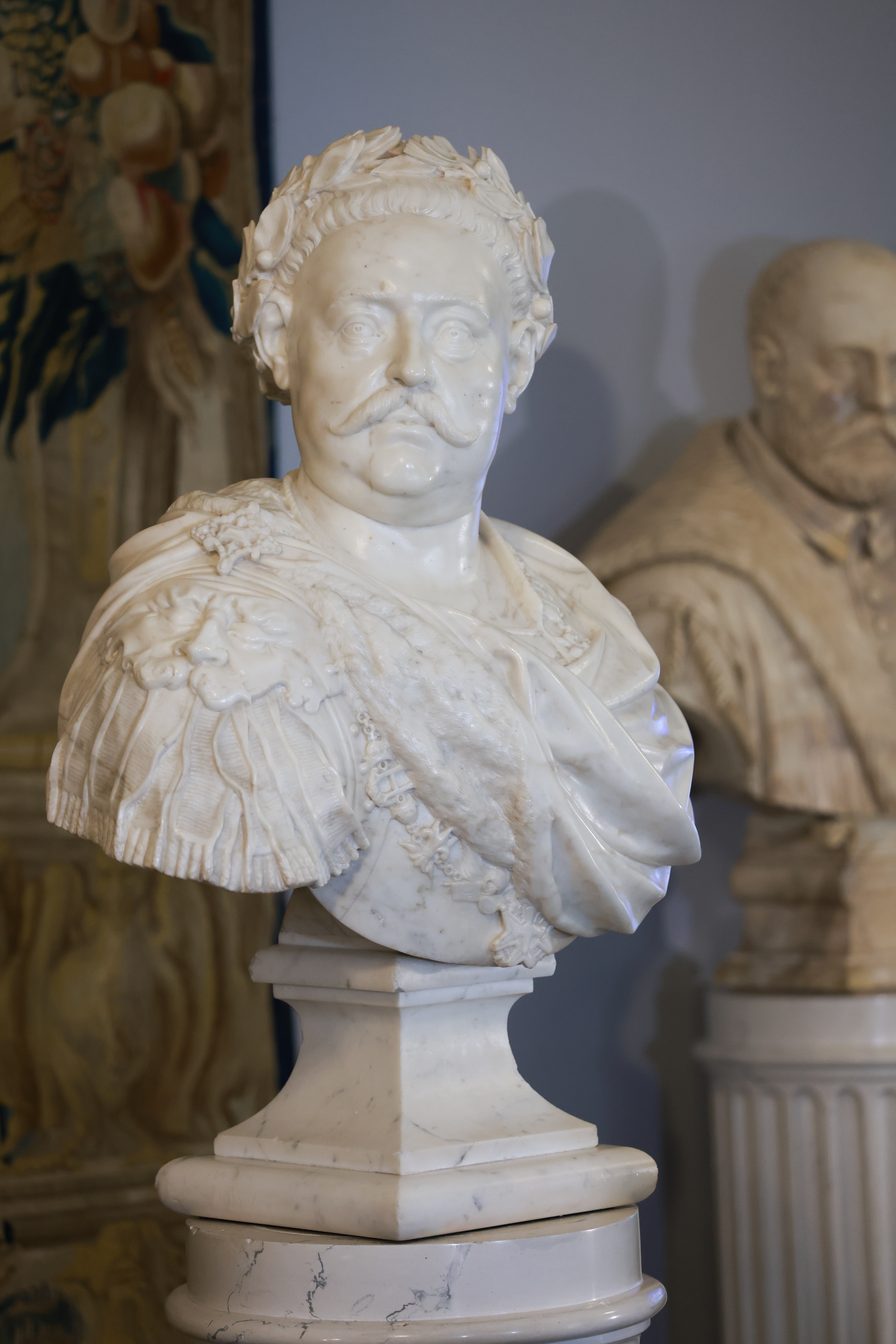 - popiersie króla Jana III Sobieskiego - wyrzeźbione w 1777 roku przez Giacomo Monaldiego, nadwornego rzeźbiarza Stanisława Augusta, wykonane z marmuru karraryjskiego. Stanowi jedno z czterech rzeźbiarskich portretów zamówionych u Monaldiego przez Stanisława Augusta do nowo urządzanej Sali Audiencjonalnej Starej w Zamku Królewskim w Warszawie. Król Jan III przedstawiony jest w antycznej zbroi, z widocznym prawym naramiennikiem w formie maski. Na głowie ma wieniec laurowy – symbol triumfu, a jego pierś zdobi łańcuch Orderu Świętego Ducha. Nadany Janowi III przez króla Francji Ludwika XIV order był najwyższym orderem królestwa Francji.