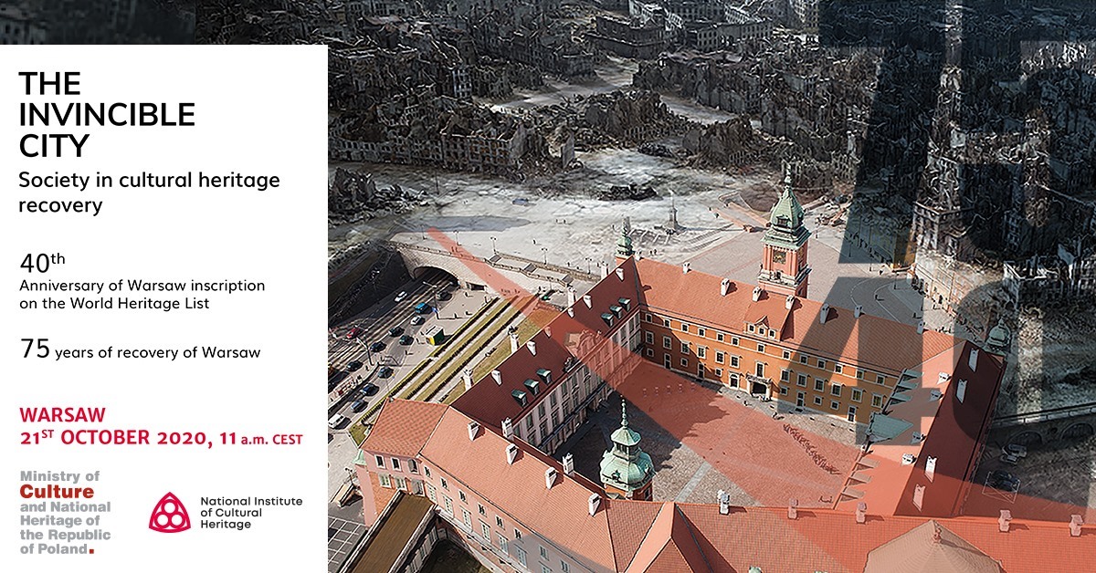 Międzynarodowe webinarium „The invincible city. Society in cultural heritage recovery” z okazji 40-lecia wpisu „Historycznego Centrum Warszawy” na Listę Światowego Dziedzictwa UNESCO oraz 75-lecia jego odbudowy odbędzie się w środę, 21 października. Inicjatorem konferencji jest Ministerstwo Kultury i Dziedzictwa Narodowego, które do współudziału w tym wyjątkowym wydarzeniu zaprosiło ekspertów z Centrum Światowego Dziedzictwa UNESCO, Międzynarodowej Rady Ochrony Zabytków (ICOMOS), Międzynarodowego Centrum Badań nad Ochroną i Konserwacją Dziedzictwa Kulturowego (ICCROM) oraz Narodowy Instytut Dziedzictwa.