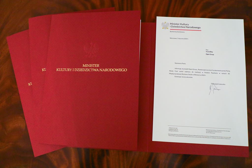 Kuratorka Marta Czyż i artyści Open Group – Yuriy Biley, Pavlo Kovach i Anton Varga – odebrali dziś z rąk ministra kultury i dziedzictwa narodowego Bartłomieja Sienkiewicza decyzję o udziale ich projektu „Powtarzajcie za mną II” na 60. Międzynarodowej Wystawie Sztuki w Wenecji. Wybrany projekt, będący wynikiem wieloletniej współpracy kuratorki i artystów Open Group, będzie prezentowany w Pawilonie Polskim.