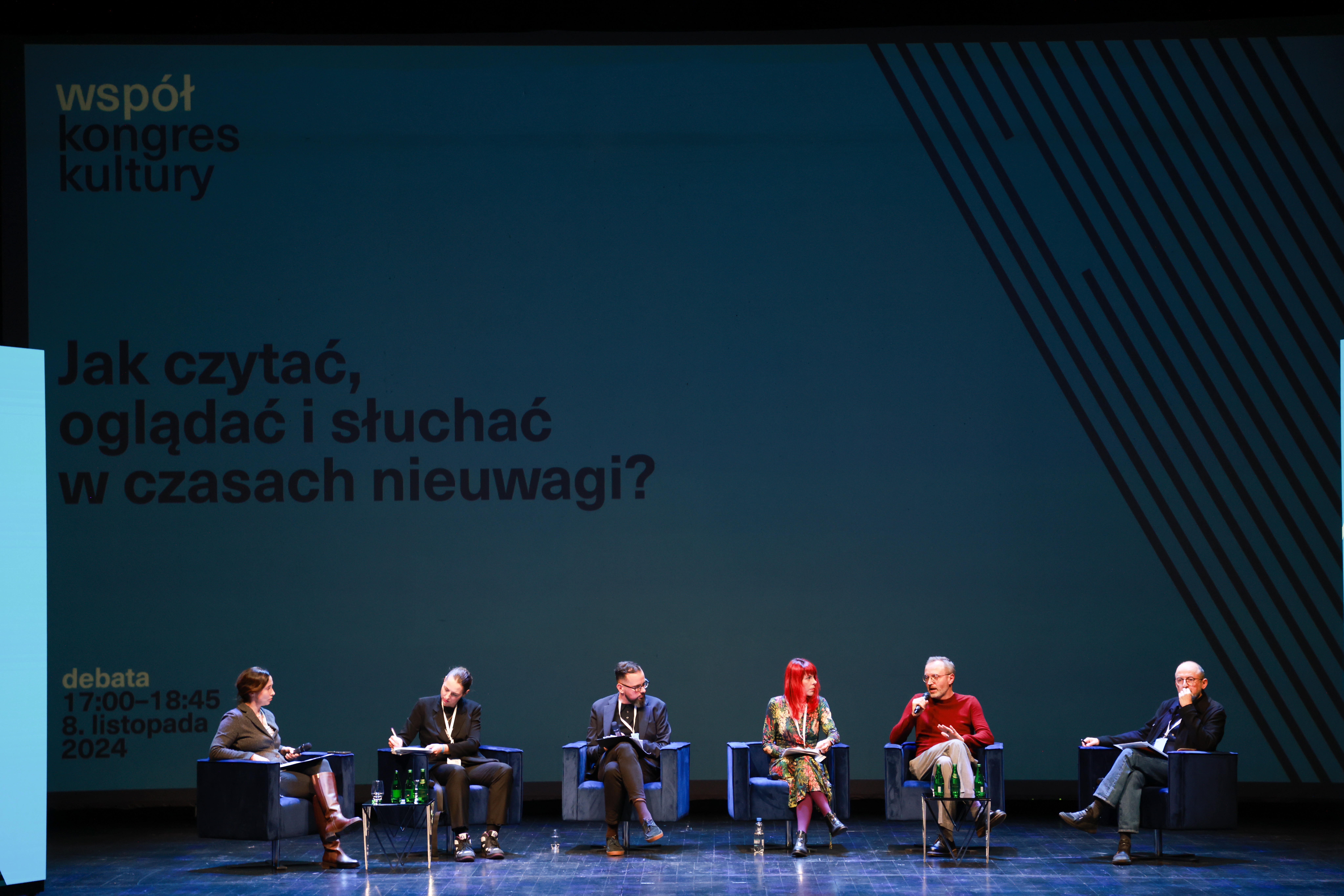 Roli nowych technologii w odbiorze i dostępie do kultury poświęcona była debata „Jak czytać, oglądać i słuchać w czasach nieuwagi?”, w której rozmawiali: Anna Cieplak, Karol Jachymek, Grzegorz Jankowicz, Katarzyna Janota i Paweł Łysak. Prowadziła: dr Zofia Król.