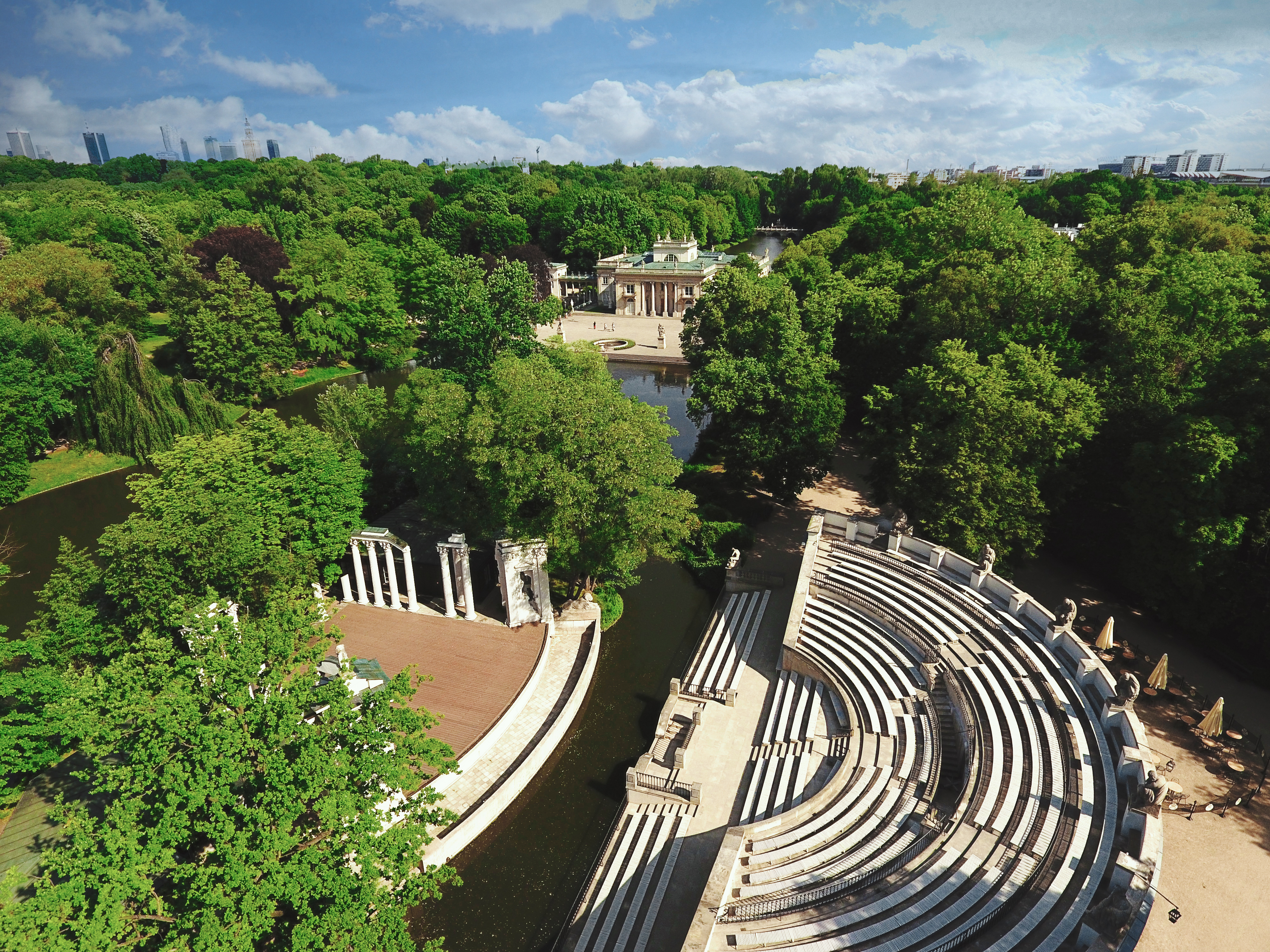 Amfiteatr widoczny z tarasu Pałacu na Wyspie nawiązuje w swej architekturze do ruin Herculanum i Forum Romanum. Jego scenę ujmują z obu stron rzeźby: umierający gladiator i umierająca Kleopatra.