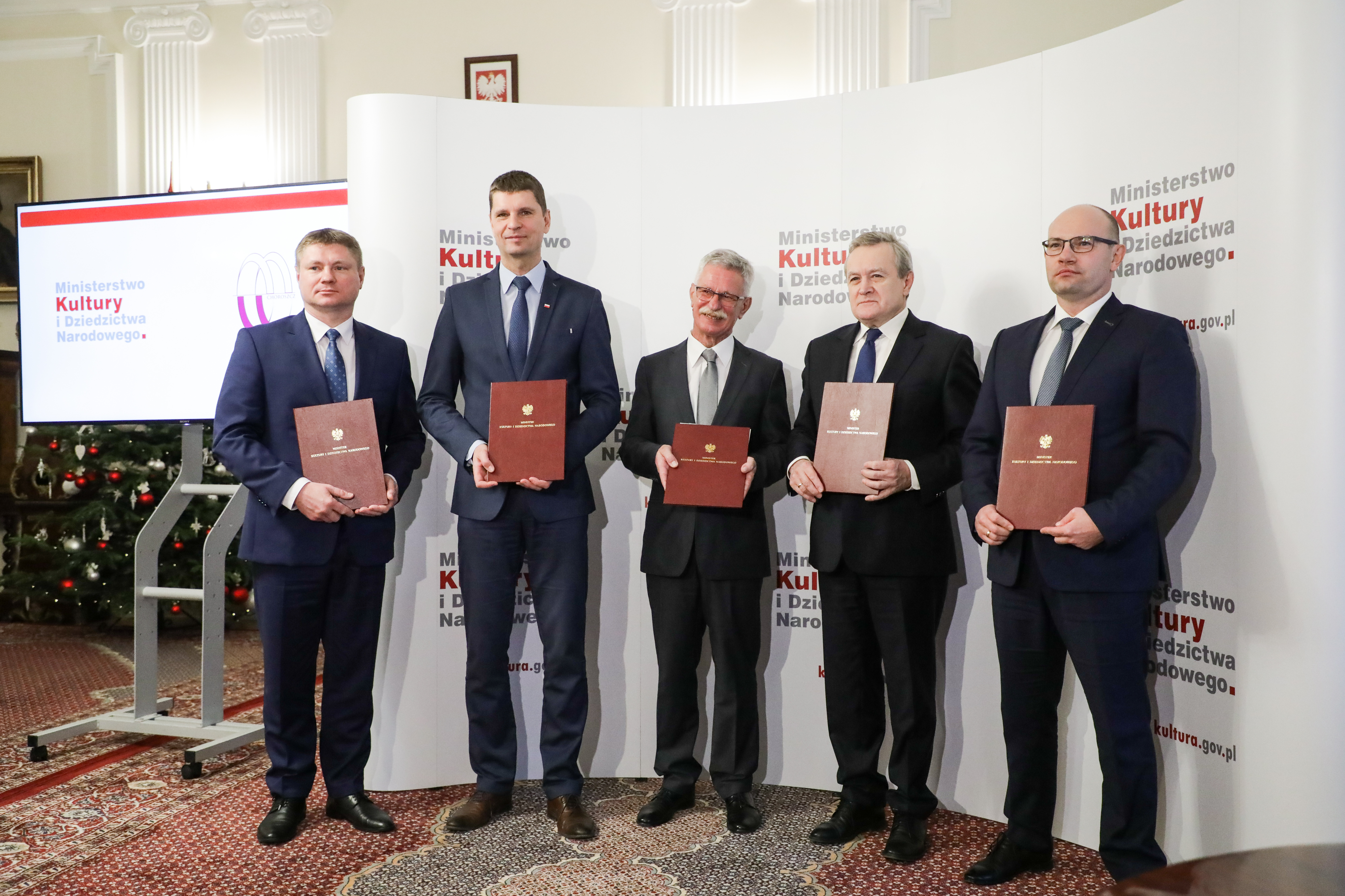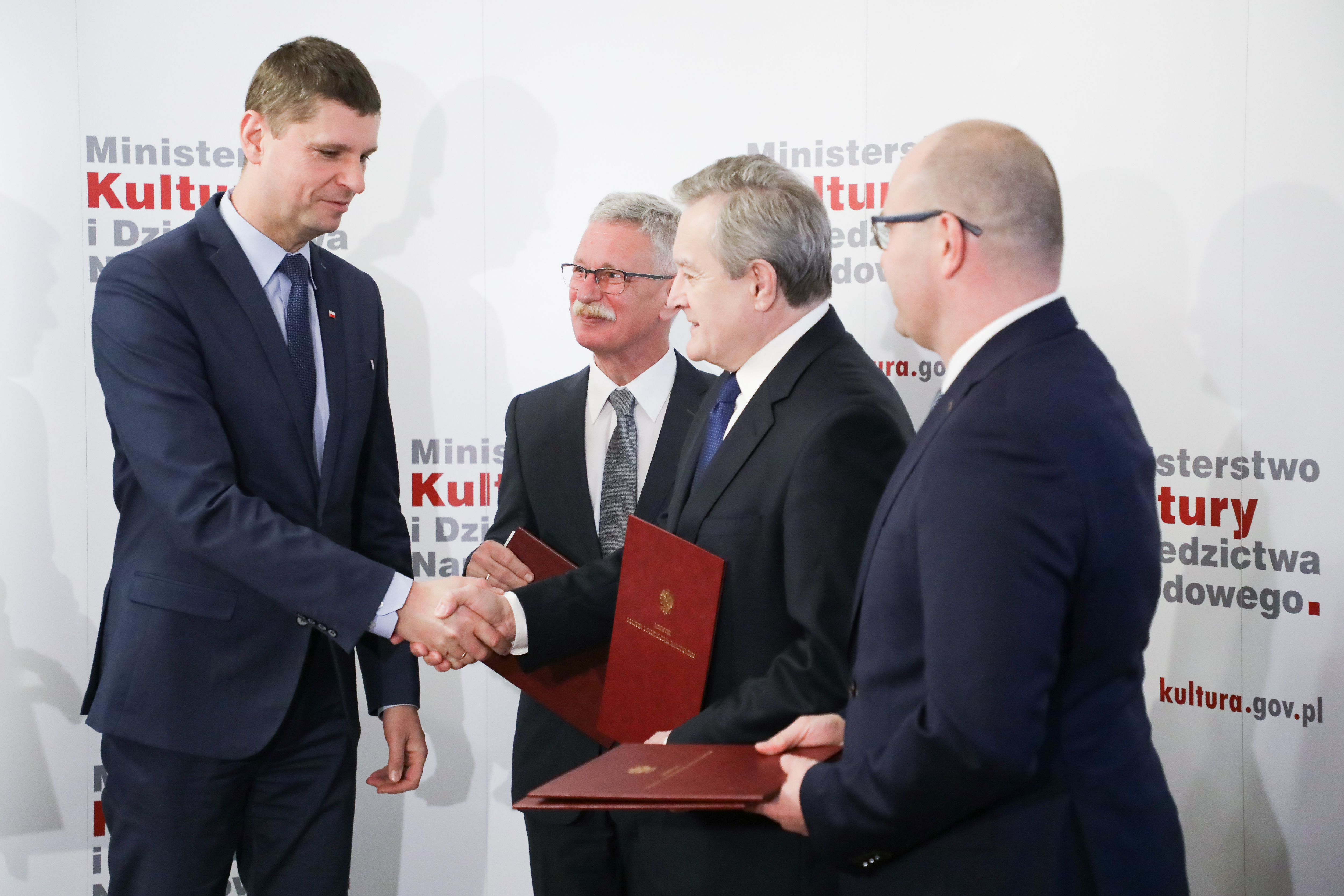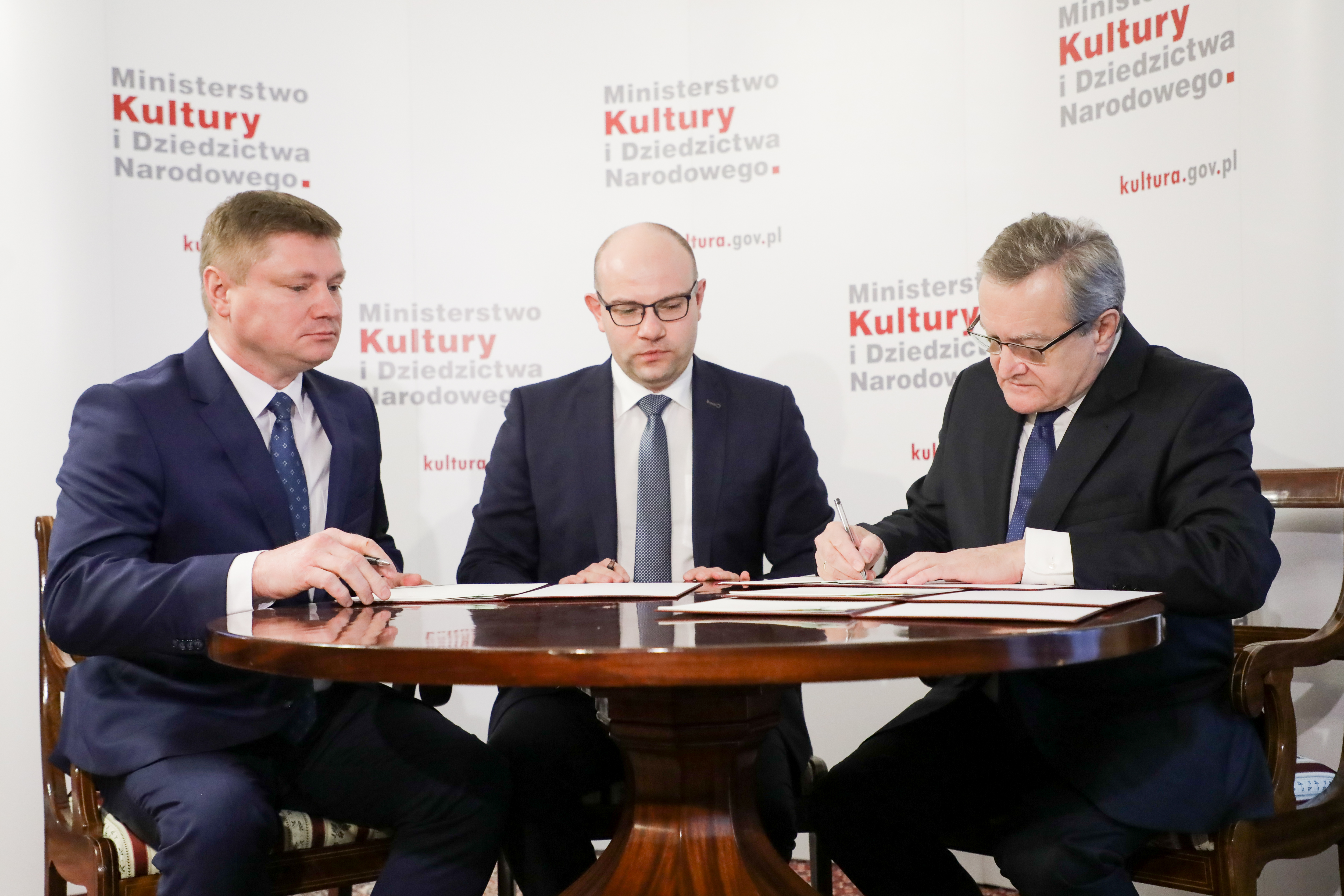 Wicepremier, minister kultury prof. Piotr Gliński, marszałek województwa podlaskiego Artur Kosicki oraz członek zarządu województwa podlaskiego Marek Malinowski podpisali dziś umowę o prowadzeniu jako wspólnej instytucji kultury Muzeum Podlaskiego w Białymstoku. Zgodnie z 10-letnią umową, która zacznie obowiązywać od 1 stycznia 2020 r. Minister przekaże Muzeum rocznie nie mniej 1 mln zł dotacji, natomiast Województwo nie mniej niż 7 mln zł. W uroczystości, która odbyła się w siedzibie Ministerstwa Kultury i Dziedzictwa Narodowego wzięli również minister edukacji narodowej, poseł ziemi podlaskiej Dariusz Piontkowski oraz dyrektor Muzeum Andrzej Lechowski.