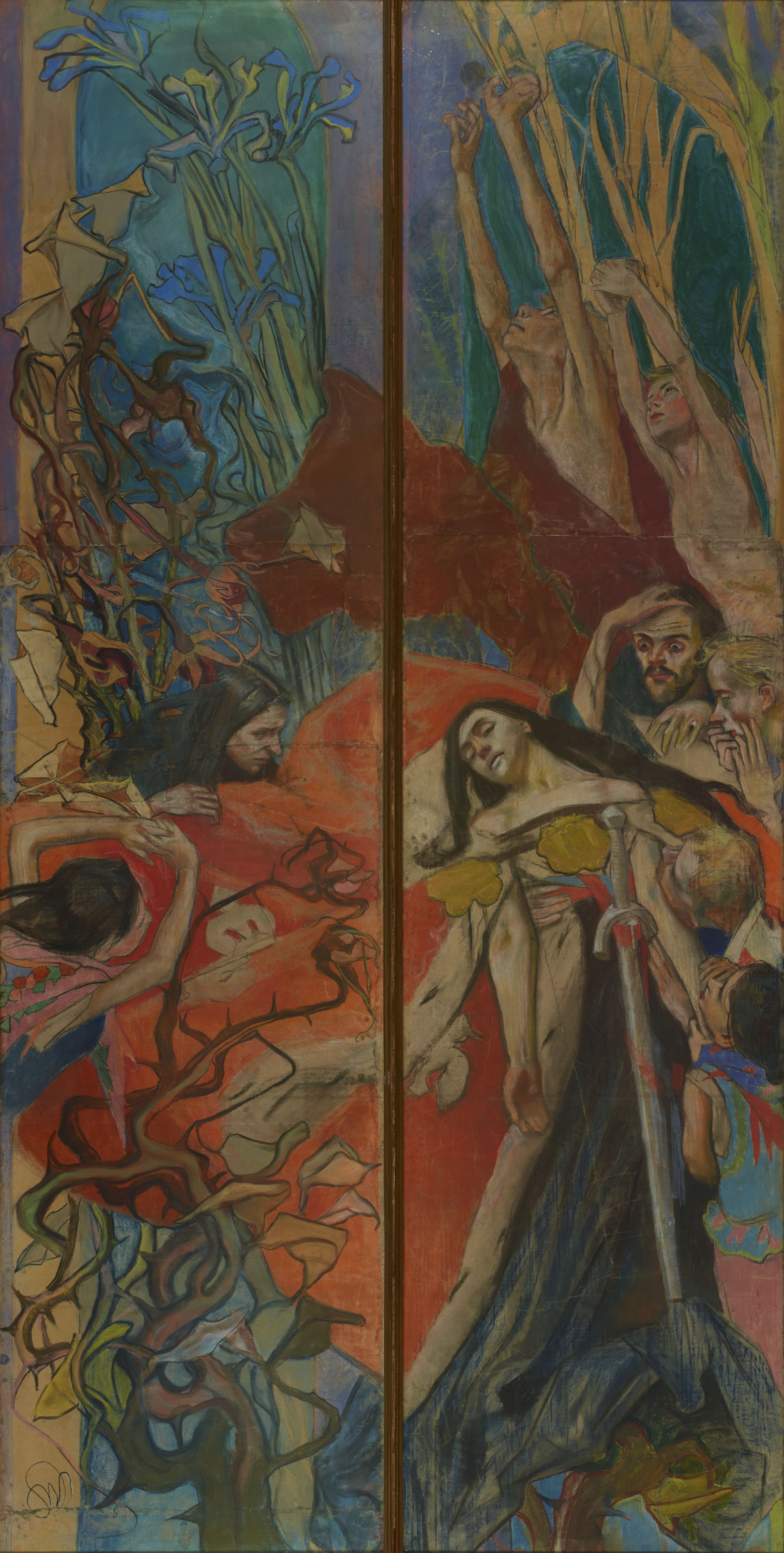 Na pierwszym piętrze prezentowane są dzieła Stanisława Wyspiańskiego poruszające trzy najważniejsze wątki w jego twórczości, stąd jej części zatytułowano: „Żywioły”, „Wawel – dramat królów” i „Apollo-Chrystus”. Wokół nich zbudowana została opowieść o artyście, który w swej twórczości w nowatorski sposób podejmował problematykę narodową i religijną, odnosił się do pamięci i historii, inspirował antykiem oraz średniowieczem. Najwybitniejsze prace Wyspiańskiego – między innymi projekt witraża Bóg Ojciec do zachodniego okna kościoła Franciszkanów w Krakowie i pastelowe projekty do dekoracji malarskiej tej świątyni, projekty witraży do katedry na Wawelu, propozycje dekoracji, mebli i tkanin do gmachu Towarzystwa Lekarskiego Krakowskiego i sali Towarzystwa Artystów Polskich „Sztuka” w krakowskim Towarzystwie Przyjaciół Sztuk Pięknych, model Akropolis – prezentują ciekawą formę artystyczną i wskazują na wielostronność twórczości artysty: od malarstwa przez sztukę stosowaną po architekturę.