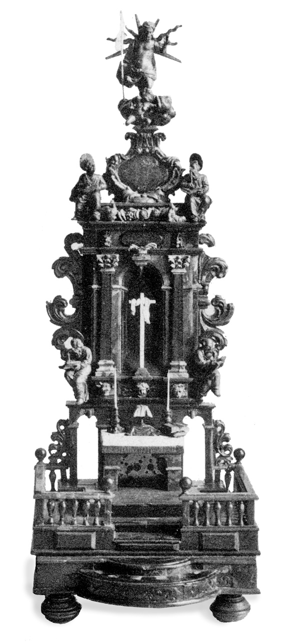 - Ołtarzyk bursztynowy, Gdańsk (?), Królewiec (?), Elbląg (?), pocz. XVIII w., drewno, bursztyn, kość słoniowa, wys. 39,5 cm, nr w bazie strat wojennych: 64389;