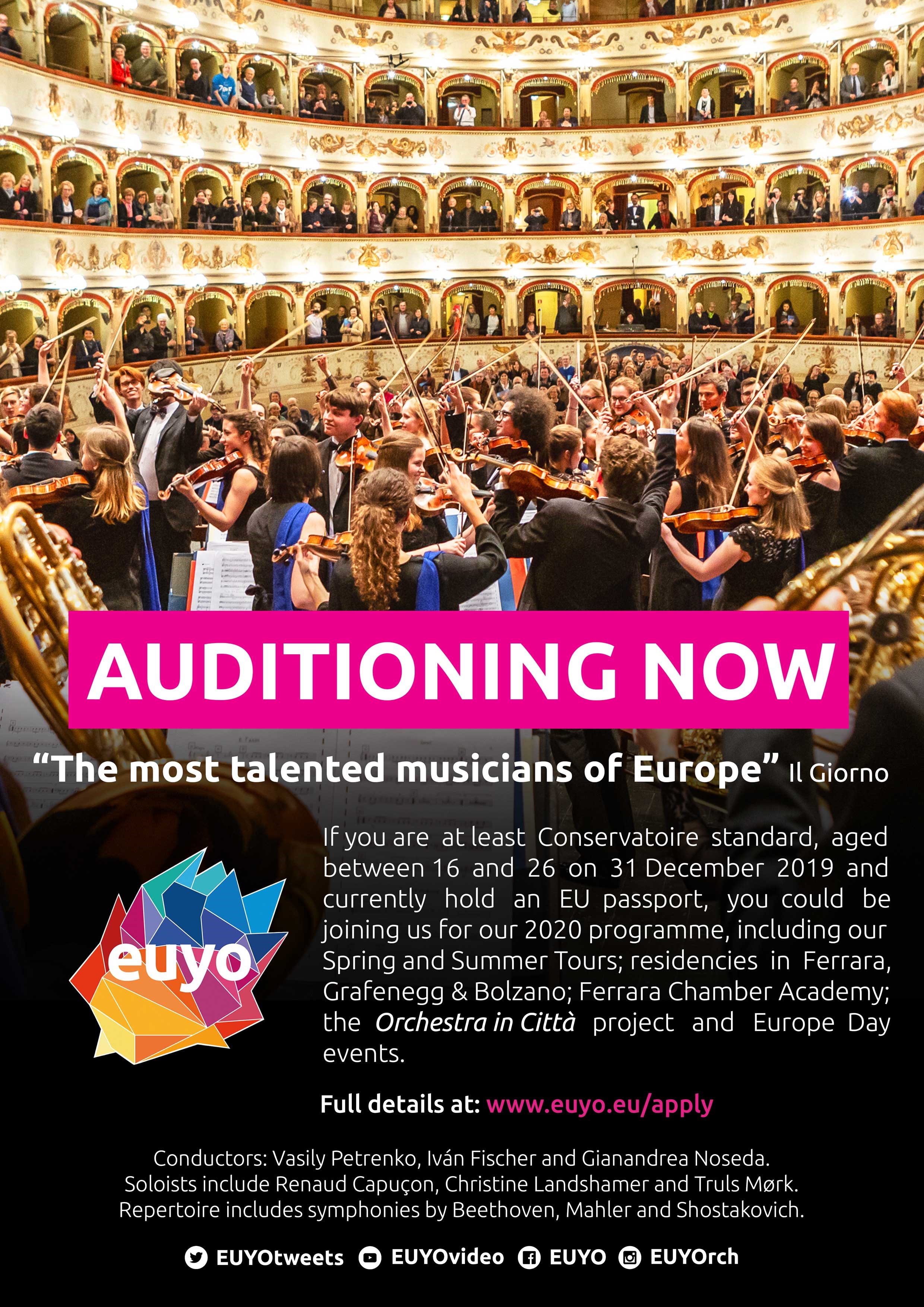 Szczegółowe informacje (wymagania repertuarowe itp.) można uzyskać na stronie internetowej www.euyo.uk,a także u Elizy Kujan (tel. 22 55 15 786, 695 310 107; e-mail: eliza.kujan@mkidn.gov.pl )