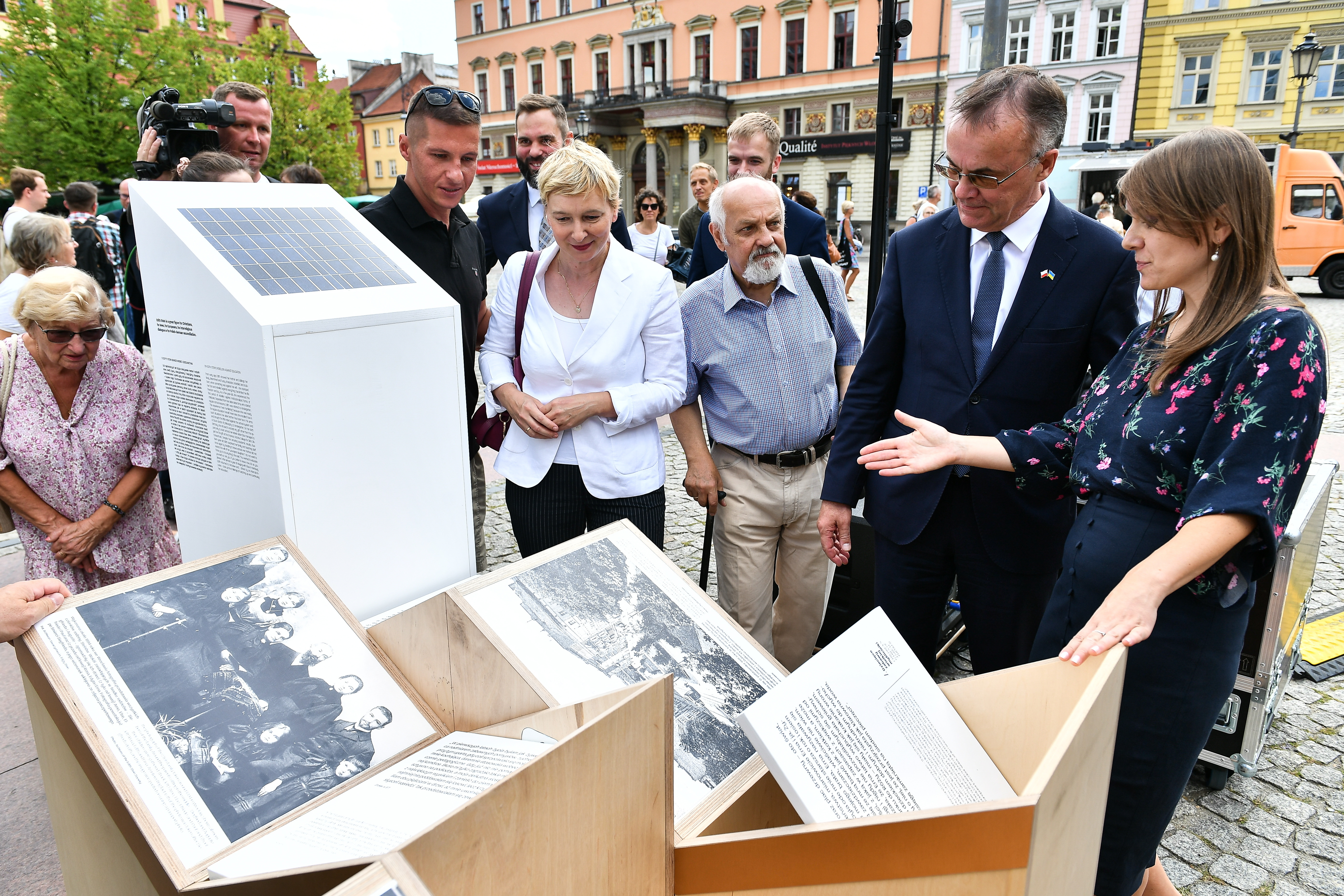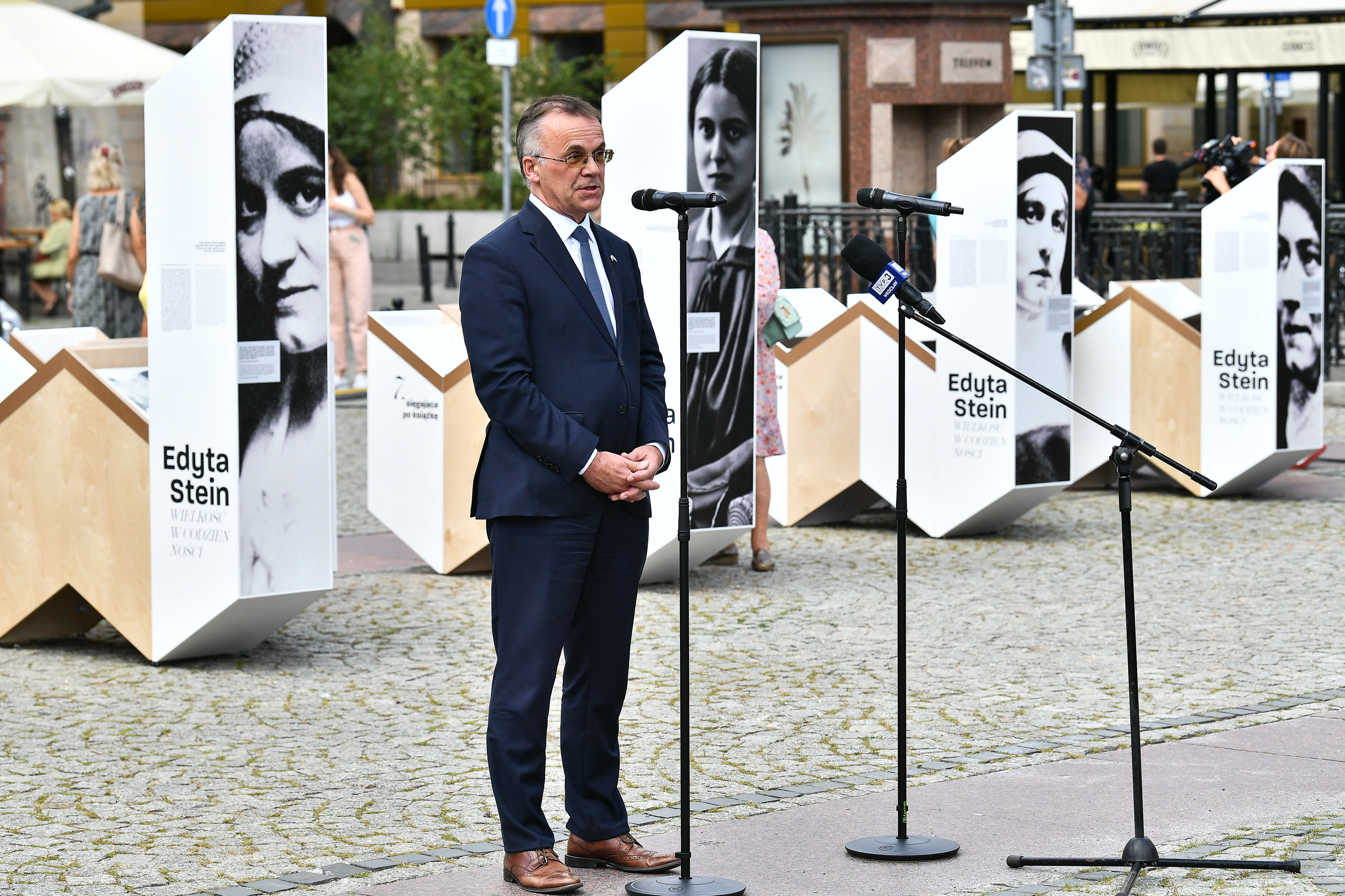 „W wigilię 80. rocznicy śmierci Edyty Stein w komorach gazowych niemieckiego nazistowskiego obozu koncentracyjnego Auschwitz-Birkenau, mam zaszczyt otwierać wystawę we wrocławskim domu jej urodzenia. (…) Ufam, że dzięki tej ekspozycji zarówno wrocławianie, jak i goście z kraju i zagranicy, będą mogli bliżej poznać fascynującą postać Edyty Stein – Teresy Benedykty od Krzyża” – powiedział wiceminister kultury i dziedzictwa narodowego dr Jarosław Sellin podczas wernisażu wystawy „Edyta Stein – wielkość w codzienności” na placu Solnym we Wrocławiu. Uroczyste otwarcie ekspozycji odbyło się w ramach obchodów 80. rocznicy śmierci Edyty Stein, zorganizowanych przez Ośrodek „Pamięć i Przyszłość”.
