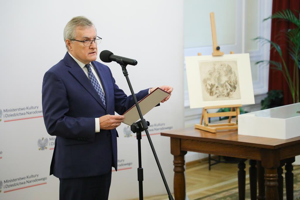 Prezentowany dziś rysunek autorstwa Melchiora Steidla (1657–1727) „Wniebowzięcie Najświętszej Marii Panny” został skradziony w 2005 r. z warszawskiej kolekcji prywatnej. Jest to kolejny obiekt odzyskany dzięki współpracy resortu z Federalnym Biurem Śledczym. Mam okazję podziękować przedstawicielom ambasady Stanów Zjednoczonych. Nie od dzisiaj współpracujemy z FBI i wiele obiektów dzięki tej współpracy wróciło do Polski – podkreślił prof. Piotr Gliński.