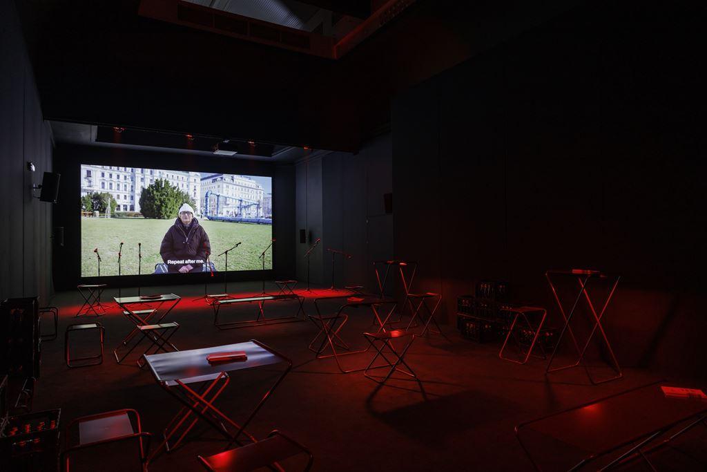 Odpowiedzią na to hasło jest wystawa „Powtarzajcie za mną II” - zbiorowy portret świadków wojny trwającej w Ukrainie prezentowany w formie instalacji przypominającej bar karaoke. Jednak w tym wypadku akompaniamentem nie są znane przeboje, lecz wystrzały, kanonady, wycie i wybuchy, a tekstem — opisy śmiercionośnej broni.
