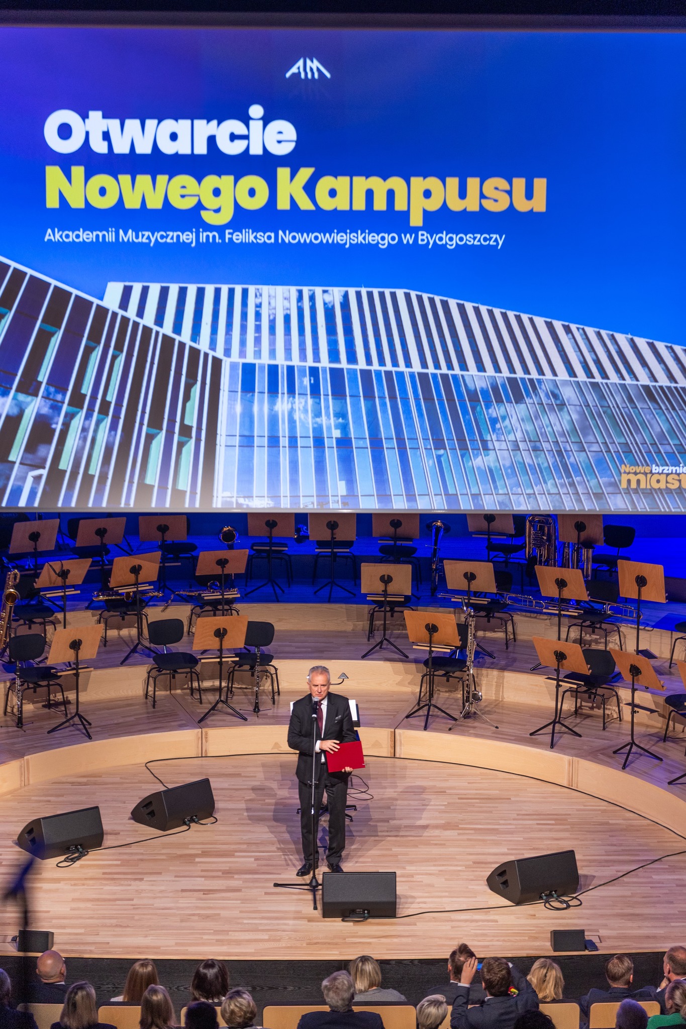 Historia budowy kampusu Akademii Muzycznej w Bydgoszczy sięga 2012 roku. Wówczas uczelnia funkcjonowała w siedmiu rozproszonych i wymagających remontu budynkach, co znacząco utrudniało kształcenie. Dziś, po niemal 5 latach budowy i 13 latach starań, możemy cieszyć się nowoczesnym kampusem – inwestycją niezwykle potrzebną. Jestem przekonany, że uczelnia będzie z niej mądrze korzystać, a w najbliższych latach zobaczymy tego owoce - powiedział Sławomir Rogowski, podsekretarz stanu w Ministerstwie Kultury i Dziedzictwa Narodowego. - Akademia Muzyczna w Bydgoszczy jest jedną z 9 uczelni muzycznych w Polsce. Jej cztery wydziały - Kompozycji, Teorii Muzyki i Reżyserii Dźwięku, Instrumentalny, Wokalno-Aktorski oraz Dyrygentury, Jazzu i Edukacji Muzycznej - posiadają pozytywną opinią Polskiej Komisji Akredytacyjnej. Naszych wyjątkowych uczelni artystycznych zazdrości nam cały świat – dodał.