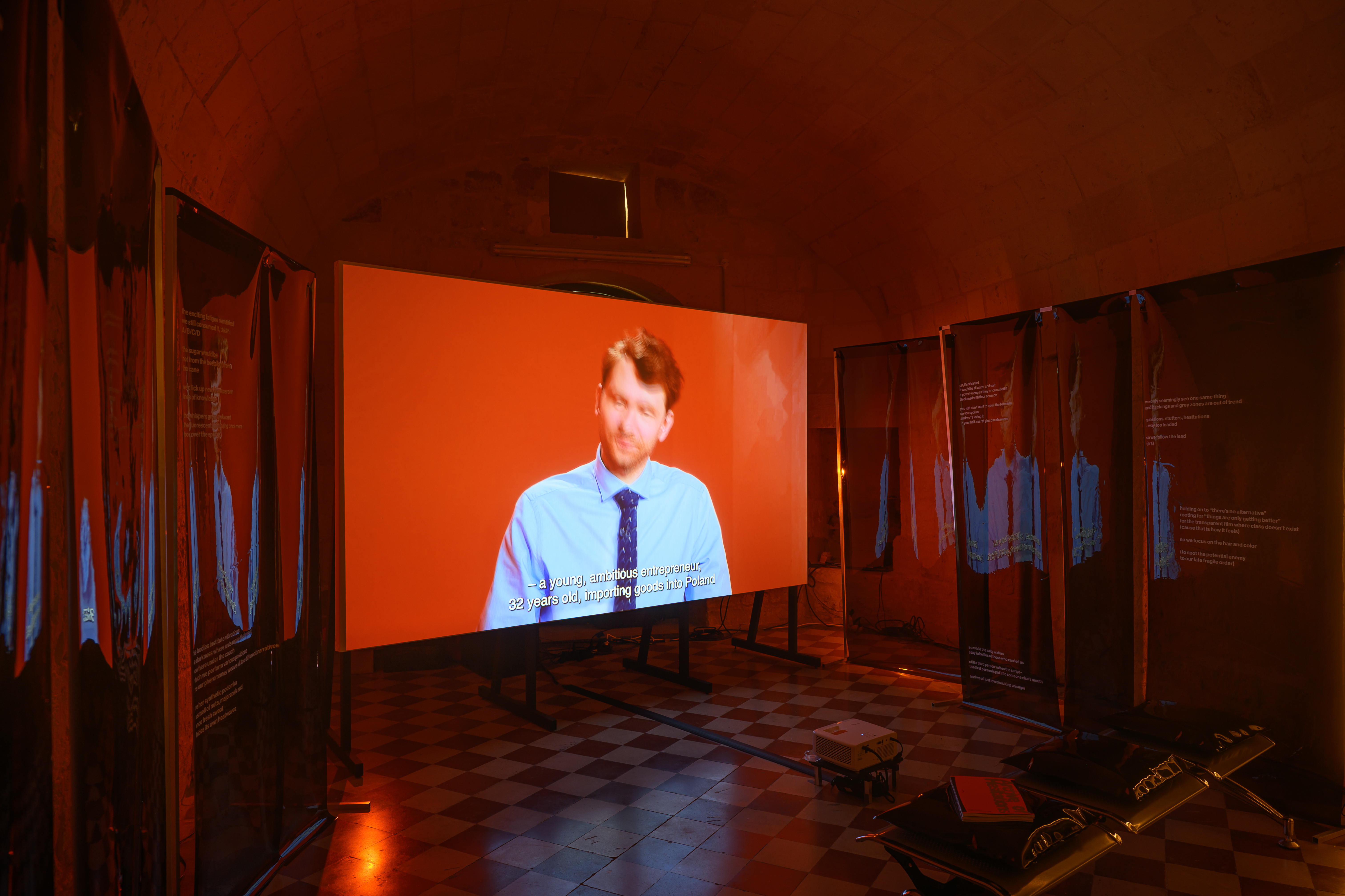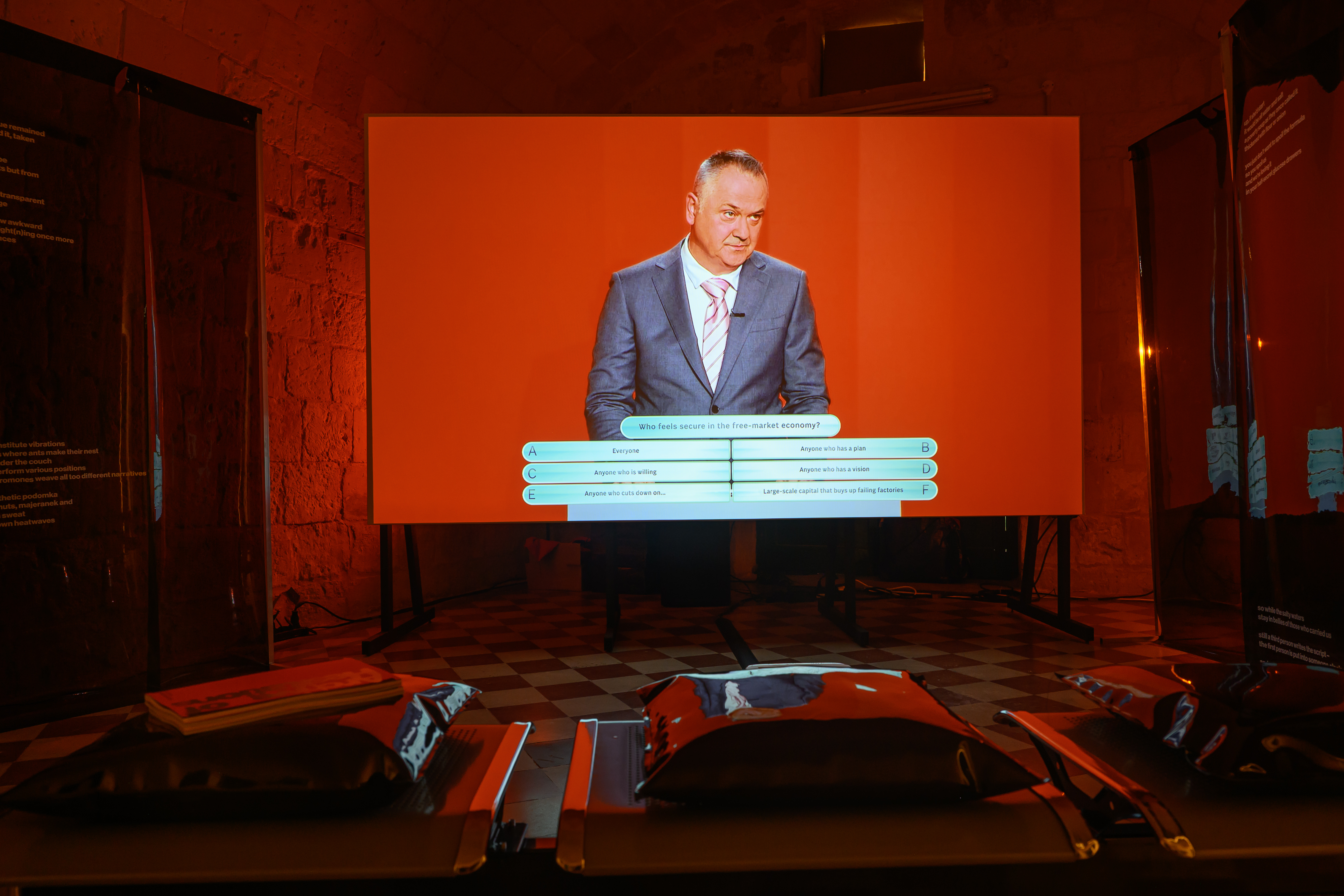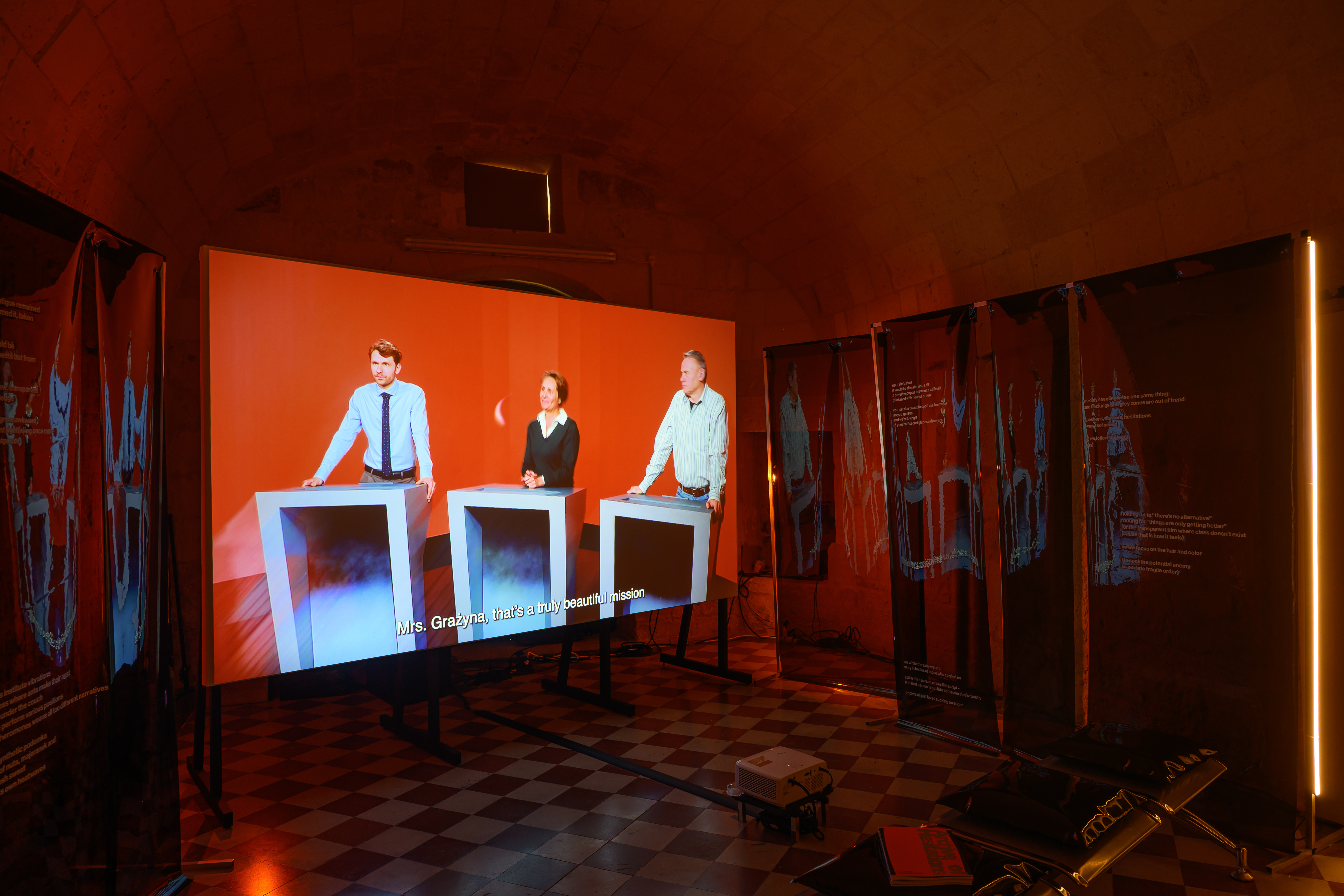 Instalacja składa się z dwóch równoległych projekcji. W pierwszej części oglądamy fikcyjny teleturniej „Everything Is Clear”, w którym występują mechanik, bibliotekarka i młody przedsiębiorca – reprezentanci przekrojowego obrazu polskiego społeczeństwa czasu transformacji. Program celowo prowadzony jest po angielsku – w języku, którym uczestnicy nie posługują się swobodnie. Drugi kanał buduje nielinearny montaż materiałów z Wytwórni Filmów Oświatowych. Sceny codzienności, drobne gesty i detale przedmiotów układają się w spokojny, powtarzalny rytm, stanowiący wyraźny kontrast dla nerwowego tempa teleturnieju. Animacje artystki wizualnej Mili Nowackiej, oparte na pętli sprzężenia zwrotnego, odsłaniają materialność obrazu i wprowadzają element wizualnego zakłócenia. Zestawienie tych dwóch porządków – proceduralnej logiki gry i relacyjnego, fragmentarycznego archiwum – ujawnia napięcie między wiedzą mierzalną a doświadczeniem przeżytym. W świecie nasyconym danymi i natychmiastowymi opiniami „Archiwum wahań” proponuje coś rzadkiego: zatrzymanie. Wahanie nie jest tu oznaką słabości, lecz świadomym gestem sprzeciwu i odpowiedzialności.