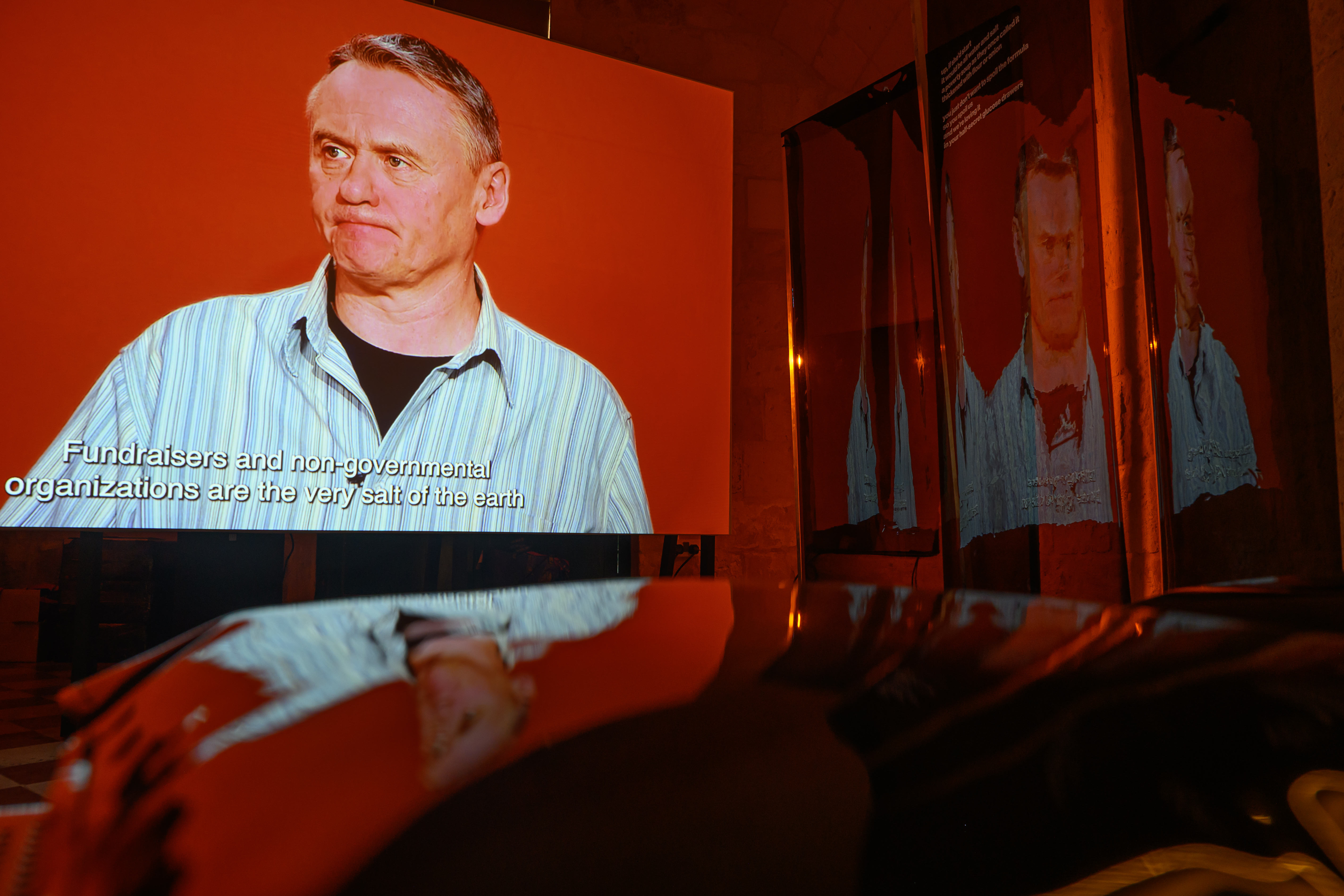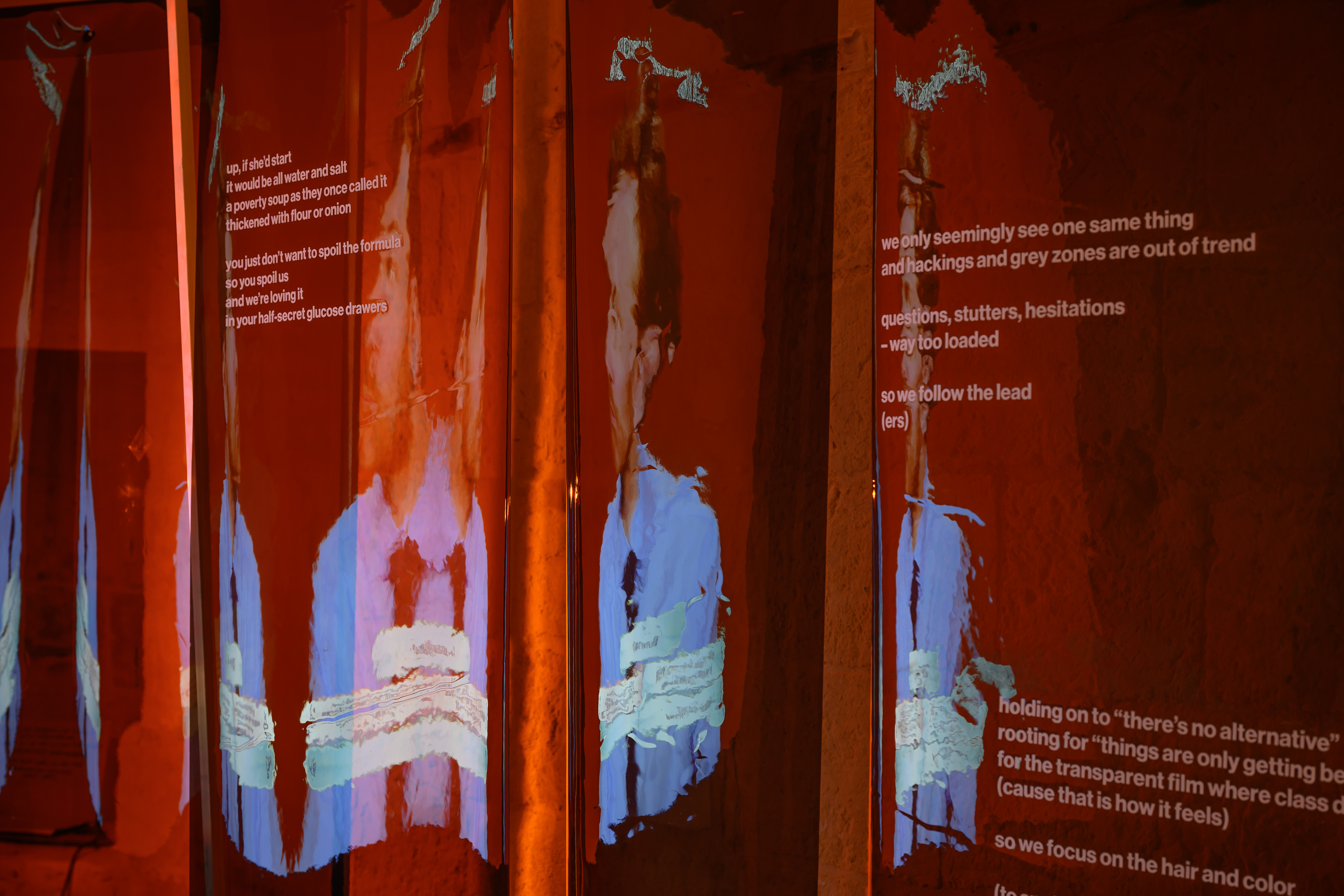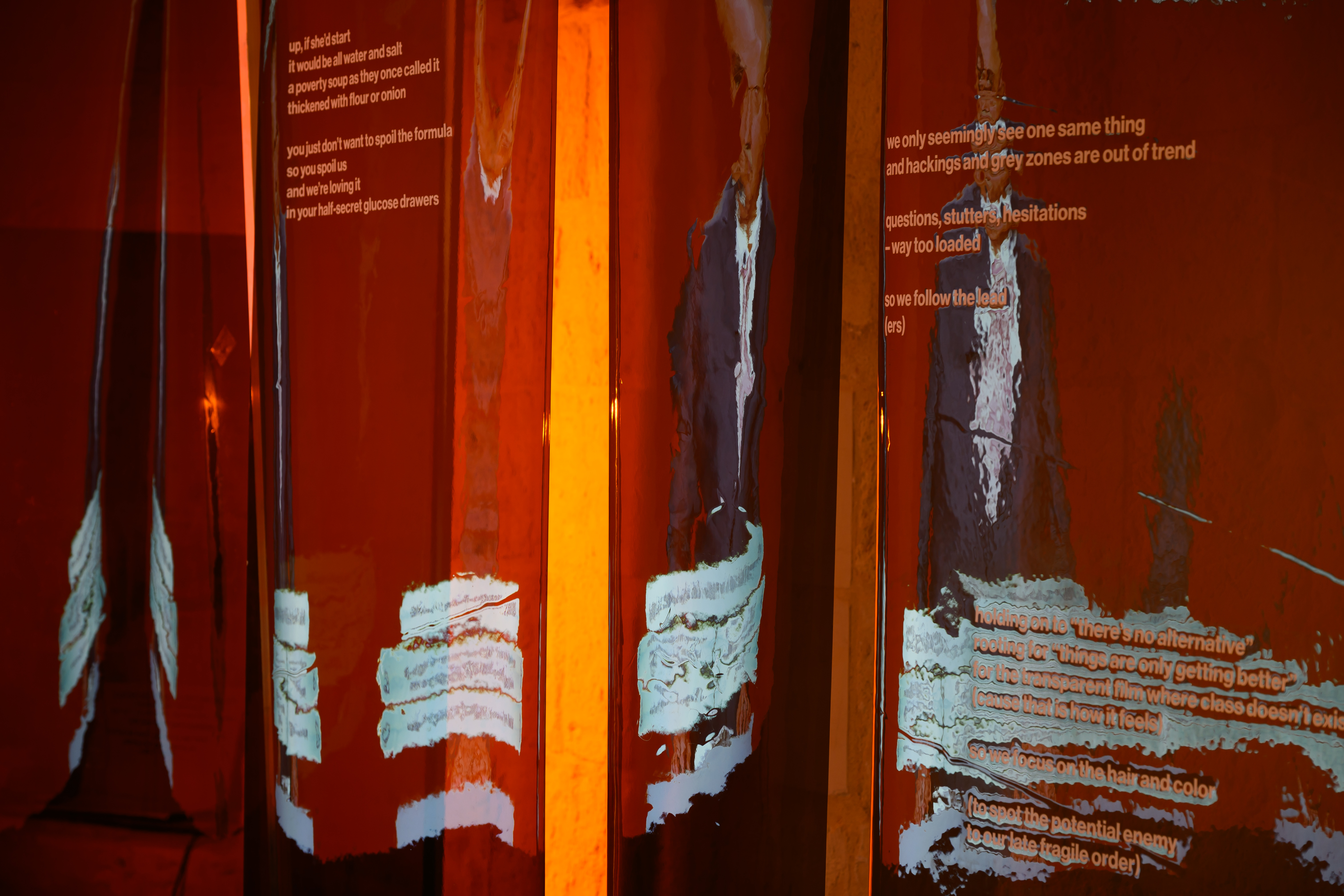 Instalacja składa się z dwóch równoległych projekcji. W pierwszej części oglądamy fikcyjny teleturniej „Everything Is Clear”, w którym występują mechanik, bibliotekarka i młody przedsiębiorca – reprezentanci przekrojowego obrazu polskiego społeczeństwa czasu transformacji. Program celowo prowadzony jest po angielsku – w języku, którym uczestnicy nie posługują się swobodnie. Drugi kanał buduje nielinearny montaż materiałów z Wytwórni Filmów Oświatowych. Sceny codzienności, drobne gesty i detale przedmiotów układają się w spokojny, powtarzalny rytm, stanowiący wyraźny kontrast dla nerwowego tempa teleturnieju. Animacje artystki wizualnej Mili Nowackiej, oparte na pętli sprzężenia zwrotnego, odsłaniają materialność obrazu i wprowadzają element wizualnego zakłócenia. Zestawienie tych dwóch porządków – proceduralnej logiki gry i relacyjnego, fragmentarycznego archiwum – ujawnia napięcie między wiedzą mierzalną a doświadczeniem przeżytym. W świecie nasyconym danymi i natychmiastowymi opiniami „Archiwum wahań” proponuje coś rzadkiego: zatrzymanie. Wahanie nie jest tu oznaką słabości, lecz świadomym gestem sprzeciwu i odpowiedzialności.