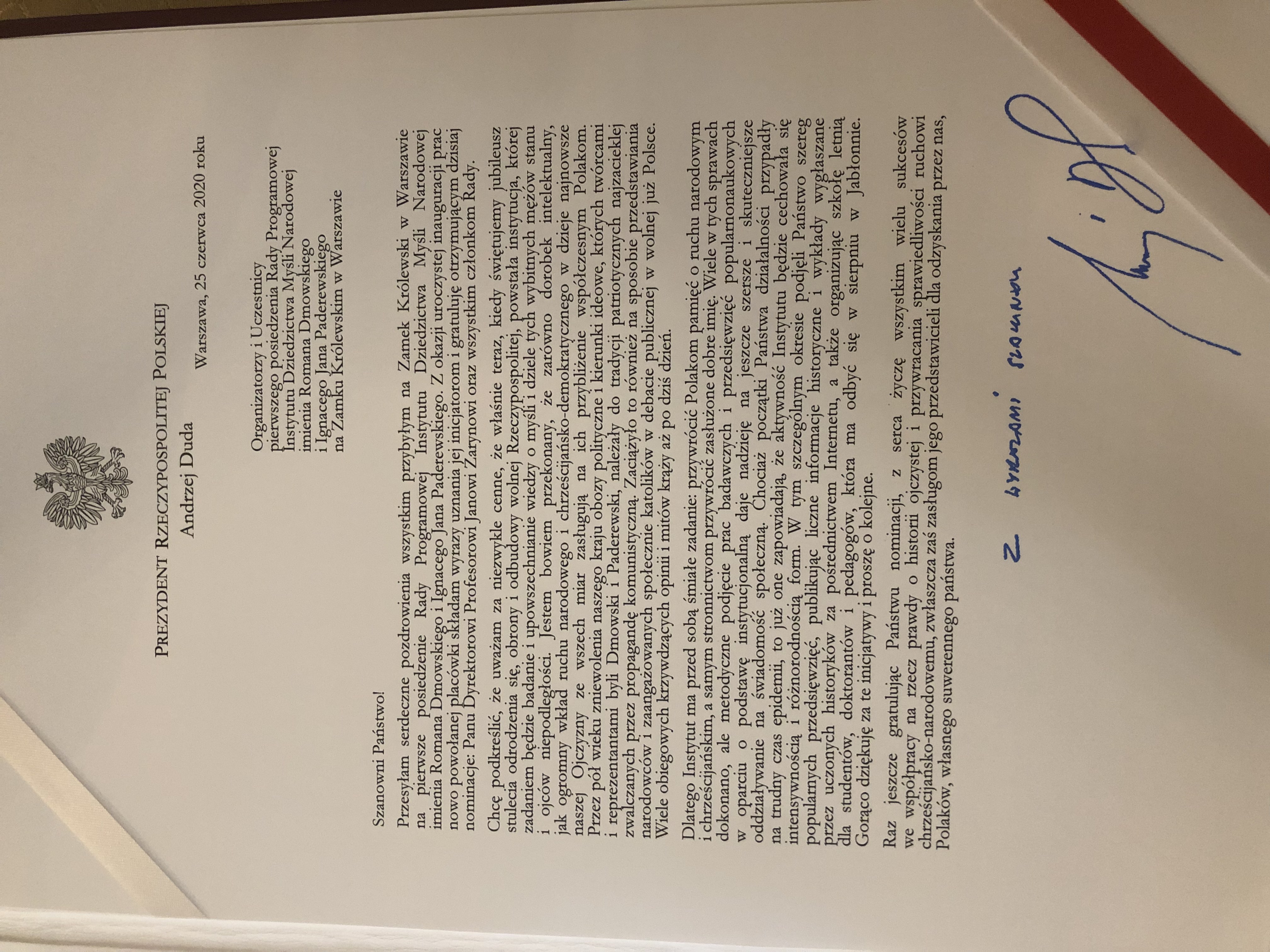 Gratulacje nowo powołanym członkom Rady Programowej przekazał także Prezydent RP Andrzej Duda w liście odczytanym przez sekretarza stanu w Kancelarii Prezydenta Andrzeja Derę. Prezydent podkreślił, że Instytut ma przed sobą śmiałe zadanie przywrócenia Polakom pamięci o ruchu narodowym i chrześcijańskim, a samym stronnictwom przywrócenie zasłużonego dobrego imienia. Dodał także, że uważa za niezwykle cenne powstanie Instytutu, którego zadaniem jest badanie i upowszechnianie wiedzy o myśli i dziele ojców niepodległości w czasie, kiedy świętujemy jubileusz stulecia odrodzenia się, obrony i odbudowy wolnej Rzeczypospolitej.