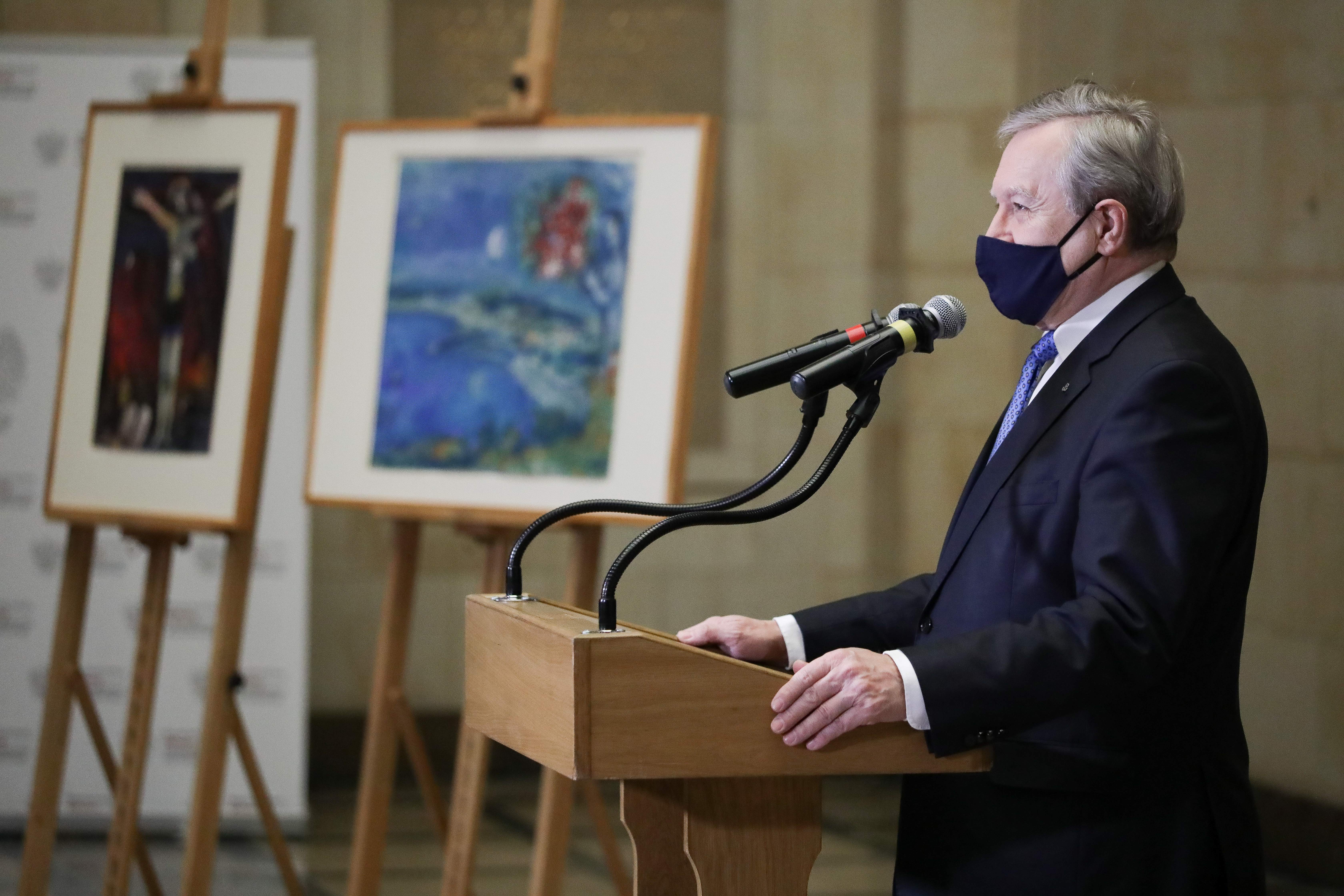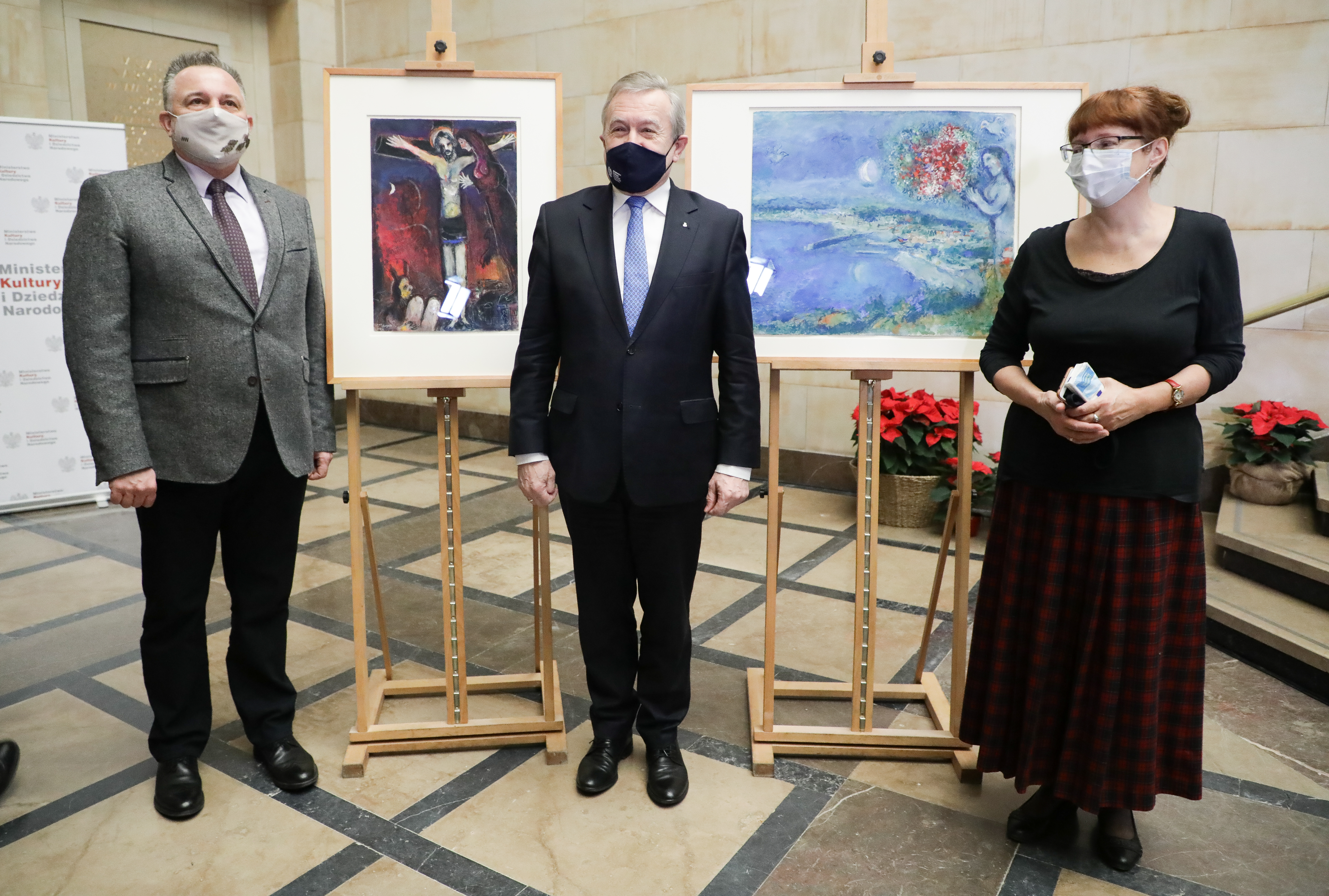 „Do Muzeum Narodowego w Warszawie trafia dziś cały zbiór prac Marca Chagalla. To wyjątkowy zakup - wzbogaciliśmy polskie zbiory muzealne o dzieła z kanonu światowej sztuki XX wieku” – powiedział wicepremier, minister kultury i dziedzictwa narodowego prof. Piotr Gliński podczas konferencji prasowej w Muzeum Narodowym w Warszawie. Unikatowy w skali kraju zbiór 14 kolorowych prac Marca Chagalla (1887–1985), pochodzący z dojrzałego okresu twórczości artysty, zakupiono na międzynarodowej aukcji dzięki dotacji Ministerstwa Kultury i Dziedzictwa Narodowego.