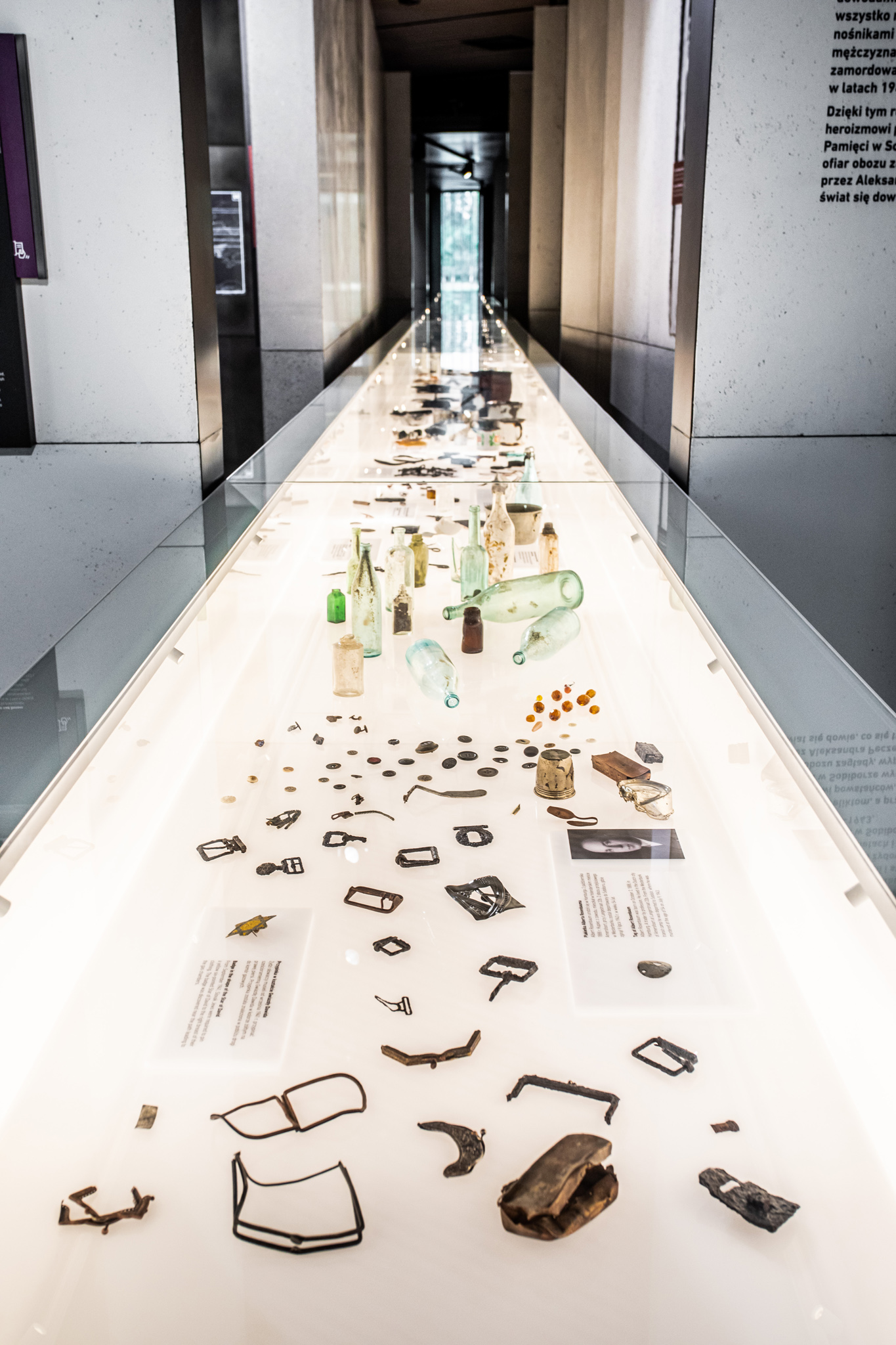 Centralną część przestrzeni ekspozycyjnej stanowi dwudziestopięciometrowa gablota. Za szybą, w jej mlecznobiałym wnętrzu przywodzącym na myśl laboratorium, zgromadzono ponad 700 obiektów. Są to głównie rzeczy należące do zgładzonych: biżuteria, klucze, okulary, fragmenty ubrań, przybory piśmiennicze – niektóre można przypisać konkretnym osobom, większość jednak stanowi archiwum anonimowych świadectw śmierci. Przedmioty te opowiadają własną historię, tworzą równoległą narrację, pozwalającą widzowi na konfrontację z dualizmem Zagłady: jej przekraczającą wyobraźnię masowością i indywidualnym doświadczeniem śmierci. Ich kumulacja działa przytłaczająco – są jak kamienie pobliskiej polany mogił symbolizujące mnogość ofiar. Jednak na każdy z nich można też spojrzeć osobno – pełen znaczenia drobiazg uruchamia wyobraźnię, która w tym małym fragmencie pozwala poczuć głębię indywidualnej tragedii. Na taki bezpośredni, wręcz osobisty kontakt pozwalają także oddzielne, niewielkie gabloty wmurowane w ściany. Umieszczone w nich artefakty – zegarek, który się zatrzymał, dziecięca zabawka – reprezentują losy pojedynczych osób. Ten ludzki wymiar wystawy wydaje się najważniejszy.