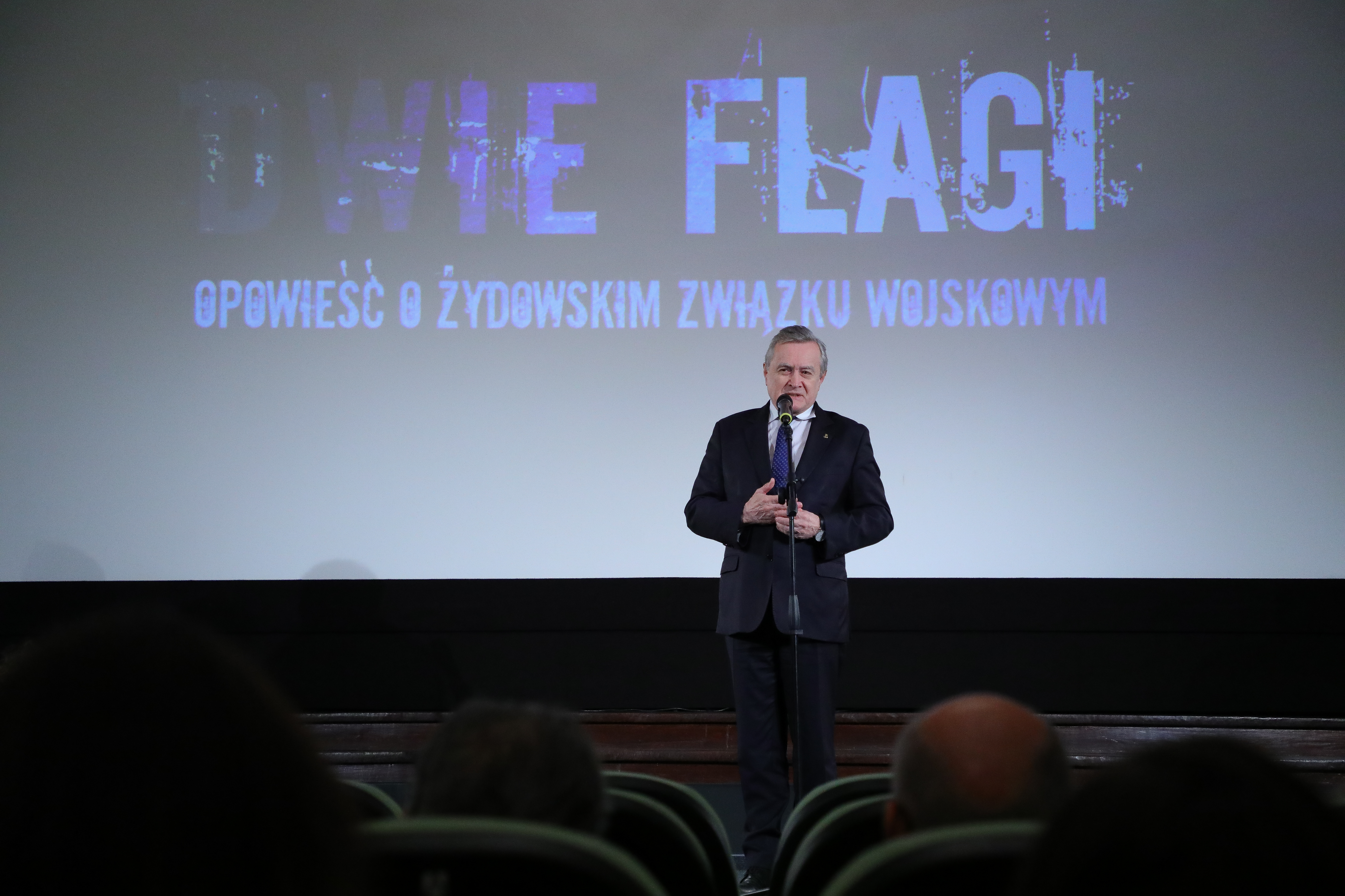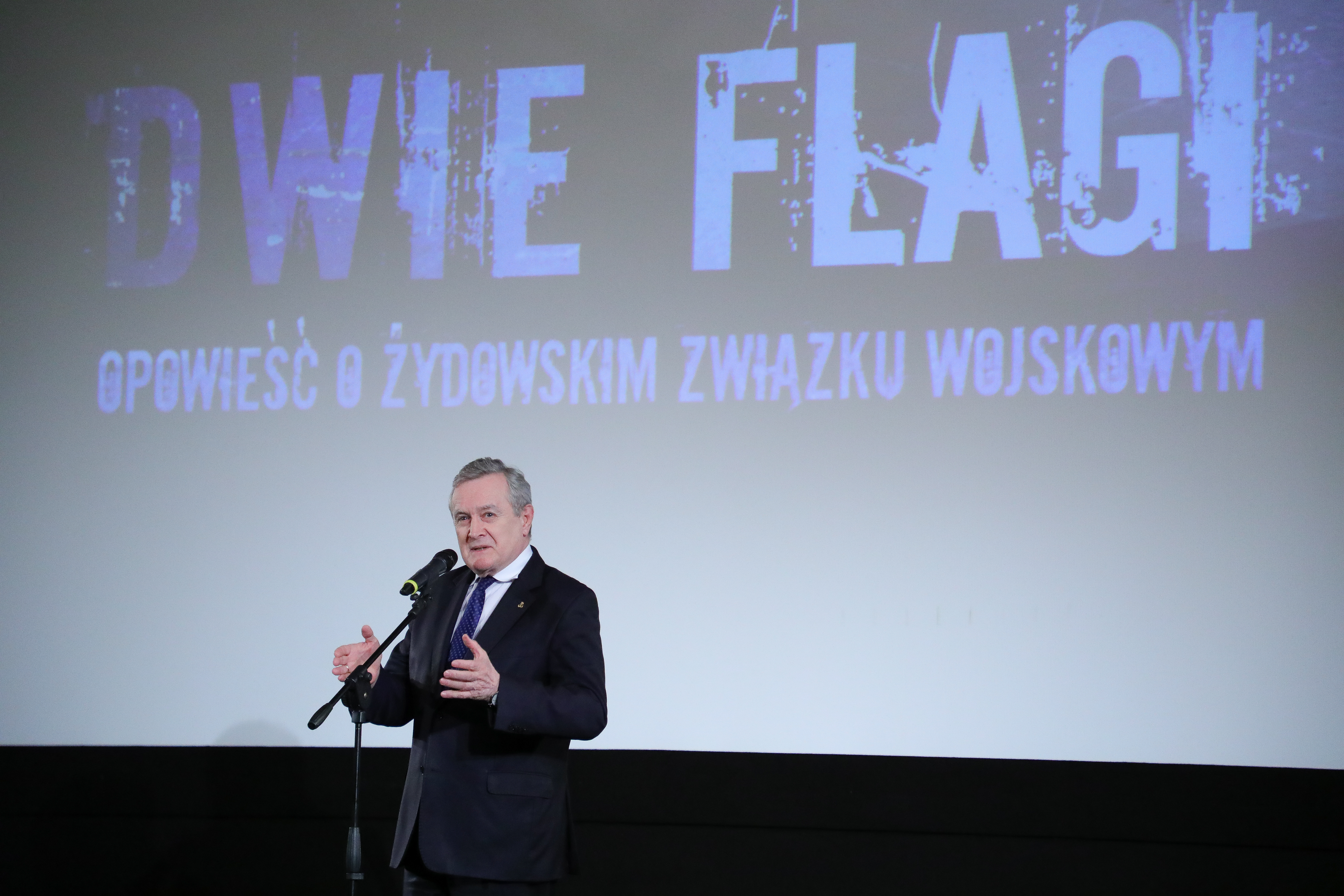„Prezentujemy kolejne dzieło filmowe, które przeciwstawia się zapomnieniu i zepchnięciu na margines bardzo ważnego tematu. Wsparcie realizacji tego typu produkcji to wypełnianie obowiązków, jakie spoczywają na instytucjach zajmujących się dziedzictwem i historią” - powiedział wicepremier, minister kultury i dziedzictwa narodowego prof. Piotr Gliński podczas uroczystej premiery filmu „Dwie Flagi. Opowieść o Żydowskim Związku Wojskowym” w reż. Jolanty Kessler, która odbyła się w poniedziałek w warszawskim Kinie Kultura. Film ukazuje historię mało znanej organizacji wojskowej, która stanowiła największą siłą bojową w getcie warszawskim, m.in. dzięki kontaktom z polskim podziemiem niepodległościowym.