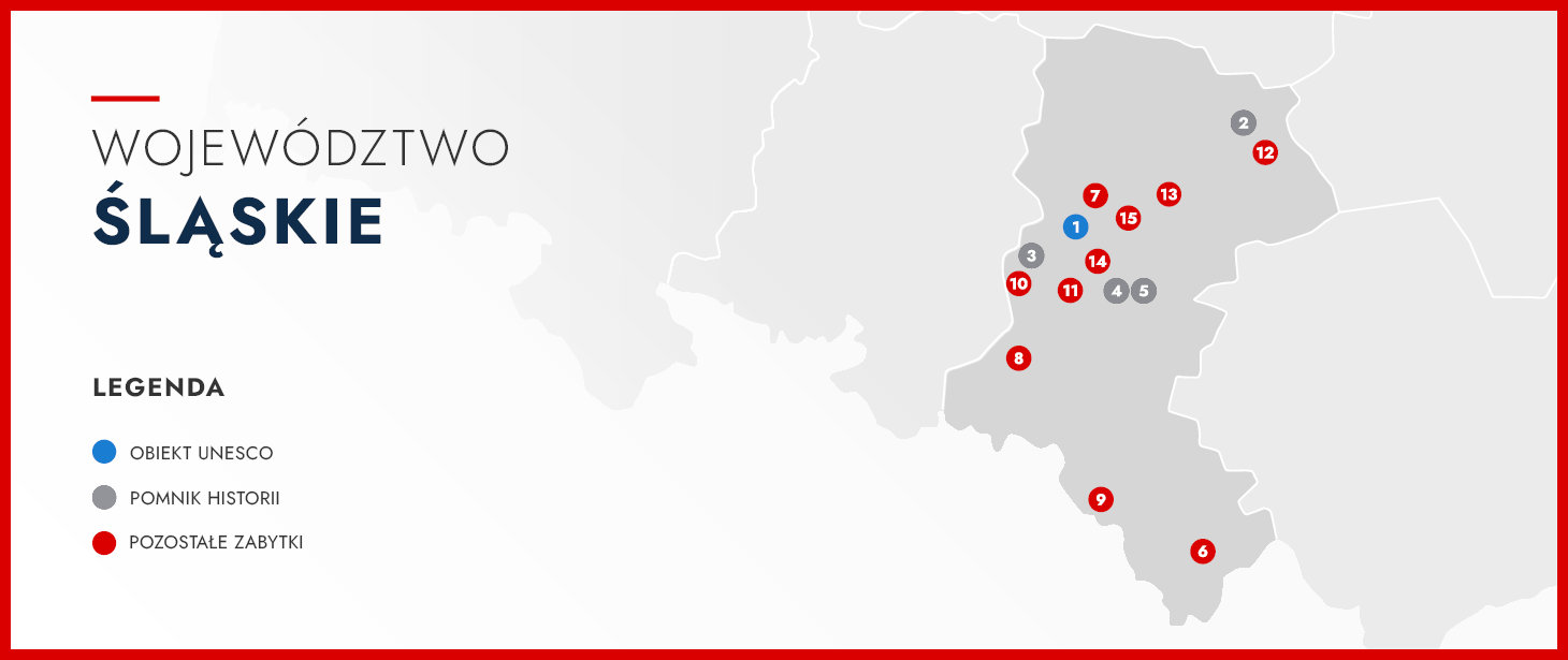 Obszar województwa śląskiego charakteryzuje się zróżnicowanym zasobem zabytków, co wynika z uwarunkowań historycznych i usytuowania na pograniczu regionów – Górnego Śląska i Małopolski. Najstarsze zabytki związane ze śladami bytności człowieka pochodzą z paleolitu i zlokalizowane są w jaskiniach Jury Krakowsko-Częstochowskiej oraz na przedpolu Bramy Morawskiej. Nie brak też stanowisk z epoki neolitu, brązu i żelaza; śladów bytności Celtów, osadnictwa słowiańskiego i kultury przeworskiej z okresu wpływów rzymskich. Większość zachowanych do dziś historycznych układów miejskich, ruiny zamków jurajskich czy tak znaczące obiekty, jak np. klasztor cystersów w Rudach są dziedzictwem epoki Piastów. Z wieków nowożytnych pochodzi m.in. większość z ponad 60 drewnianych kościołów oraz wiele przekształconych później świątyń, klasztorów i założeń rezydencjonalnych. Dziedzictwem epoki industrializacji są zabytki techniki związane z przemysłem wydobywczym, ciężkim i włókienniczym, kilkaset osiedli patronackich oraz ośrodki miejskie z wielkomiejską zabudową mieszkalną, sakralną, użyteczności publicznej i rezydencjonalną. Interesującym etapem, widocznym przede wszystkim w krajobrazie śląskich miast, jest okres dwudziestolecia międzywojennego, tj. czas podziału Górnego Śląska pomiędzy rywalizujące ze sobą państwa, czyli II RP i Republikę Weimarską, czego materialnym świadectwem są cenne modernistyczne gmachy użyteczności publicznej i zespoły mieszkaniowe.