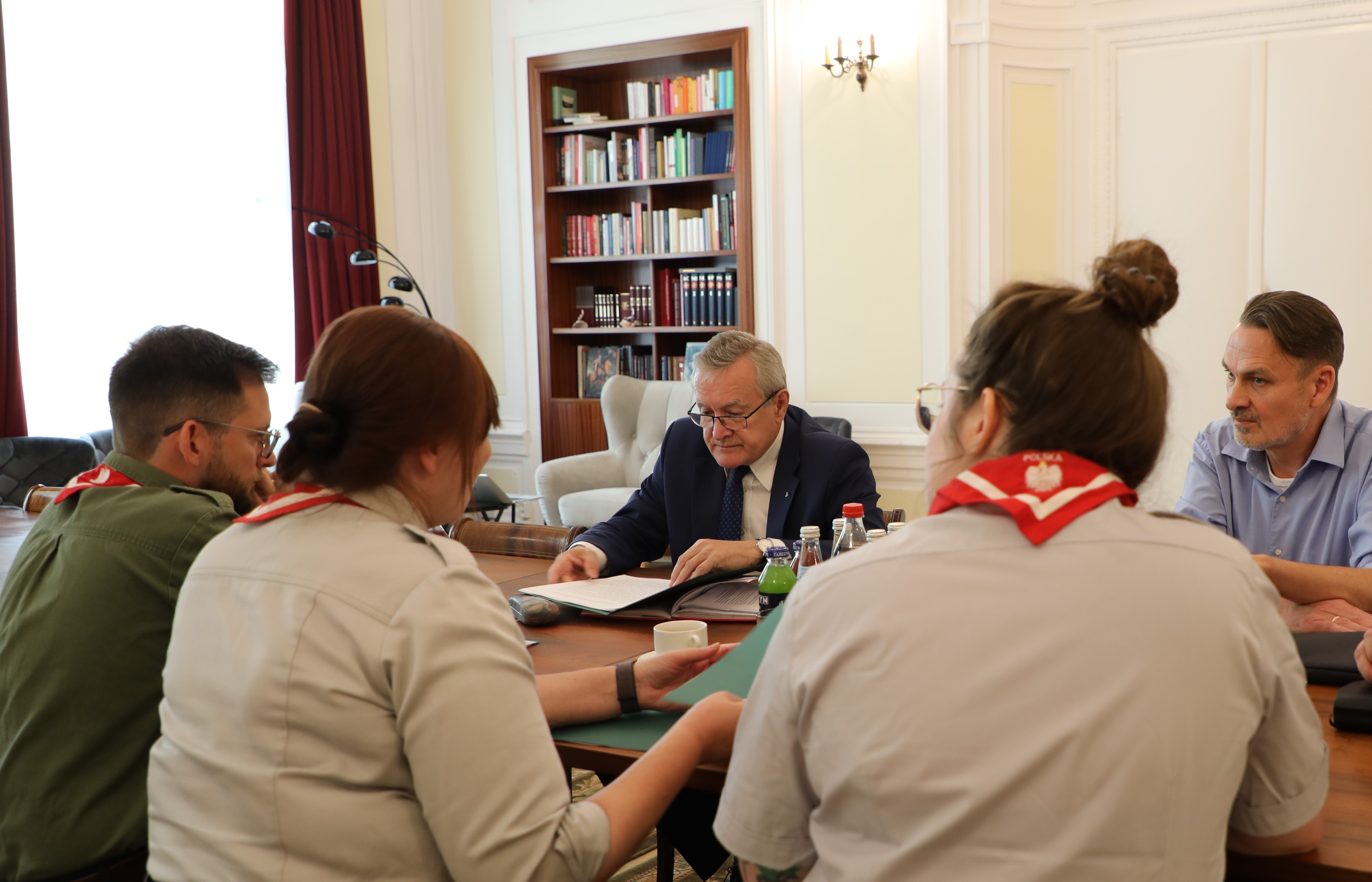 Minister kultury i dziedzictwa narodowego prof. Piotr Gliński spotkał się wczoraj z przedstawicielami Związku Harcerstwa Polskiego pod przewodnictwem naczelnik Martyny Kowackiej. Podczas spotkania harcerze zaprosili ministra, który – jako przewodniczący Komitetu ds. Pożytku Publicznego – czynnie wspiera organizacje harcerskie w ramach Rządowego Programu Wspierania Rozwoju Organizacji Harcerskich i Skautowych na lata 2018-2030, do udziału w XXV Światowym Jamboree Skautowym. Tegoroczny zlot harcerzy odbędzie się w dniach od 1 do 12 sierpnia w SaeManGeum (Jeollabuk-do) w Korei Południowej.