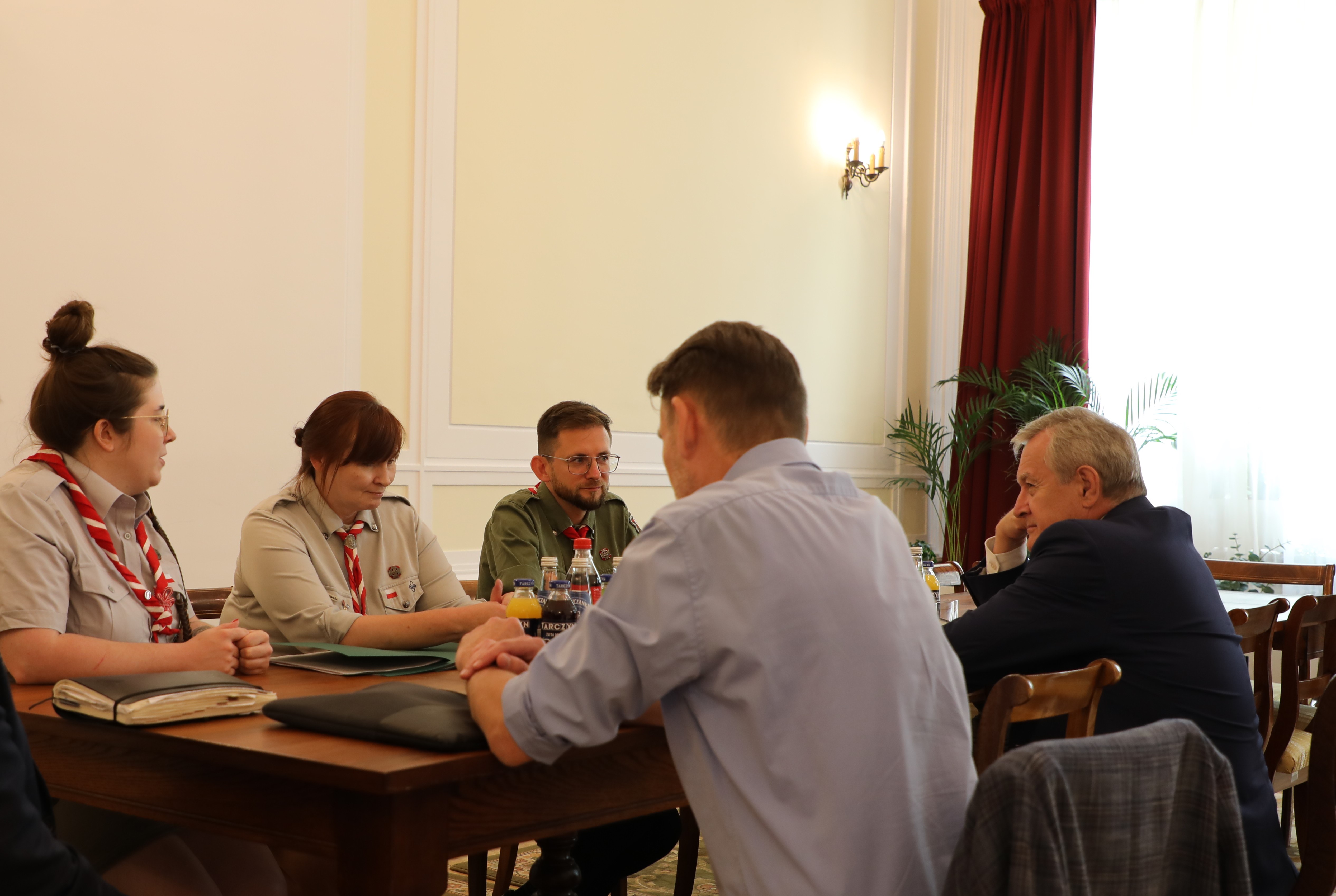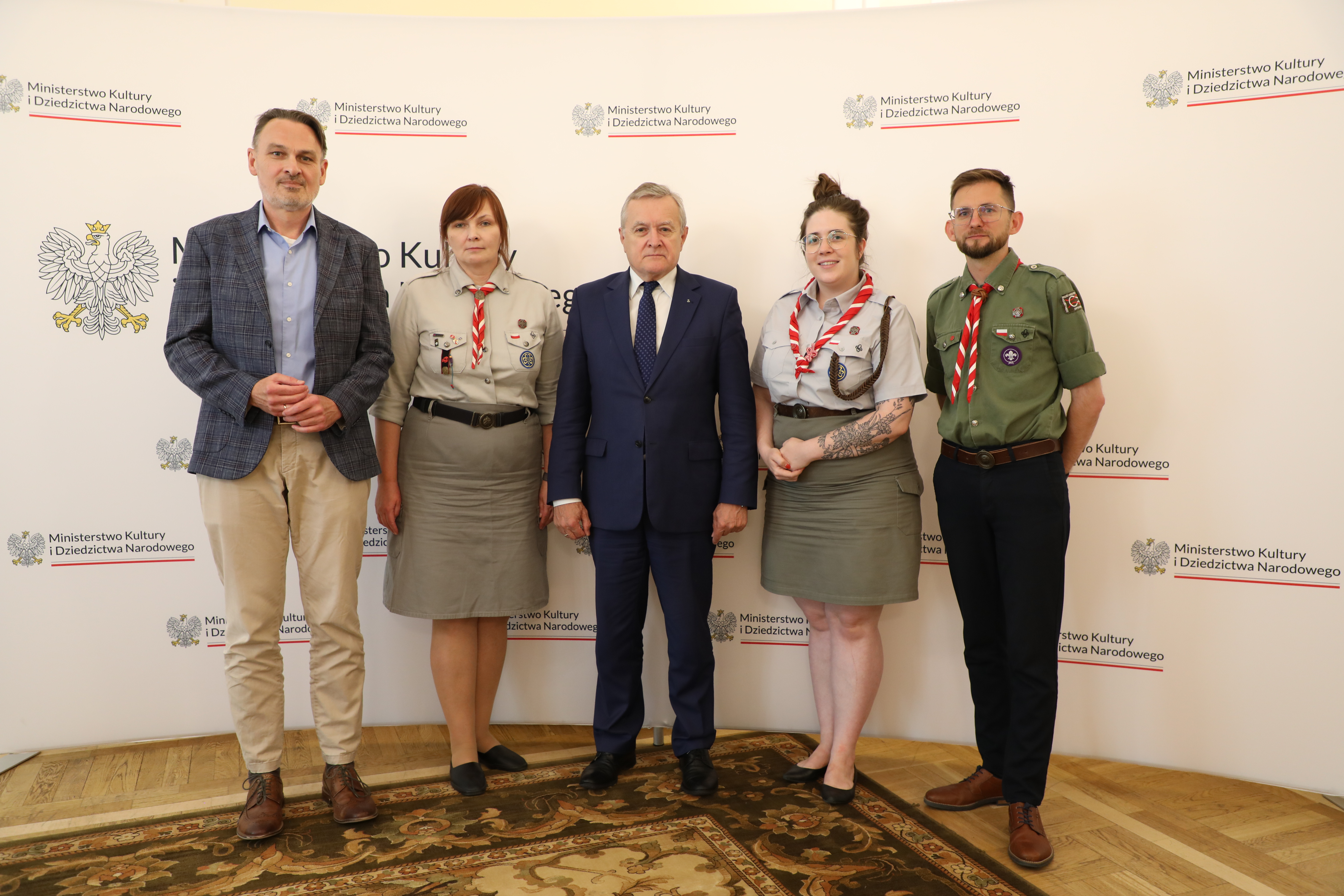 Harcerze przekazali ministrowi Piotrowi Glińskiemu informację o reprezentacji organizacji harcerskich ZHP, ZHR i Leśnej Szkółki na XXV Światowym Jamboree Skautowym, w którym łącznie weźmie udział prawie 600 harcerzy Polski.