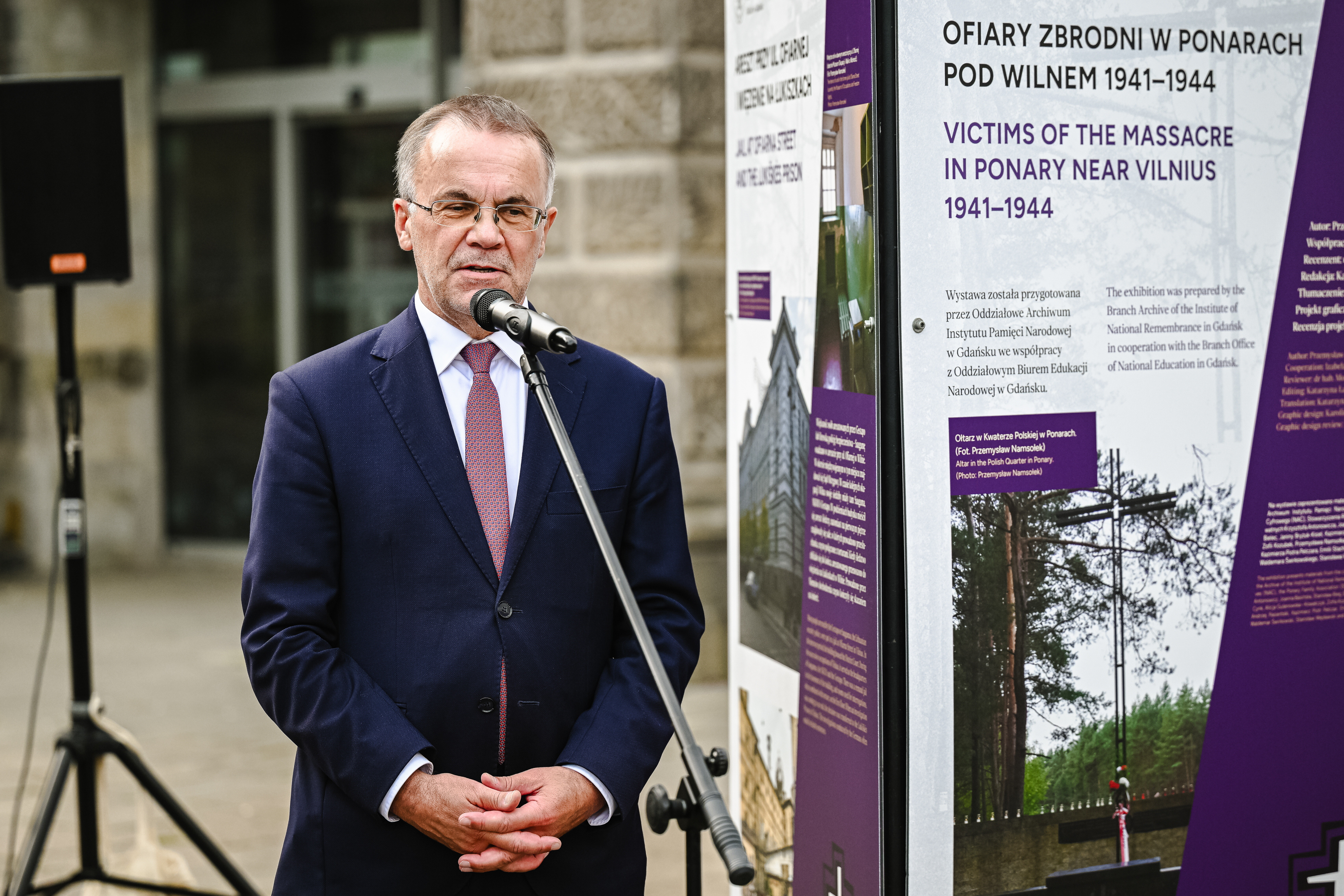 „Historycy do dzisiaj próbują oszacować dokładną liczbę ofiar zbrodni w Ponarach, której dokonywali niemieccy okupanci wraz z litewskimi oddziałami pomocniczymi, szaulisami. Szacunki mówią o co najmniej 80 tys. ofiar. Przypominamy ich również dlatego, bo w przeważającej części byli przed 1939 rokiem obywatelami polskimi” – powiedział wiceminister kultury i dziedzictwa narodowego dr Jarosław Sellin podczas wernisażu wystawy „Ofiary zbrodni w Ponarach pod Wilnem 1941-1944”, który odbył się dziś na Targu Węglowym w Gdańsku. Wystawę można zwiedzać do 29 września 2023 r.