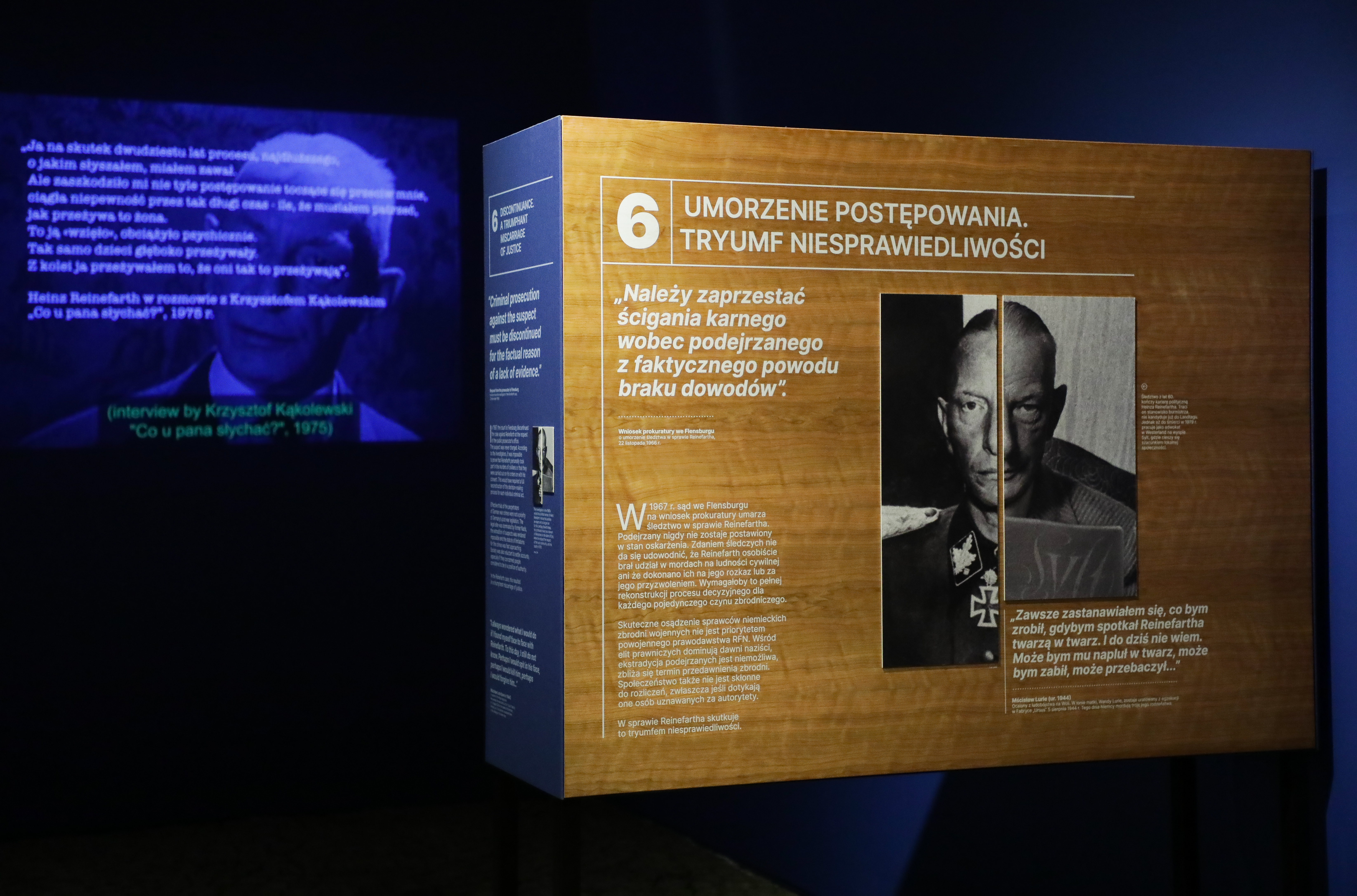 Na wystawie po raz pierwszy prezentowany jest niepublikowany dotąd w Polsce wywiad z Heinzem Reinefarthem, przeprowadzony przez telewizję niemiecką w 1964 r. Zbrodniarz posługuje się w nim tymi samymi argumentami i usprawiedliwieniami, które zapewniły mu bezkarność. Zestawiony z ujęciami filmowymi z wyspy Sylt oraz wypowiedziami Reinefartha ze słynnej rozmowy z Krzysztofem Kąkolewskim, materiał oddaje atmosferę, w której główny sprawca ludobójstwa na Woli spędził resztę życia w popularnym kurorcie nad Morzem Północnym.