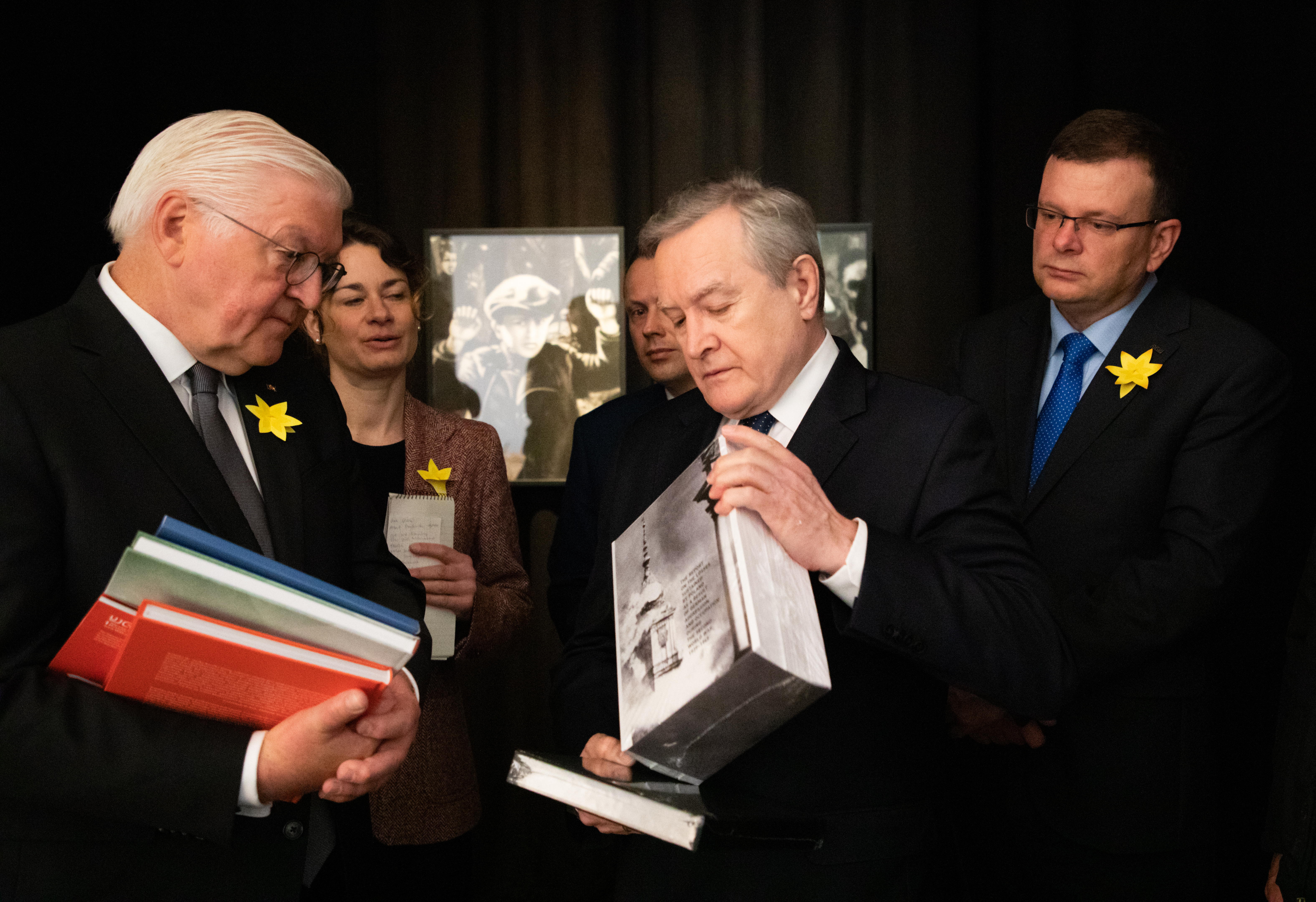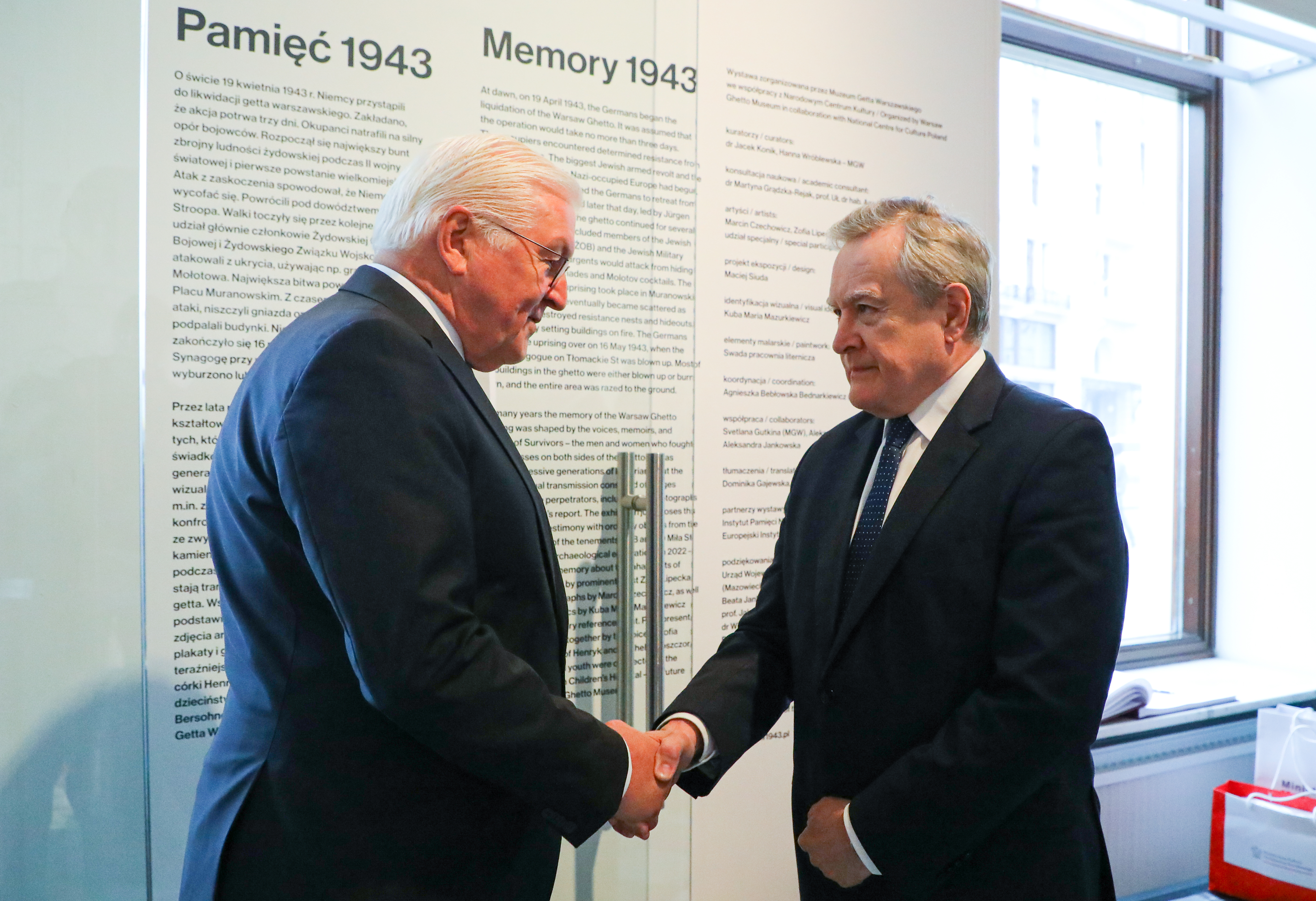„Przekazuję panu prezydentowi pełną angielskojęzyczną wersję raportu poświęconą polskim stratom poniesionym w wyniku agresji i okupacji niemieckiej w czasie II wojny światowej. Liczymy na podjęcie dialogu dla dobra Europy, naszej przyszłości i przyjaźni miedzy naszymi narodami” – powiedział wicepremier prof. Piotr Gliński podczas spotkania z prezydentem Niemiec Frankiem-Walterem Steinmeierem z okazji 80. rocznicy wybuchu Powstania w Getcie Warszawskim. Minister kultury i dziedzictwa narodowego wraz z prezydentem Niemiec zwiedzili wystawę „Pamięć 1943” w Kordegardzie – galerii Narodowego Centrum Kultury.