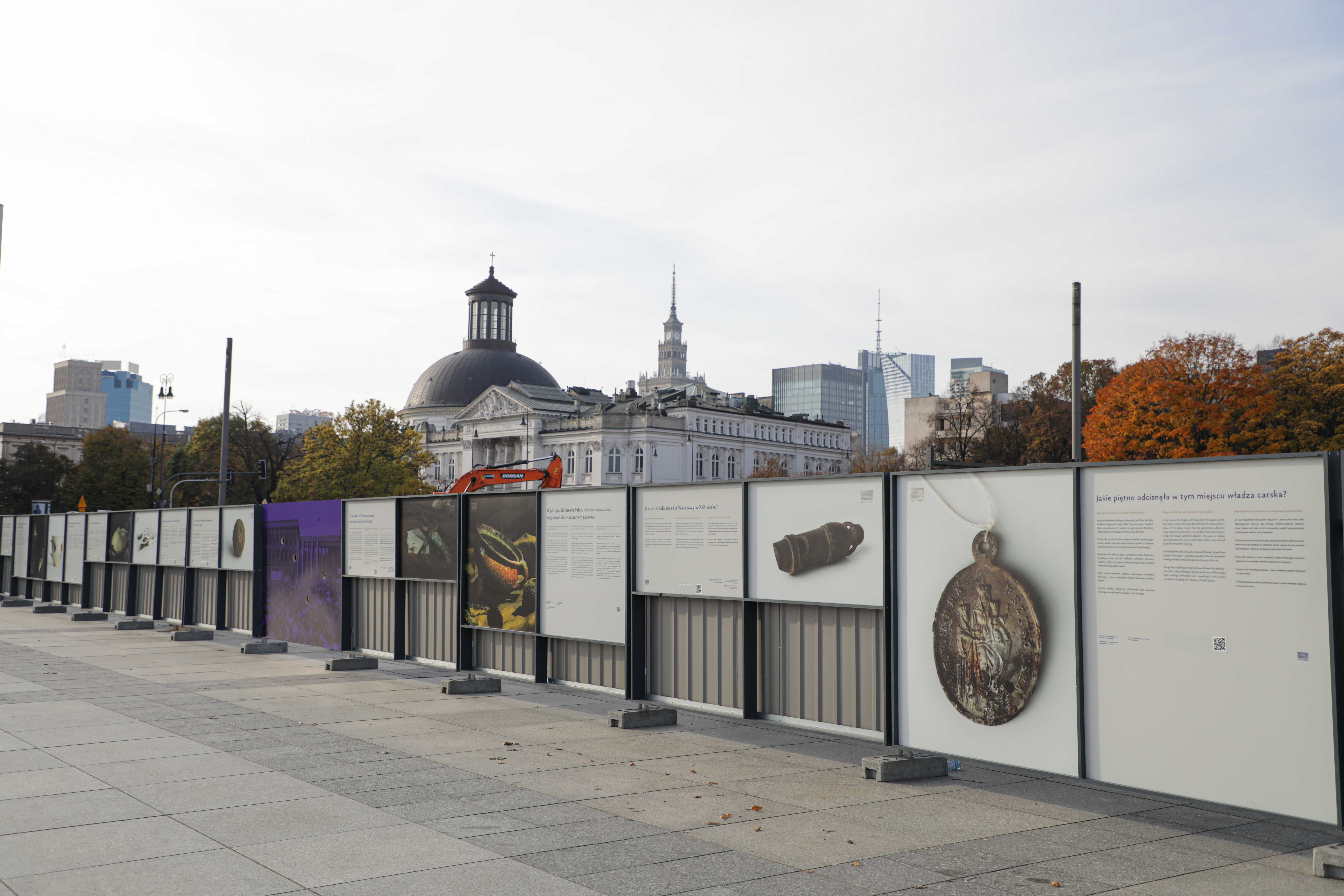 Wystawa „Okruchy przeszłości” jest prezentowana na ogrodzeniu terenu inwestycji dotyczącej odbudowy Pałacu Saskiego, Pałacu Brühla oraz kamienic przy ul. Królewskiej w Warszawie. Składa się z wielkoformatowych plansz prezentujących artefakty wydobyte podczas prac archeologicznych, które prowadzone były pod dawnym Pałacem Saskim w latach 2006-2008. Są to przede wszystkim przedmioty codziennego użytku, które zostały odnalezione podczas prac wykopaliskowych. Zdjęciom towarzyszy opowieść o historii zabudowań zachodniej pierzei Placu Piłsudskiego – roli Pałacu Saskiego na przestrzeni dziejów, burzliwym przemianom społecznym i gospodarczym, jakie przetoczyły się przez ziemie polskie, a także symbolicznemu znaczeniu tego fragmentu Warszawy.