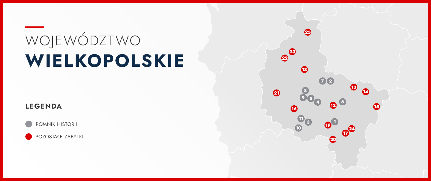 W województwie wielkopolskim zawarte są co najmniej trzy wyróżniające się przestrzenie historyczno-kulturowe, których odmienność objawia się w występujących na ich terenie zabytkach. Pierwszym z nich są ziemie związane z początkami państwa polskiego, które po rozbiorach znalazły się pod władaniem Prus, w późniejszym okresie stanowiąc zachodnie kresy II Rzeczpospolitej. Charakterystyczna dla nich jest liczna obecność architektury murowanej, dokumentującej ciągłość stylów architektonicznych od epoki romańskiej do modernizmu, z dominacją obiektów sakralnych, rezydencjonalnych i folwarcznych oraz dziedzictwem przemysłu i techniki.