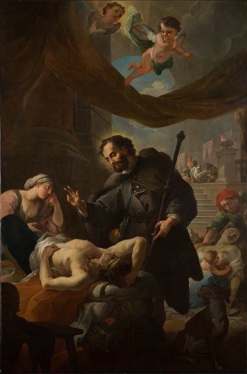 W centrum obrazu widzimy postać świętego Rocha odwiedzającego chorych. Jeden z nich, młody człowiek namalowany w śmiałym skrócie perspektywicznym na pierwszym planie, jest już zapewne umierający. Opłakuje go kobieta, która spogląda na świętego Rocha w nadziei na cudowne uzdrowienie. Przy prawej krawędzi obrazu mężczyzna w czerwonym berecie unosi pozbawione życia, szare ciało kobiety, które wymownie kontrastuje z pulchnym i pełnym życia, przytulającym się do niej dzieckiem. Jeśli przyjrzymy się uważnie, zobaczymy, że wokół dłoni kobiety opleciony jest różaniec. Czy wobec tego i dla niej jest szansa na uzdrowienie?