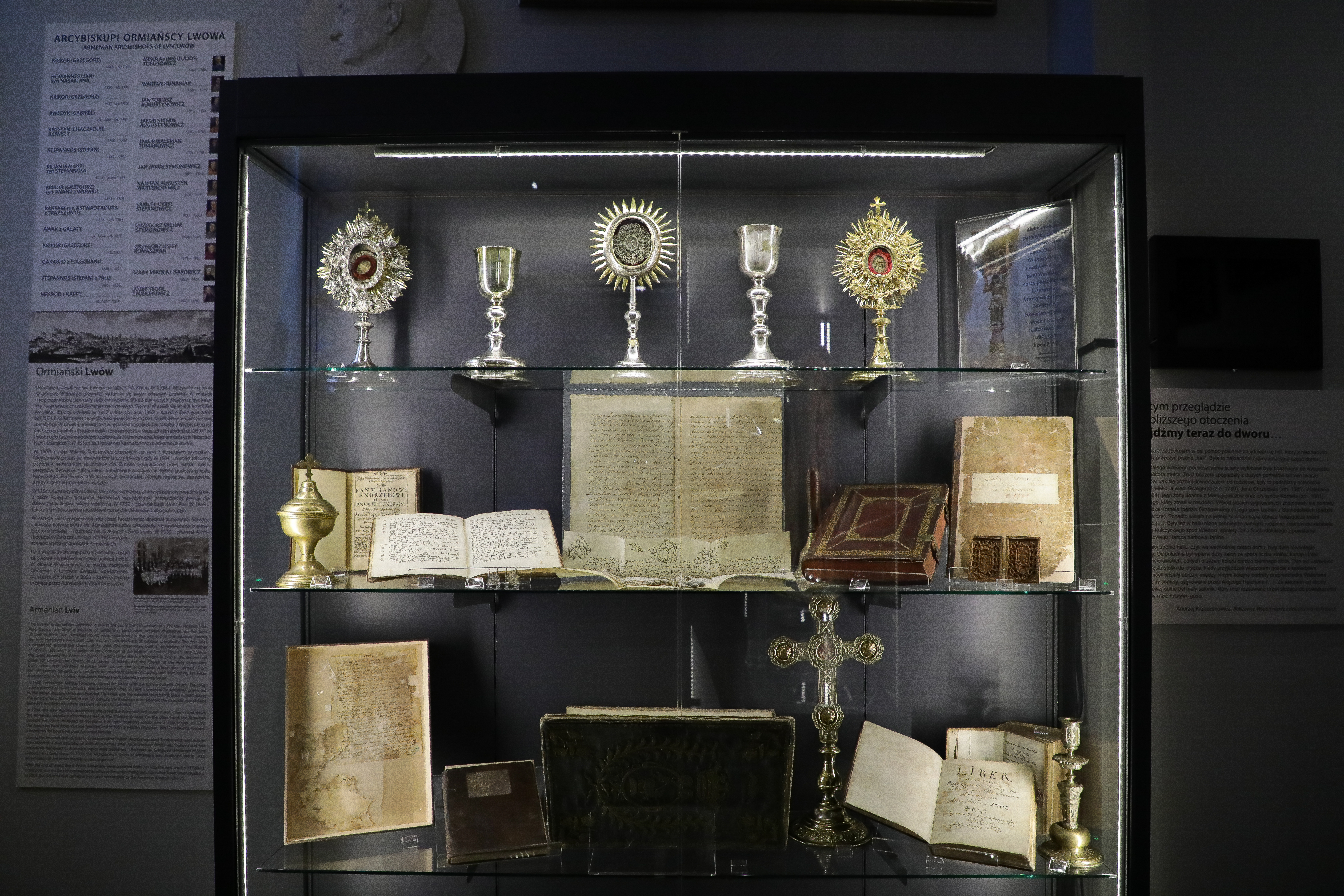 Na wystawie zaprezentowane zostały najważniejsze wydarzenia oraz postaci historyczne zilustrowane odpowiednio dobranymi eksponatami, oraz obrządek ormiański. Zaprezentowano m.in. unikatowe rękopisy, starodruki, kolekcję portretów ksień benedyktynek ormiańskich ze Lwowa, zabytkowe szaty i naczynia liturgiczne. Można także zapoznać się z historią polskich Ormian i ich życiem codziennym.