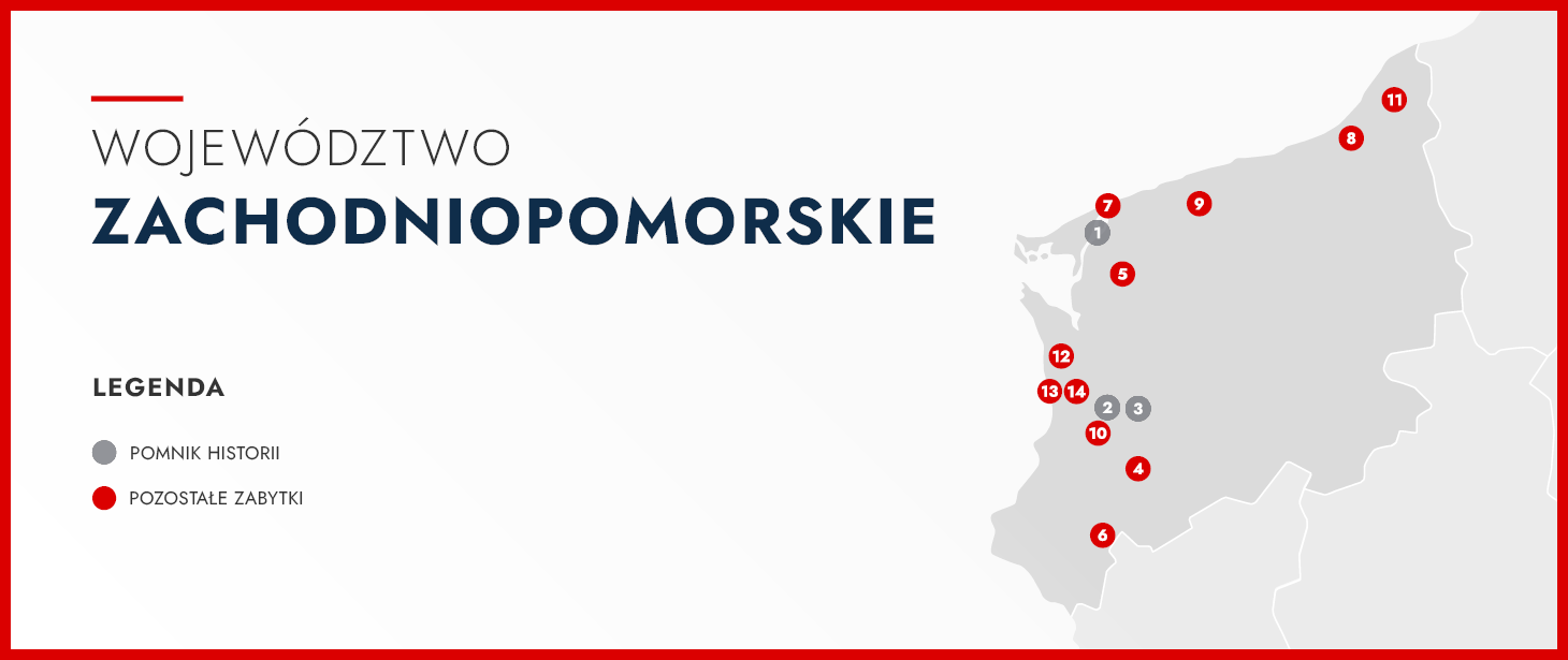 Pomorze Zachodnie to obszar często postrzegany przez pryzmat zespołów rezydencjonalno-parkowo-folwarcznych, kojarzonych po 1945 r. z PGR-ami. Wśród rezydencji występują obiekty z różnych okresów i stylów, od gotyckich (skrzydło w Pęzinie), przez renesansowe (np. w Tucznie), po barokowe (np. w Siemczynie) i klasycystyczne (np. w Przelewicach); najmłodsze mają formy neostylowe (np. w Otoku). W krajobrazie województwa wyróżniają się również średniowieczne zespoły zabudowy obronnej oraz zamki z historycznymi nawarstwieniami czy znaczna liczba obiektów przemysłowych. Swoistym wyróżnikiem regionu jest jednak architektura szkieletowa (ryglowa), która charakteryzuje się bogactwem form i typów zabudowy, będących wynikiem różnorodności krajobrazu, gospodarki, kultury oraz burzliwych dziejów historyczno-politycznych.