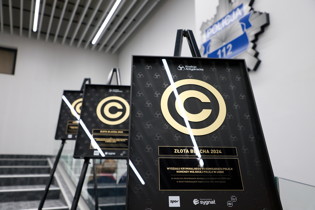 Koalicja Antypiracka uhonorowała „Złotymi Blachami” policjantki i policjantów, którzy w minionym roku dzięki swojej wiedzy eksperckiej i dociekliwości osiągnęli szczególne sukcesy w walce z piractwem internetowym. Wyróżnieni zostali funkcjonariusze z jednostek Policji w Chrzanowie, Łodzi i Nowym Targu. Nagrody wręczył Maciej Wróbel, sekretarz stanu w Ministerstwie Kultury i Dziedzictwa Narodowego podczas uroczystości w Komendzie Głównej Policji w Warszawie 13 marca 2025 r.