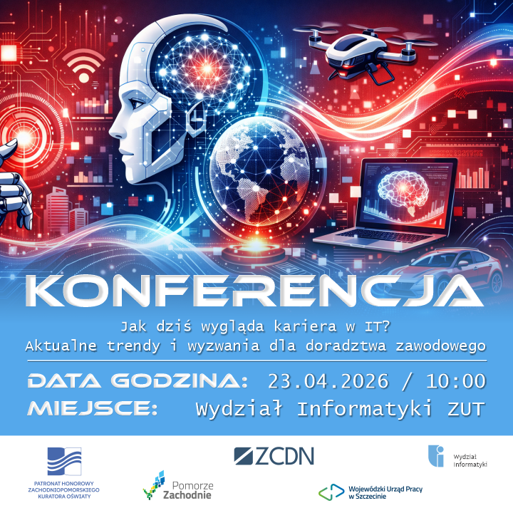 Zachodniopomorskie Centrum Doskonalenia Nauczycieli, Wydział Informatyki Zachodniopomorskiego Uniwersytetu Technologicznego oraz Wojewódzki Urząd Pracy zapraszają nauczycieli doradztwa zawodowego, pedagogów, wychowawców oraz doradców zawodowych z województwa zachodniopomorskiego na wyjątkową konferencję poświęconą aktualnym trendom i wyzwaniom w branży technologicznej.