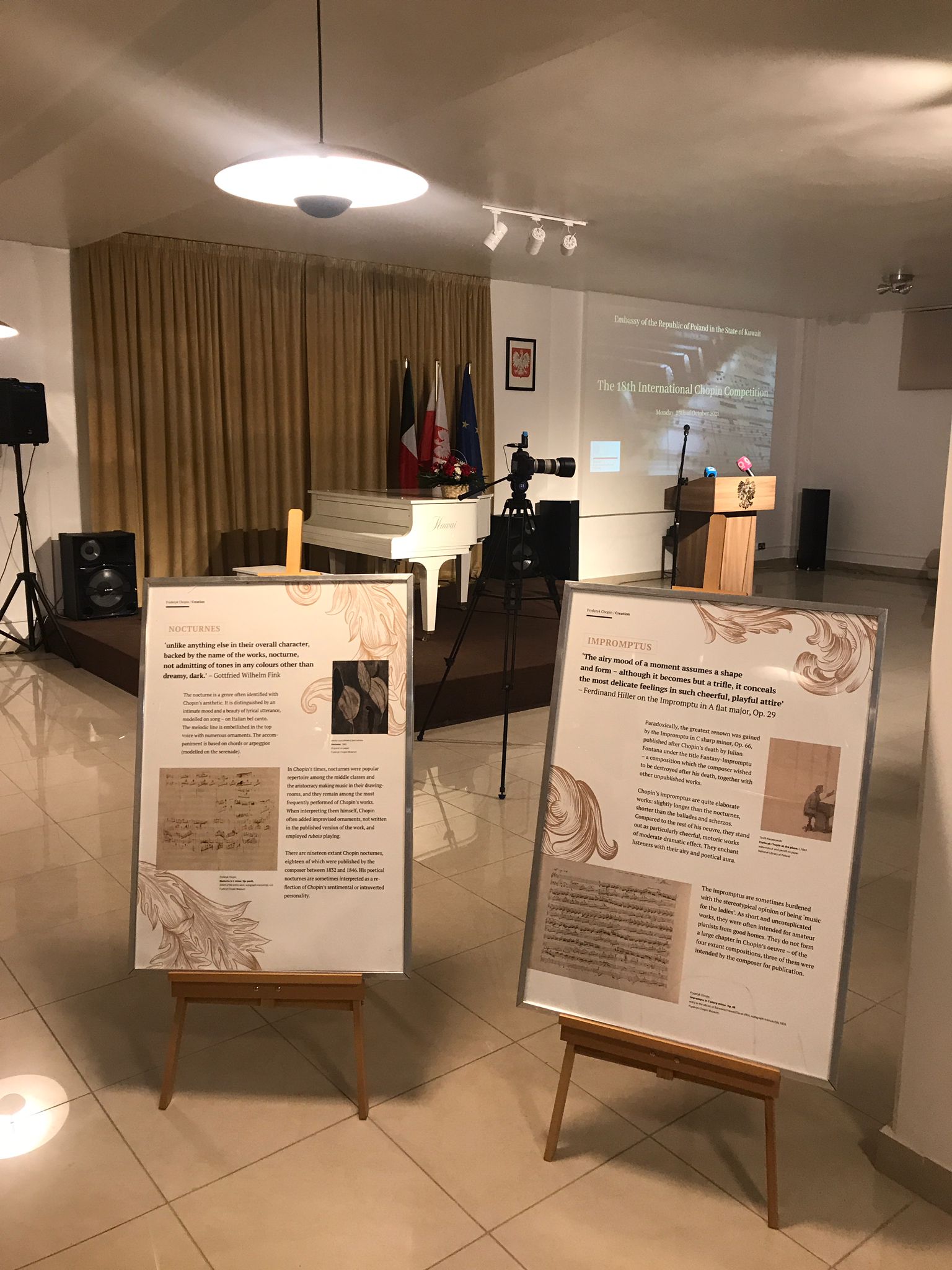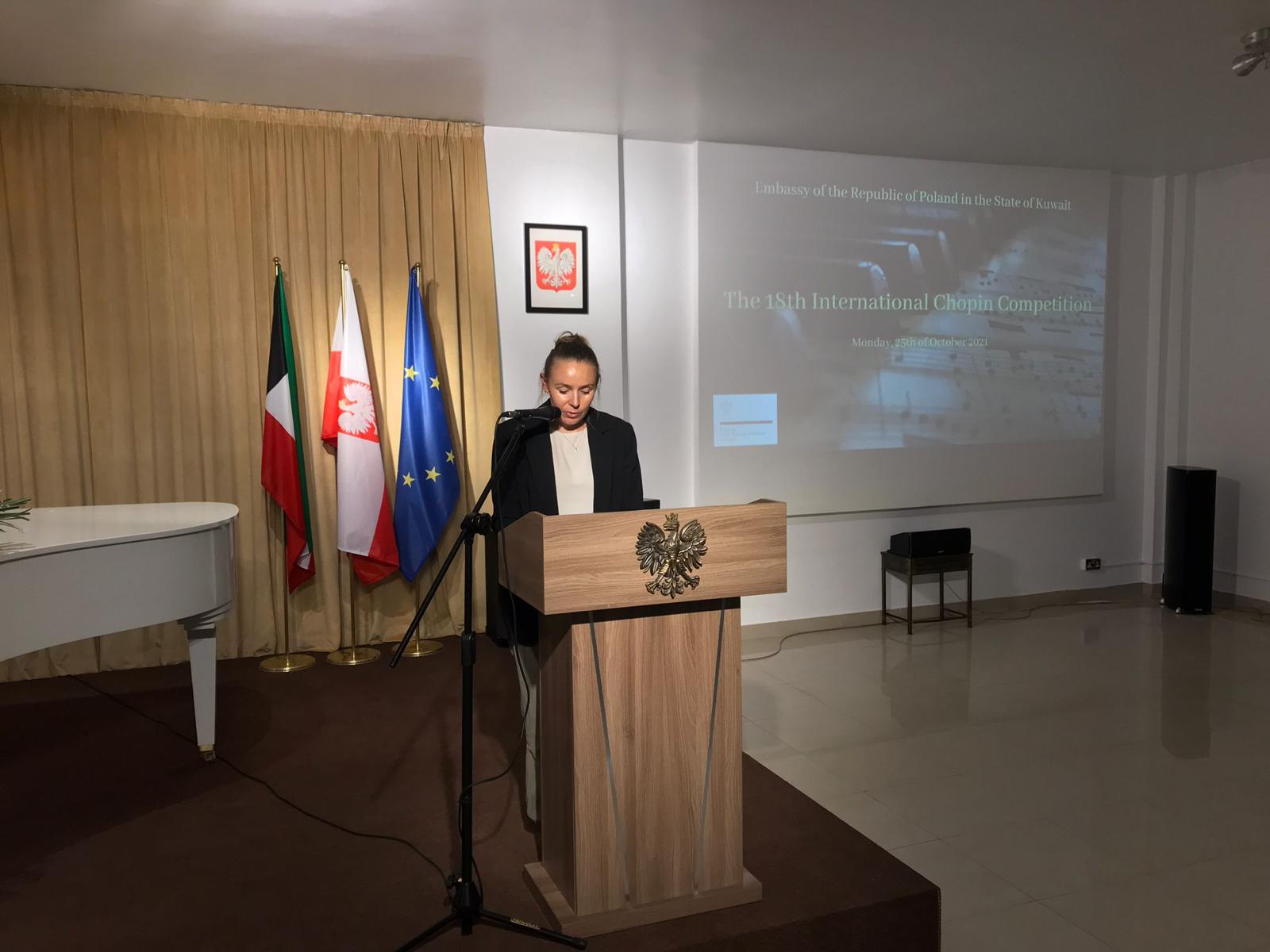 Wczoraj w ambasadzie RP w Kuwejcie odbyła się retransmisja koncertu laureatów XVIII Międzynarodowego Konkursu Chopinowskiego, połączona z otwarciem wystawy dot. życia i twórczości Fryderyka Chopina. Wysłuchano gry laureata 4 nagrody Polaka Jakuba Kuszlika, a także zwycięzcy tegorocznego konkursu, Kanadyjczyka Bruca Liu