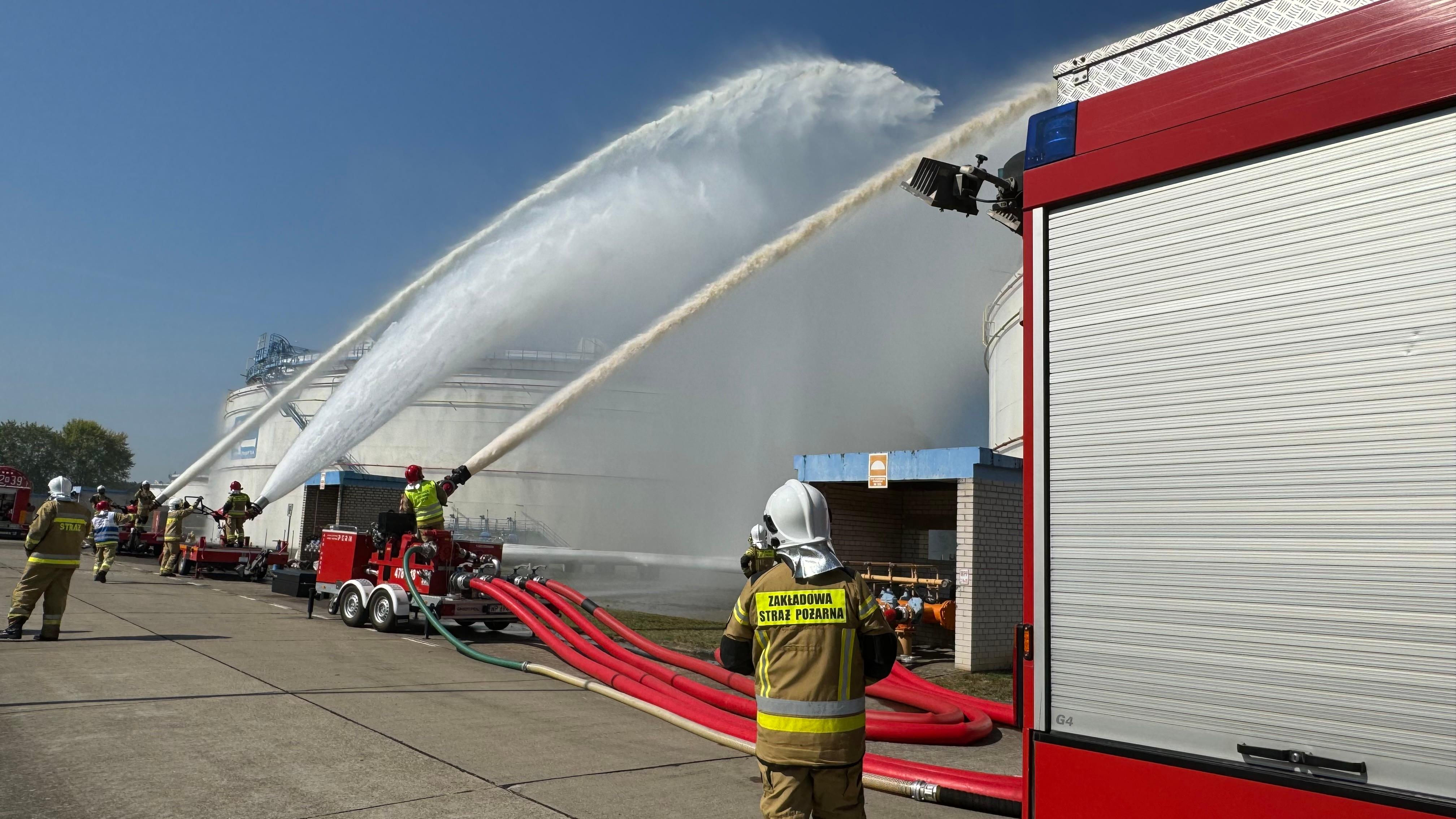 Głównym założeniem ćwiczeń pk „BAZA 2024” była organizacja i prowadzenie działań gaśniczych podczas pożarów zbiorników ropy naftowej i cieczy ropopochodnych na przykładzie pożaru zbiornika magazynowego.