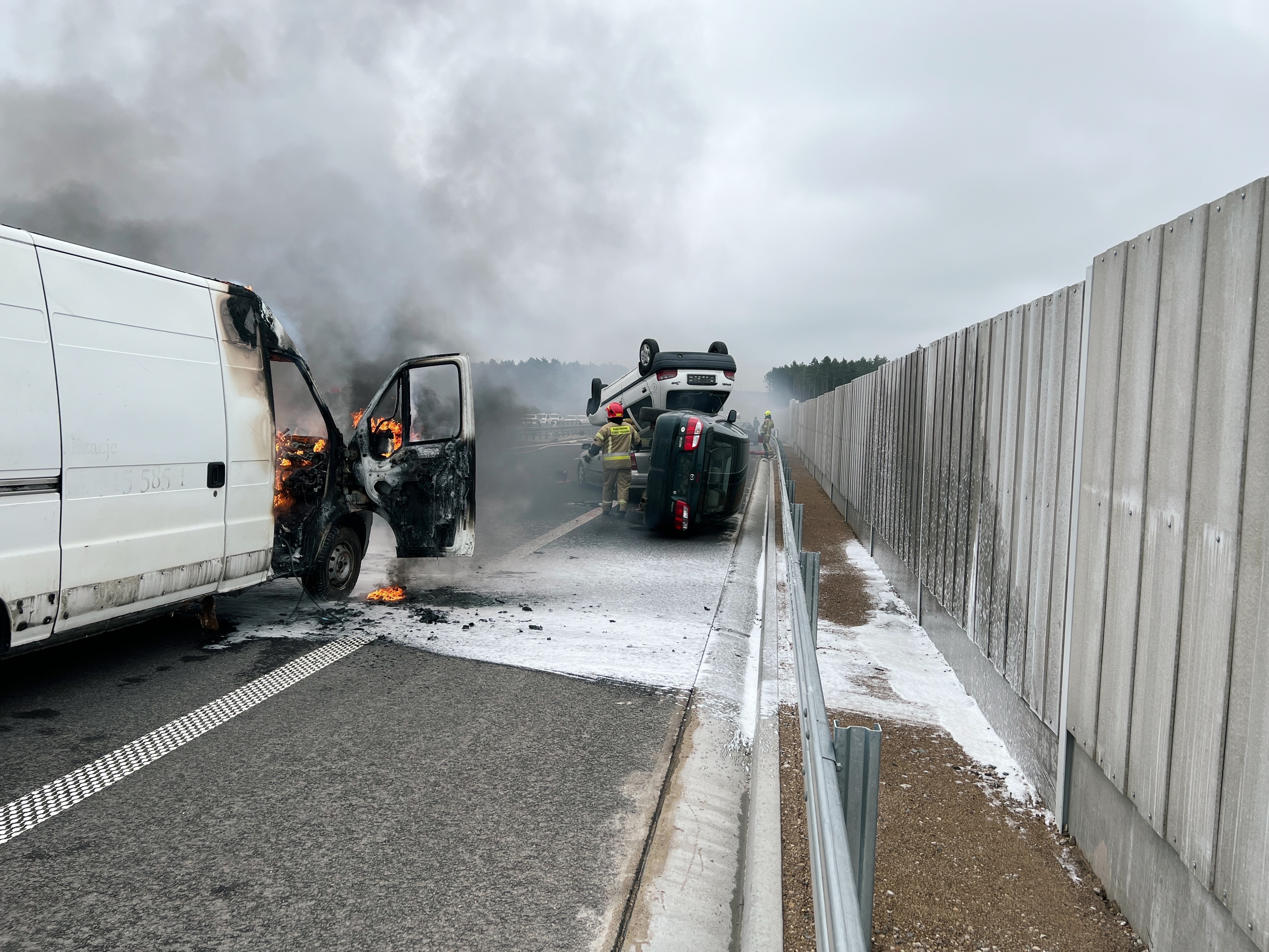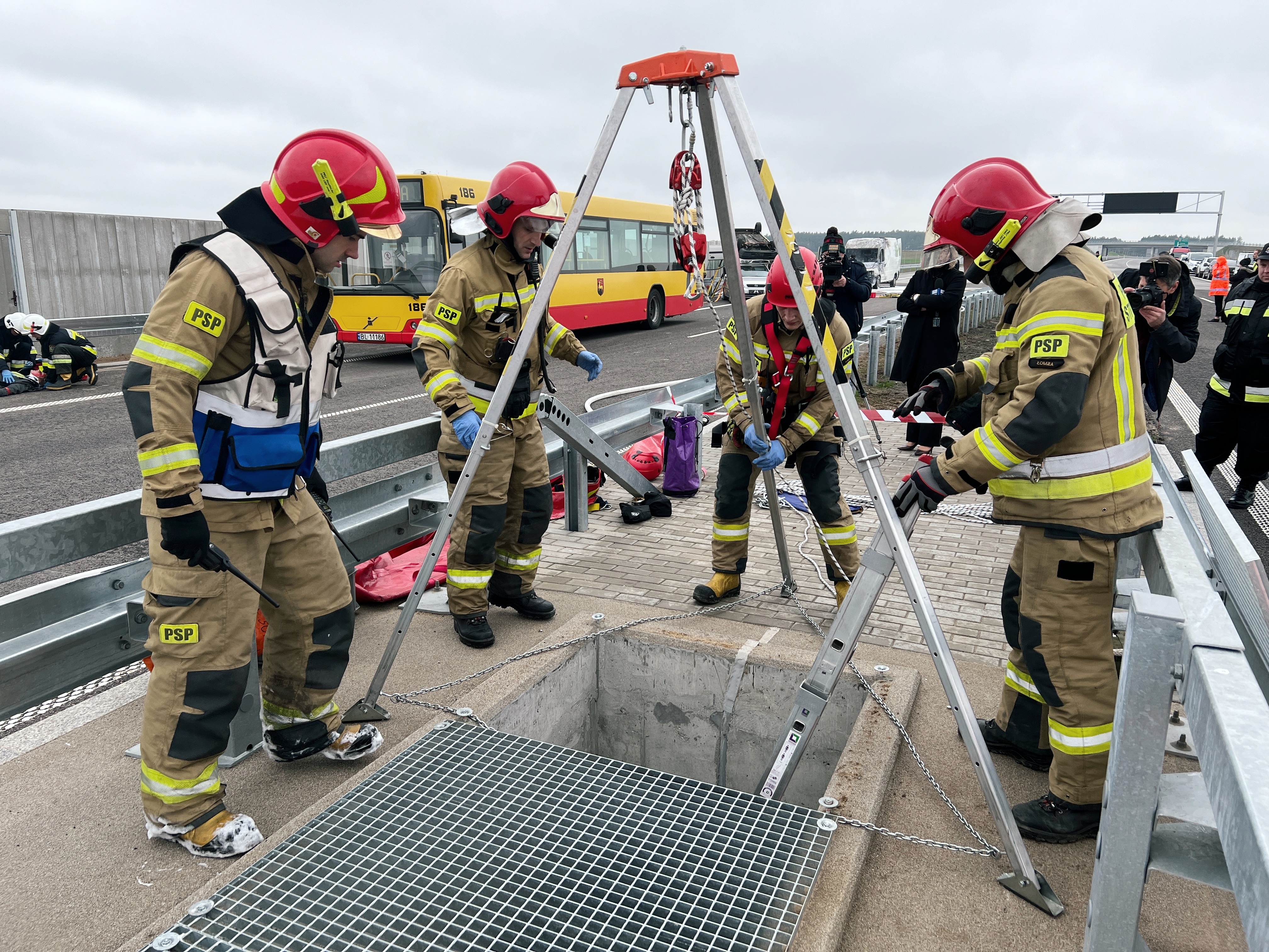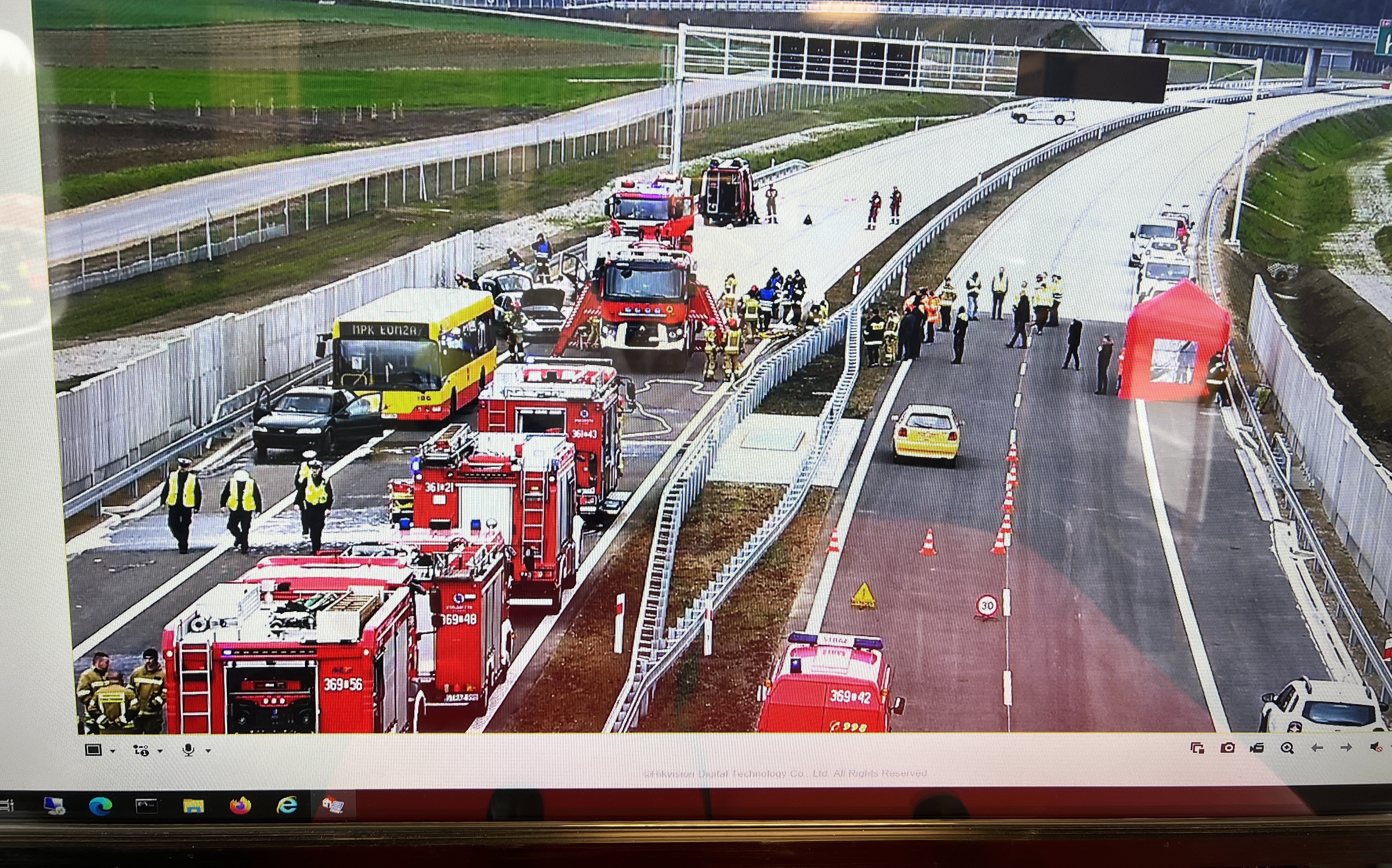 „W dniu 26 kwietnia 2022 r. na drodze S61 prowadzono prace konserwacyjne wyświetlaczy systemu zarzadzania ruchem. Pracownik wykonujący prace na bramownicy z niewiadomych przyczyn traci przytomność i upuszcza narzędzia na przebiegającą pod spodem jezdnię. Kierowca przejeżdżającego autobusu próbując gwałtownie wyminąć spadające przedmioty, uderza w samochód jadący przed nim i wpada w poślizg. Autobus hamuje i pozostaje na pasie jezdni.