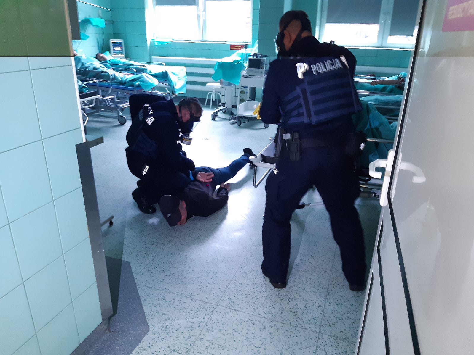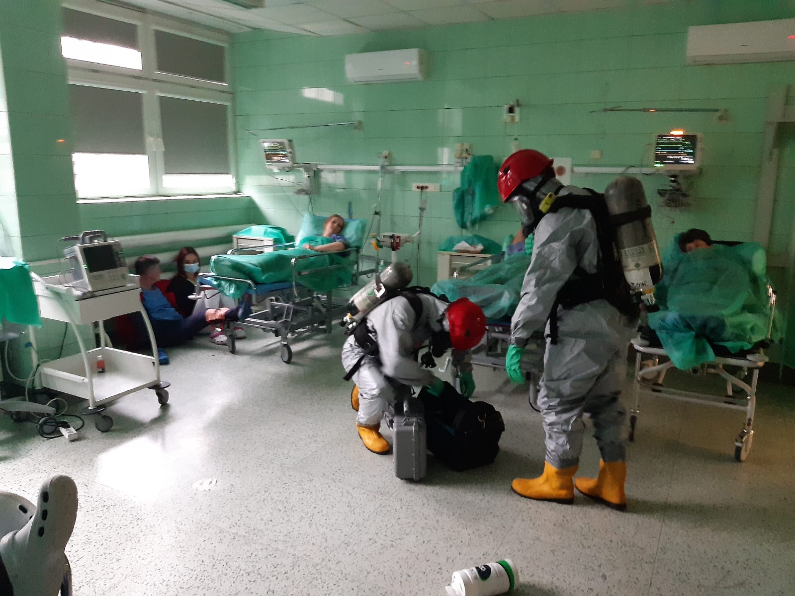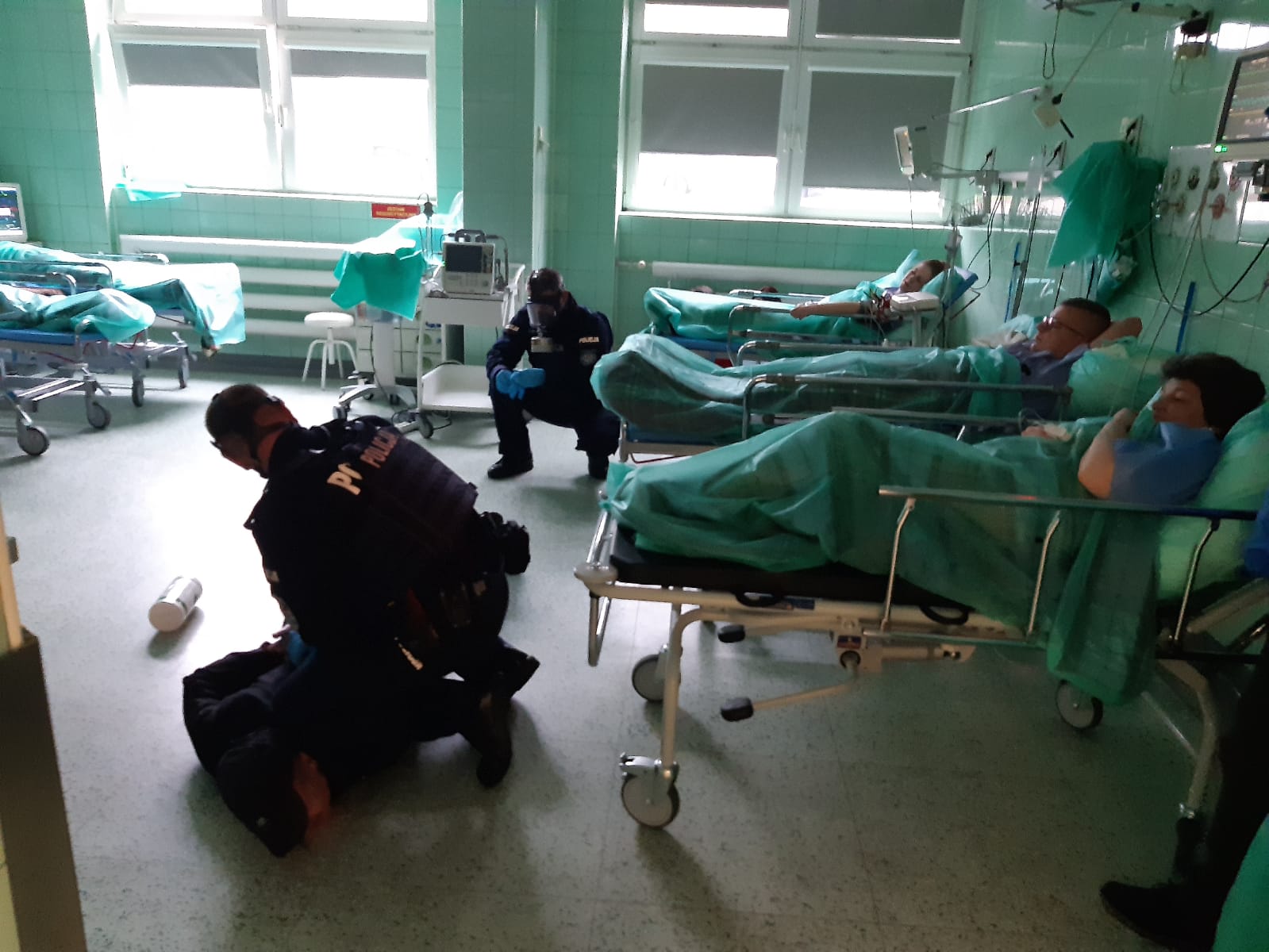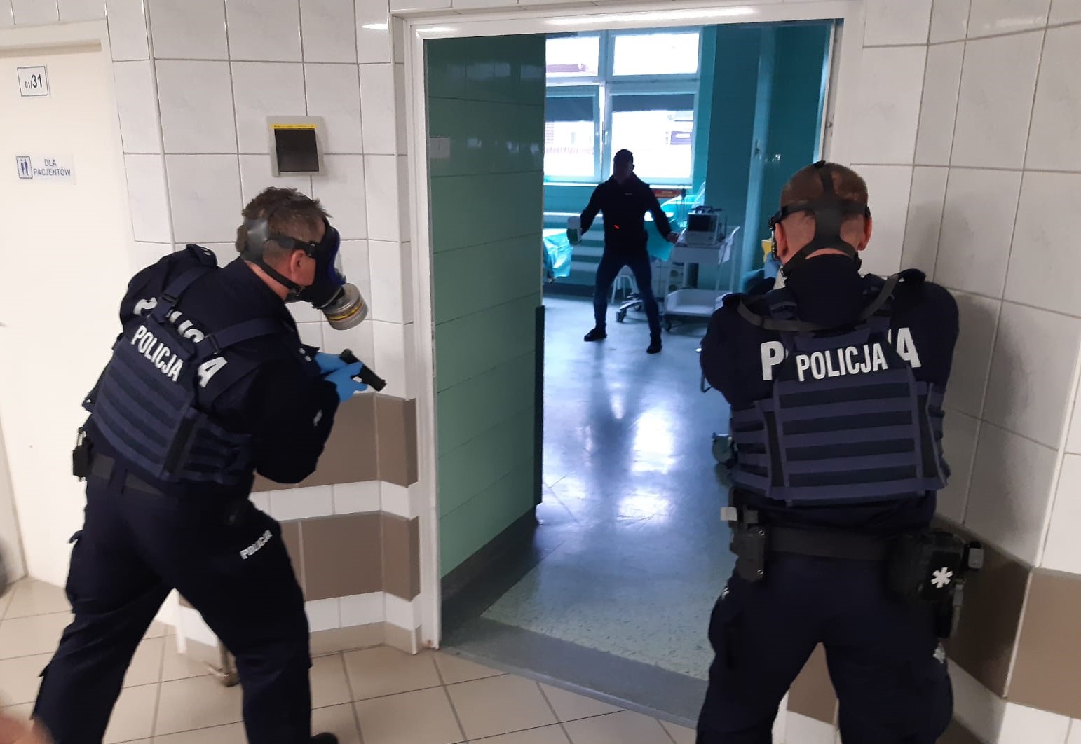 W założeniach do ćwiczeń przewidziano atak pobudzonego agresywnego napastnika na pacjentów i obecny w sali personel. W drodze przeprowadzonego wywiadu operacyjnego stwierdzono, że agresor posługuje się nieznaną substancją trującą, która podał pacjentom drogą dożylną a personel medyczny skrępował i zatrzymał w zamkniętej sali.