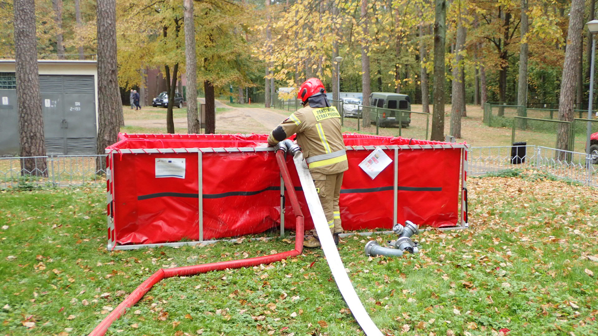 Ćwiczenia były dobrą okazją do wykorzystania agregatu pompowego dużej wydajności i rozwinięcia magistrali złożonej z odcinków węży tłocznych do przenośnego zbiornika wodnego o pojemności 13 m³. Zbiornik wodny Tanker wykorzystywany jest przez strażaków do zaopatrzenia wodnego podczas działań ratowniczo-gaśniczych.