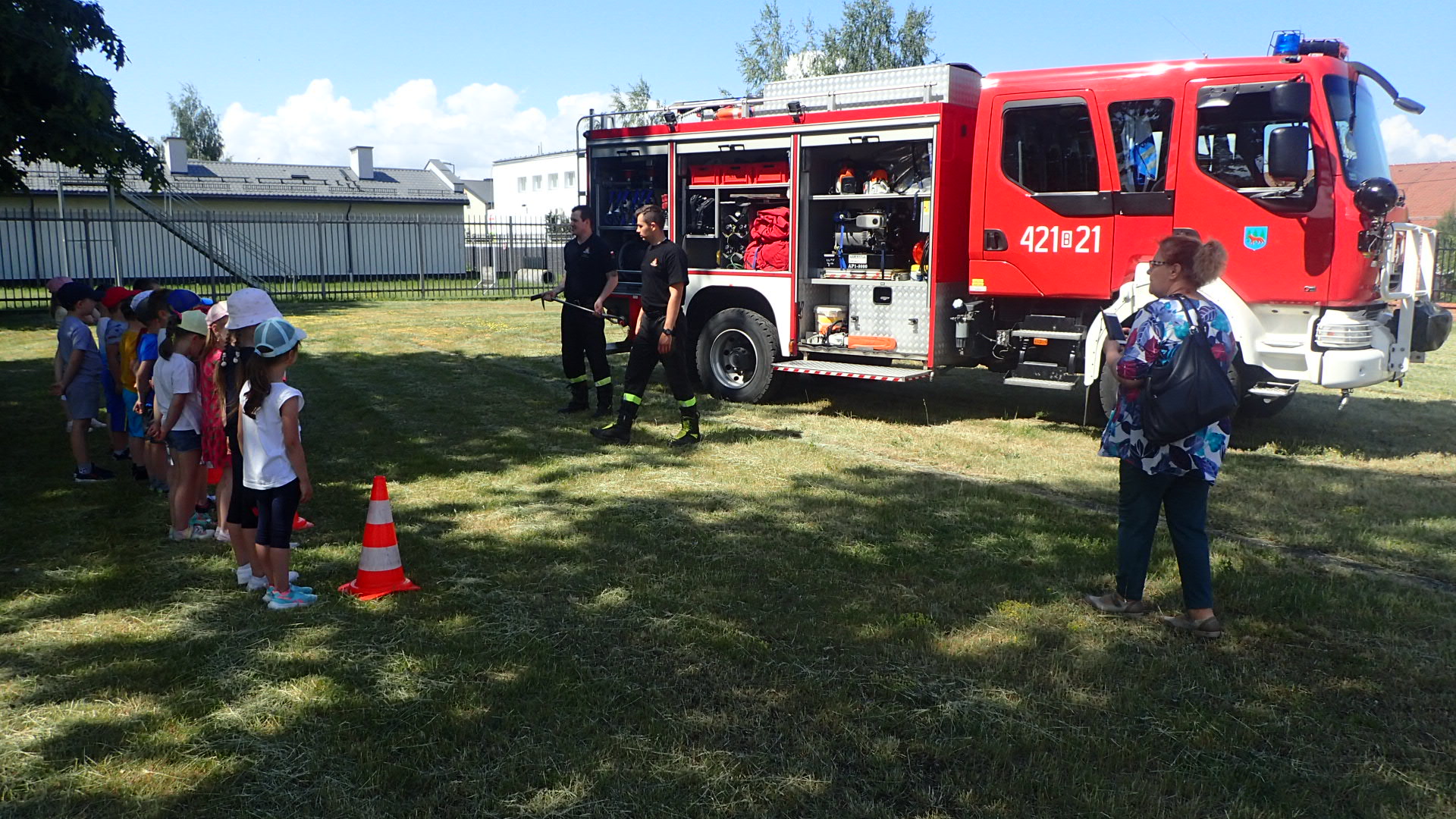 Wizyty w naszej komendzie były okazją nie tylko do zwiedzenia strażnicy i obejrzenia sprzętu ratowniczo-gaśniczego, ale również czynnego uczestnictwa w zajęciach edukacyjnych na świeżym powietrzu. W ramach spotkania ze strażakami dzieci zadawały pytania na temat występujących zagrożeń i służby w Państwowej Straży Pożarnej, na które uzyskiwały odpowiedź. Wszyscy chętni, którzy chcieli się poczuć przez chwilę prawdziwymi strażakami ubrali się w mundury i hełmy.