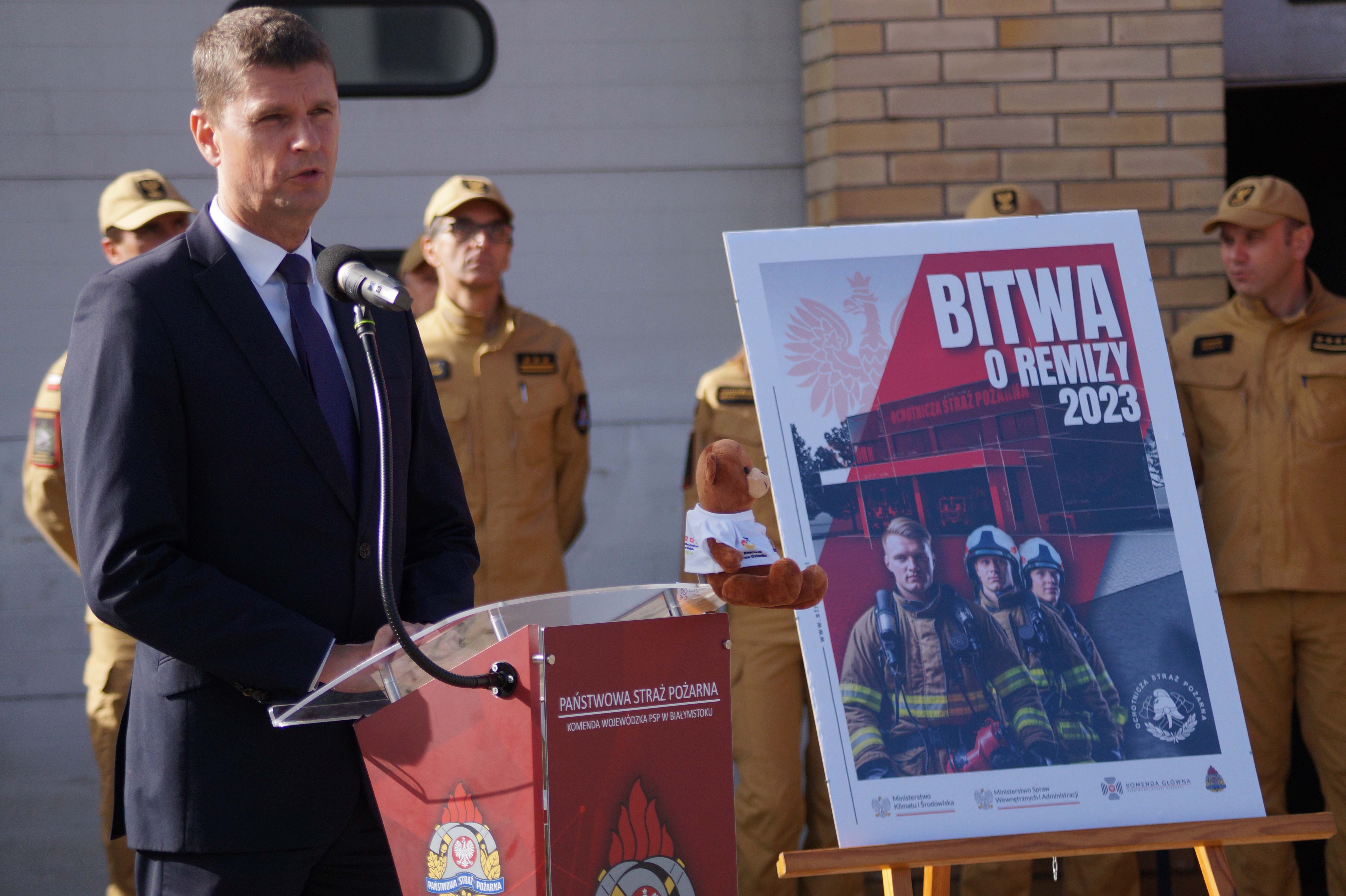 Podlaski Komendant Wojewódzki nadbryg. Sebastian Zdanowicz przywitał gości i uczestników wydarzenia. Następnie w krótkim wystąpieniu zaznaczył rolę doposażania jednostek PSP i OSP mówiąc: