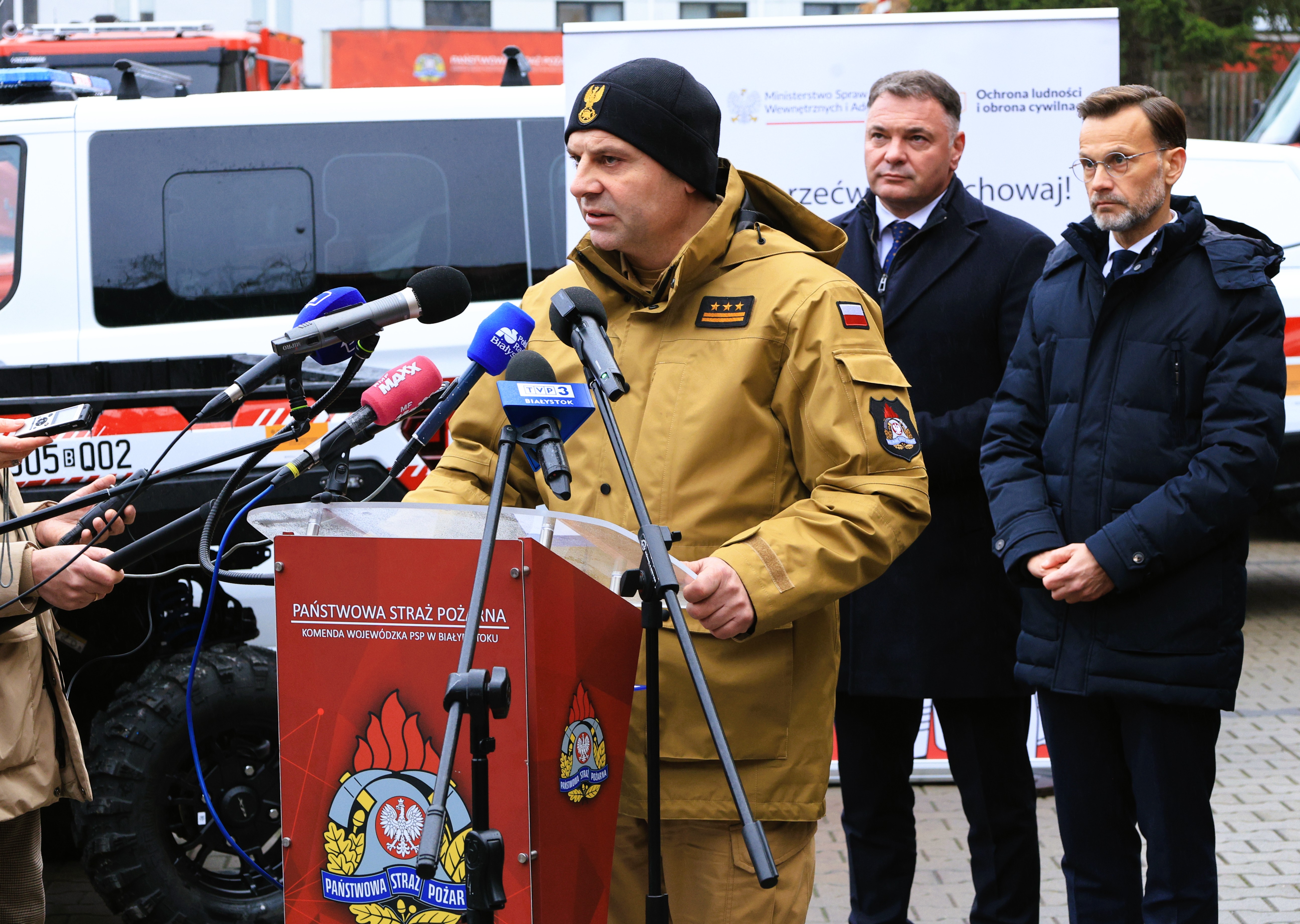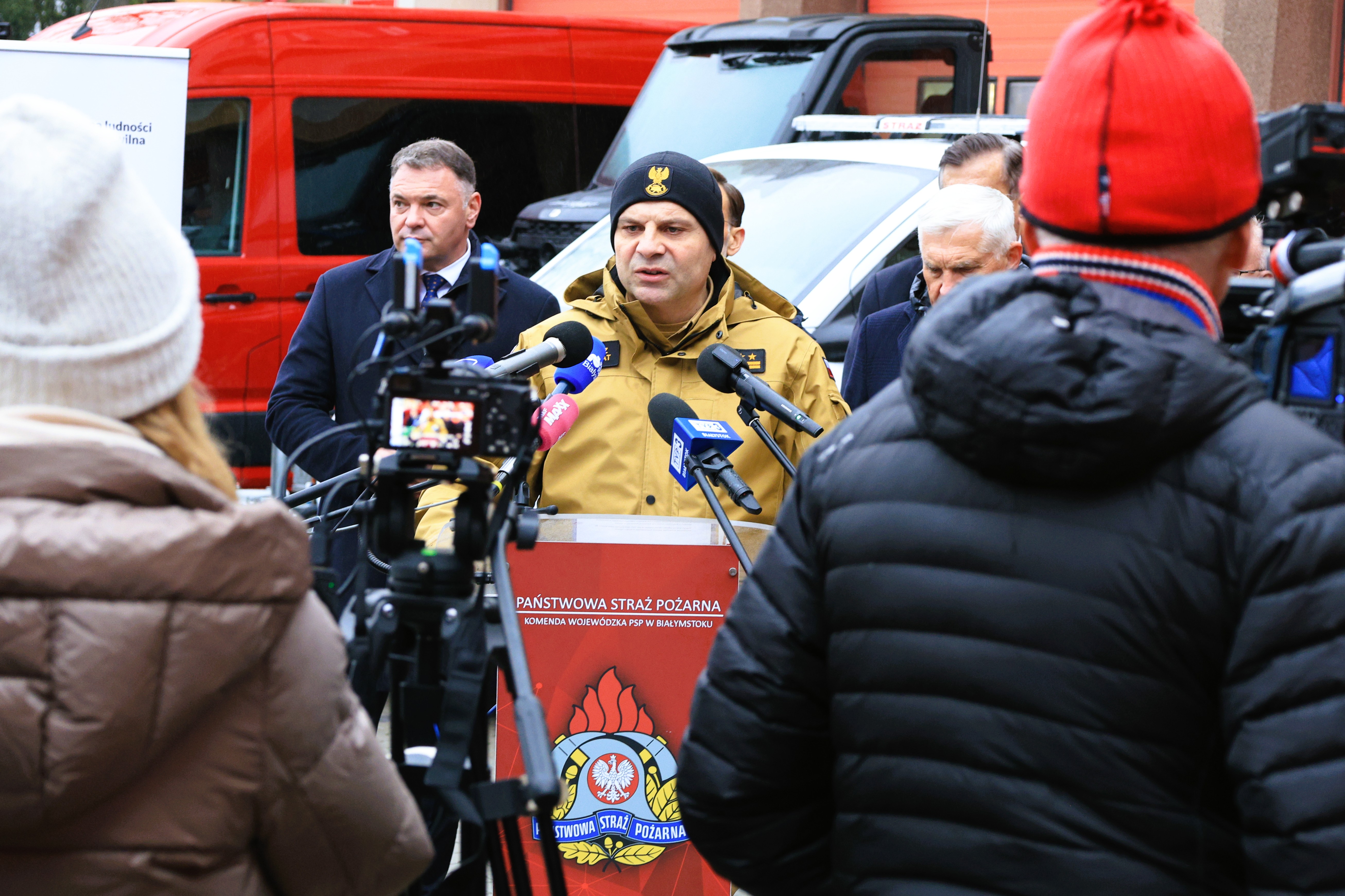 Podczas wydarzenia podlaski komendant wojewódzki PSP - st. bryg. Janusz Kondrat, obok Jacka Brzozowskiego - wojewody podlaskiego, prezydenta Miasta Białystok- Tadeusza Truskolaskiego i samorządowców z terenu województwa podlaskiego, zabrał głos w trakcie briefingu.