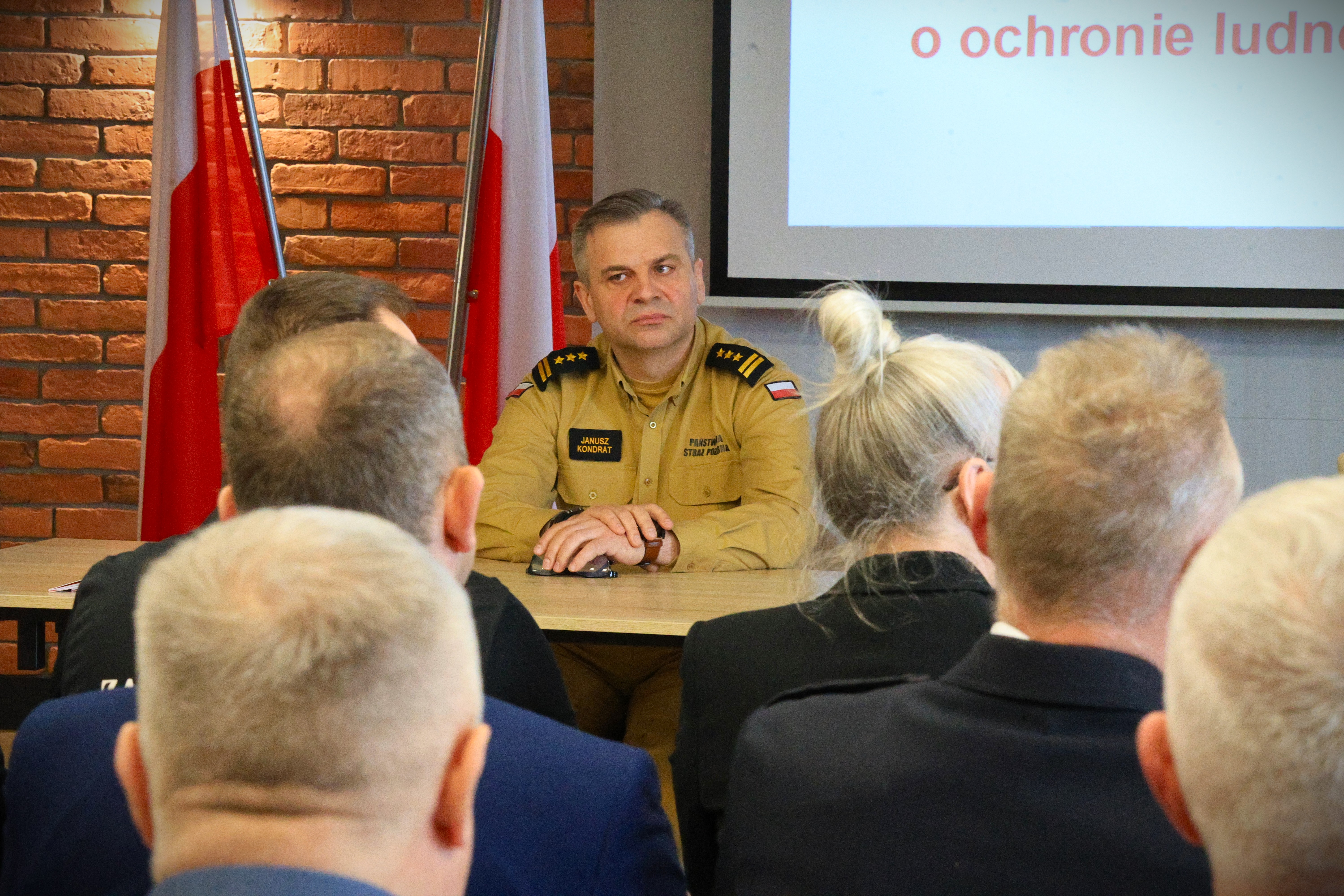 st. bryg. Janusz Kondrat podczas swojego wystąpienia omówił prezentację w której zostały szczegółowo określne zadania Państwowej Straży Pożarnej, wynikające z ustawy o ochronie ludności i obronie cywilnej.