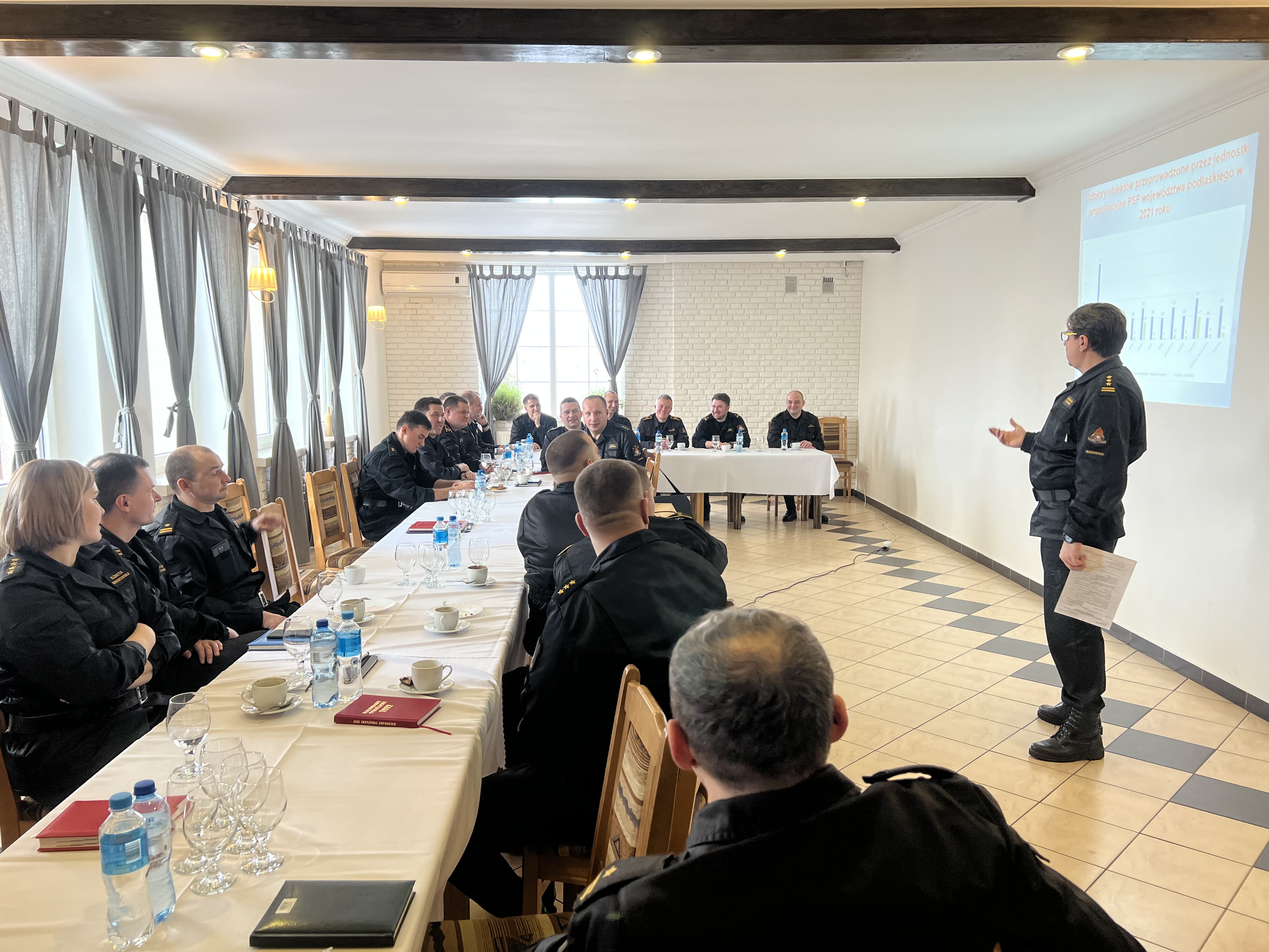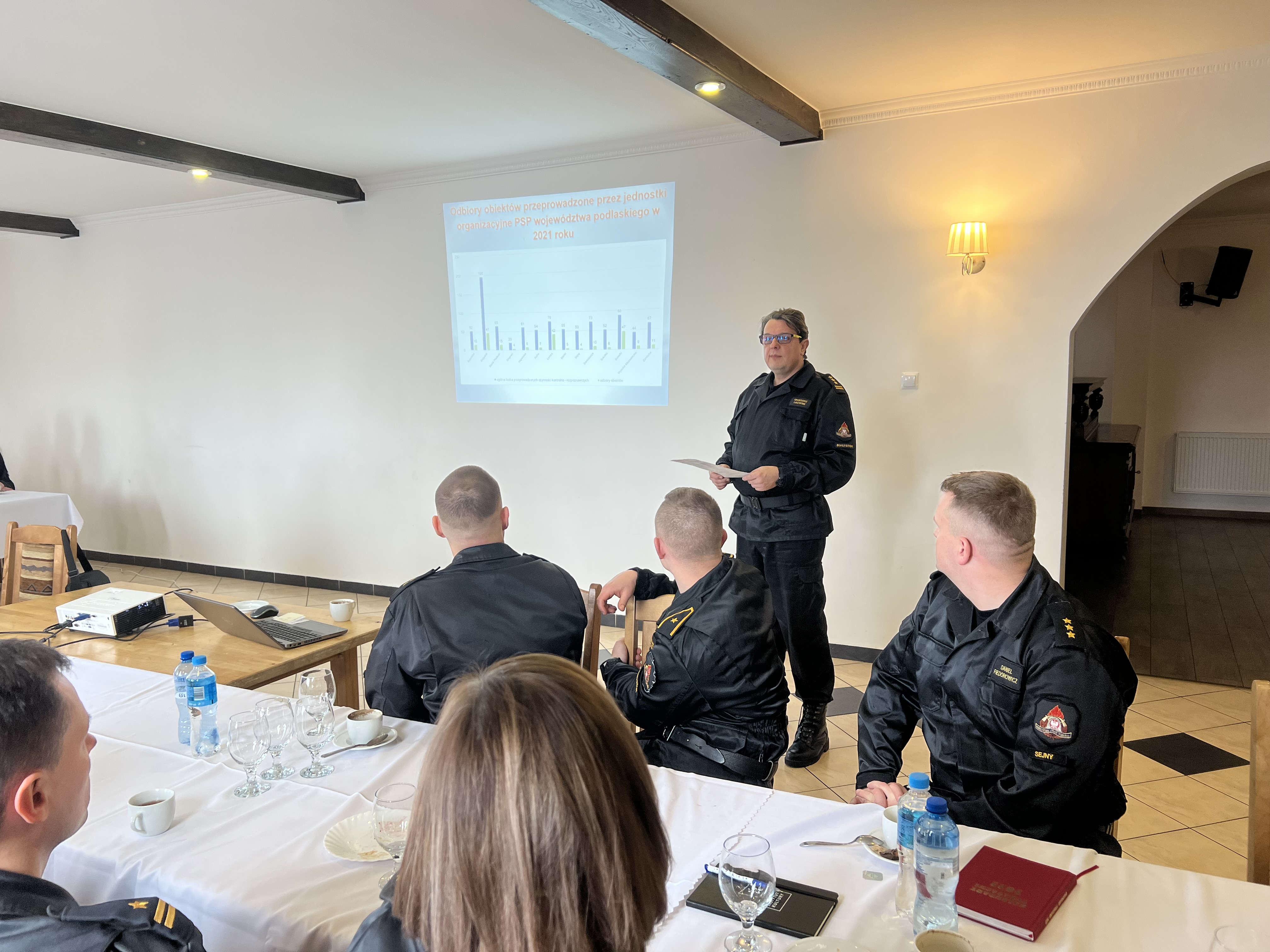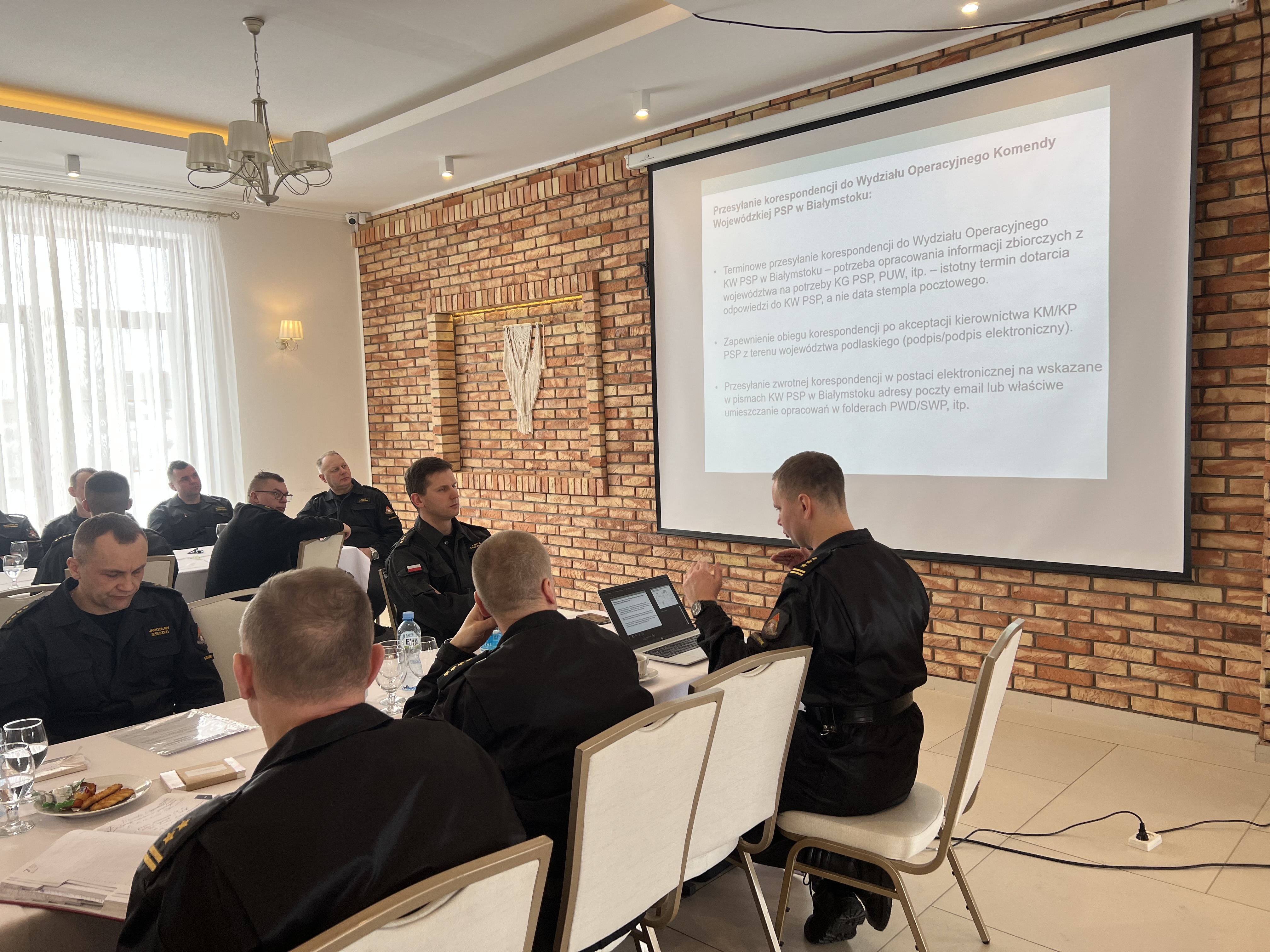 Podczas narady funkcjonariusze Ośrodka Szkolenia poruszyli tematy związane z bhp i szkoleniem strażaków z terenu woj. podlaskiego. Asp. Katarzyna Karpowicz przedstawiła temat doskonalenia zawodowego i szkoleń specjalistycznych strażaków z terenu woj. podlaskiego, natomiast st.kpt Dominik Kendyś przedstawił zagadnienia dotyczące bezpieczeństwa strażaków podczas działań ratowniczych oraz wykorzystanie kamery termowizyjnej pod kątem poprawy bezpieczeństwa w czasie prowadzonych działań ratowniczych.