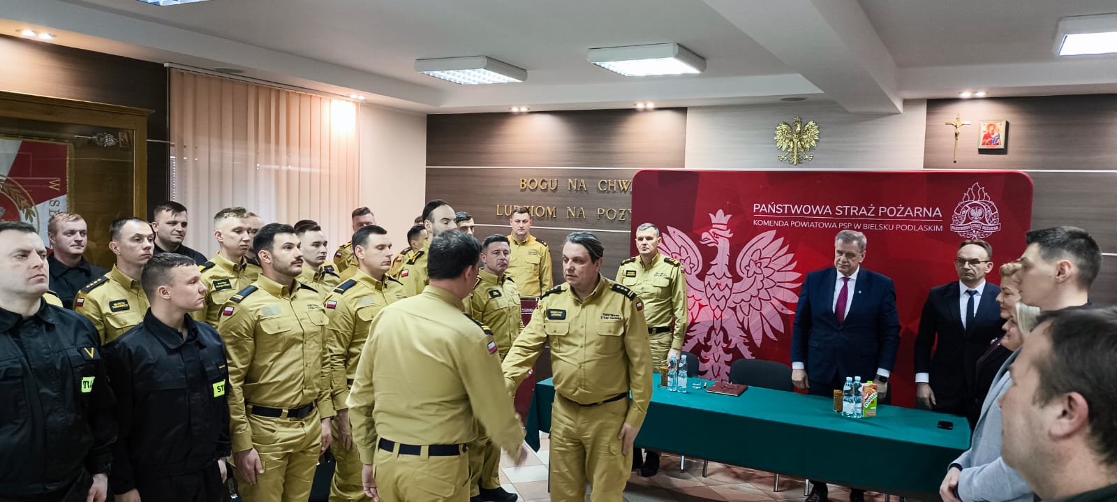 Następnie zastępca podlaskiego komendanta wojewódzkiego Państwowej Straży Pożarnej st. bryg. Grzegorz Lisowski podsumował funkcjonowanie ochrony przeciwpożarowej w województwie podlaskim i przedstawił zadania do realizacji w roku bieżącym. Podziękował również wszystkim zaproszonym gościom, władzom samorządowym, strażakom i pracownikom cywilnym za codzienną służbę, wkład i zaangażowanie na rzecz bezpieczeństwa lokalnej społeczności.