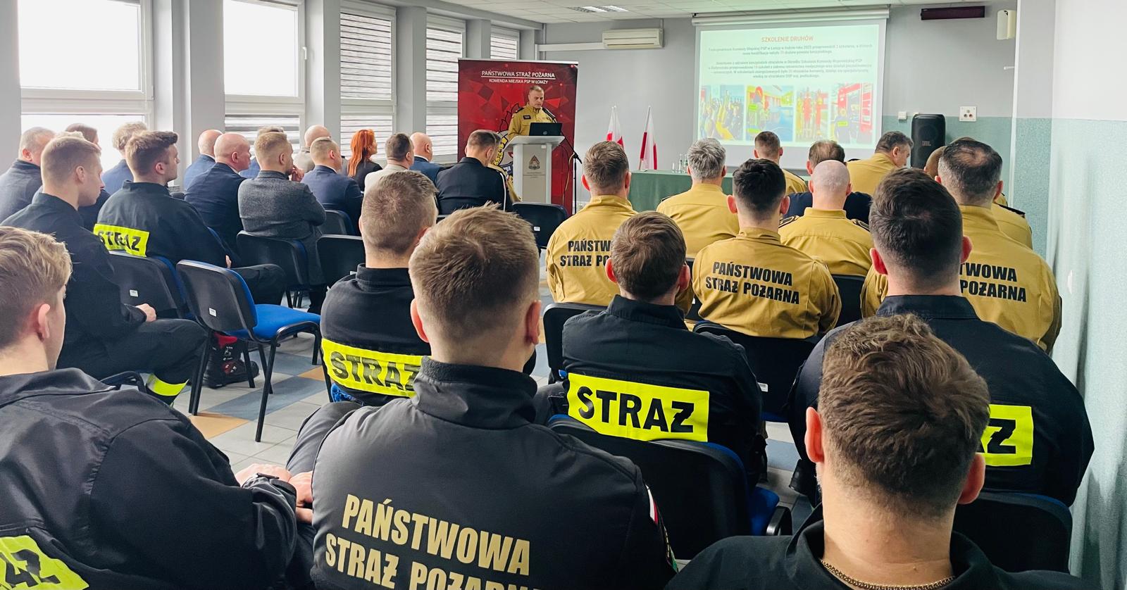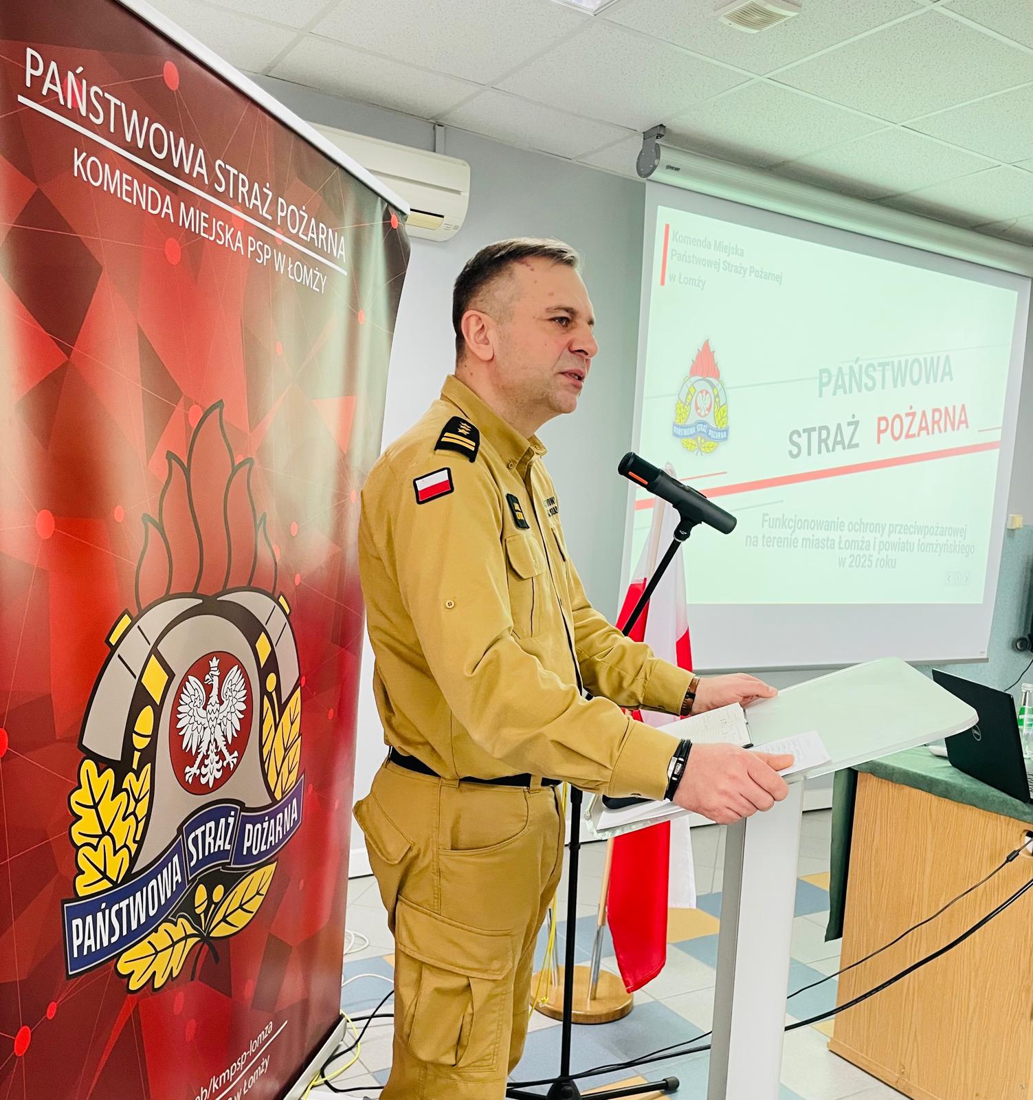 Komendant miejski PSP w Łomży bryg. Arkadiusz Obrycki przywitał zebranych gości, a następnie w oparciu o prezentację multimedialną podsumował stan ochrony przeciwpożarowej na terenie miasta Łomża i powiatu łomżyńskiego w 2025 r oraz działalność tutejszej komendy.