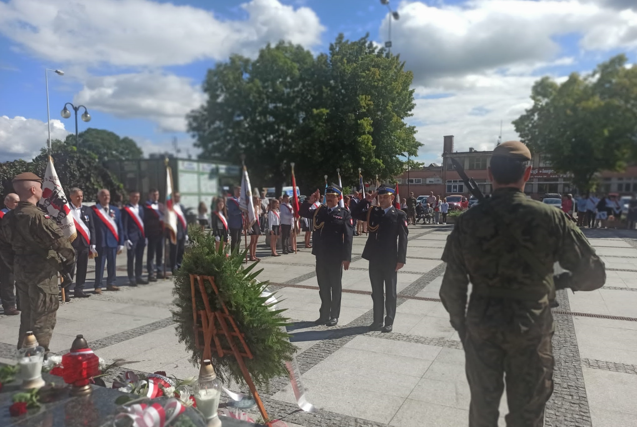 Zastępca Podlaskiego Komendanta Wojewódzkiego st. bryg. Robert Dzierżek uczestniczył we mszy świętej w kościele pw. Świętego Krzyża w Łapach. Następnie brał udział w uroczystościach upamiętniających rocznicę wybuchu II Wojny Światowej, podczas których złożono wiązanki kwiatów pod Pomnikiem Niepodległości.
