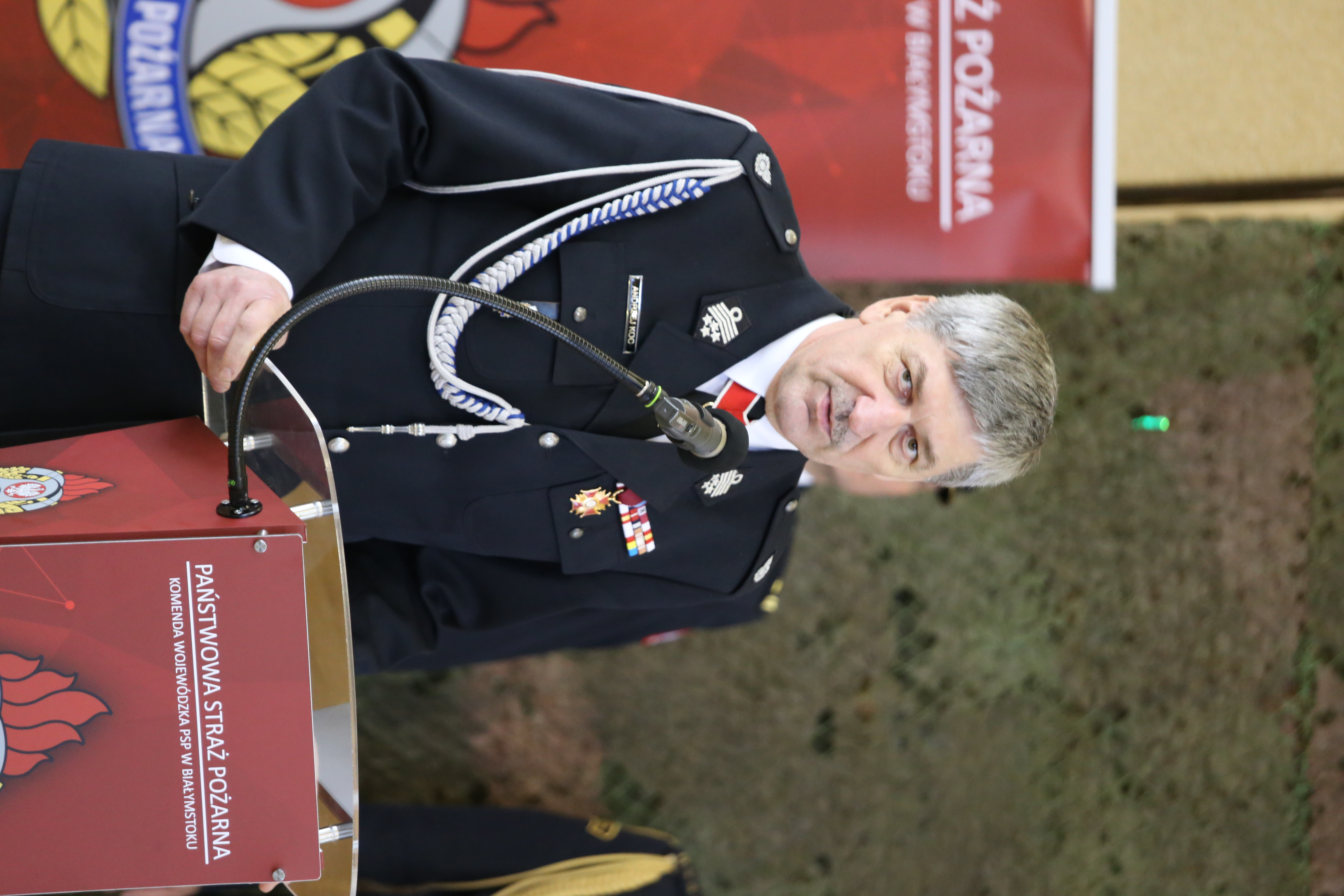 Po przyjęciu meldunku o rozpoczęciu uroczystości Podlaski Komendant Wojewódzki PSP st. bryg. Sebastian Zdanowicz, w krótkiej przemowie przekazał wszystkich funkcjonariuszom i pracownikom cywilnym podziękowania za dotychczasowe zaangażowanie i życzenia dalszej, bezpiecznej służby.