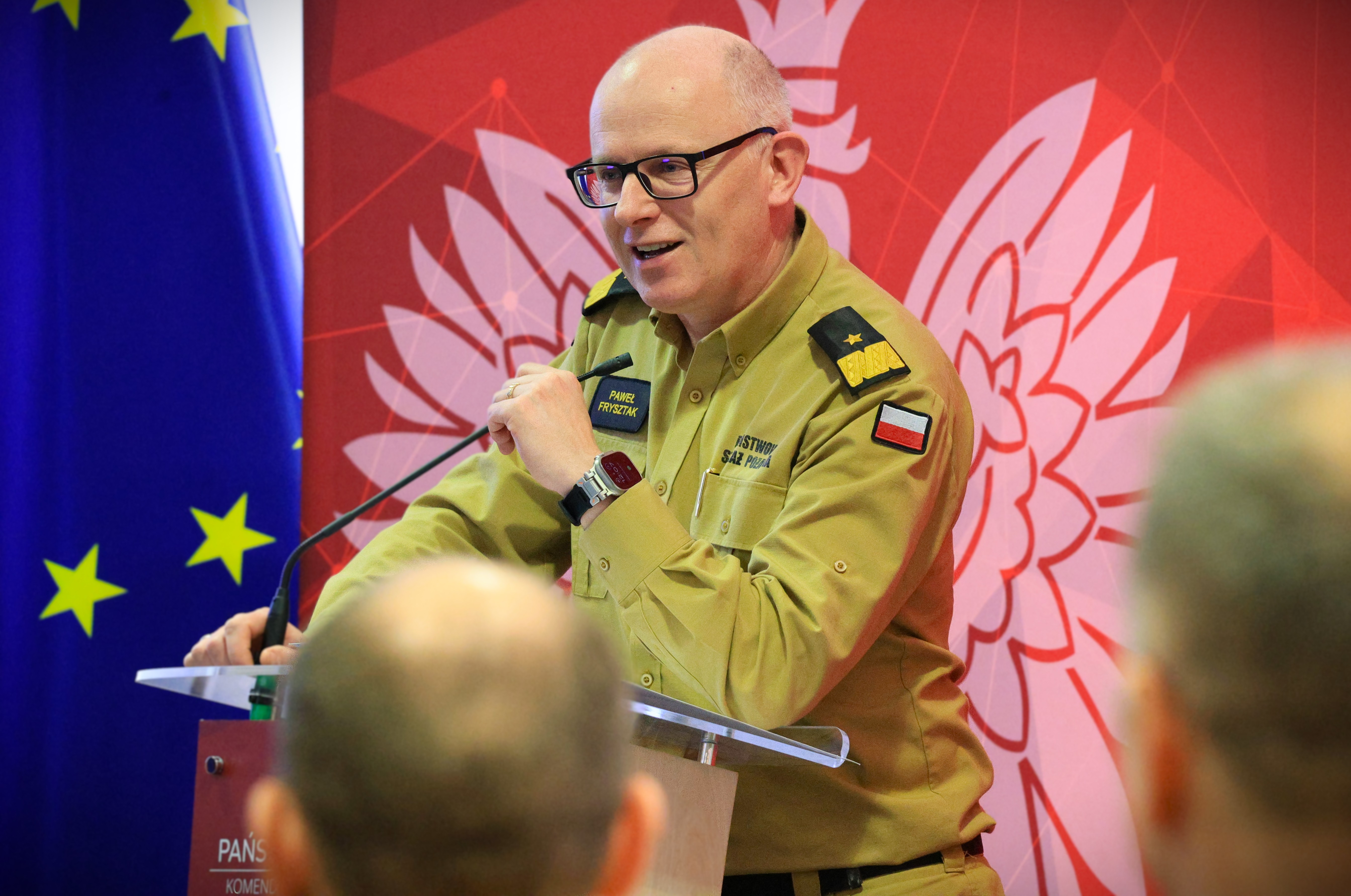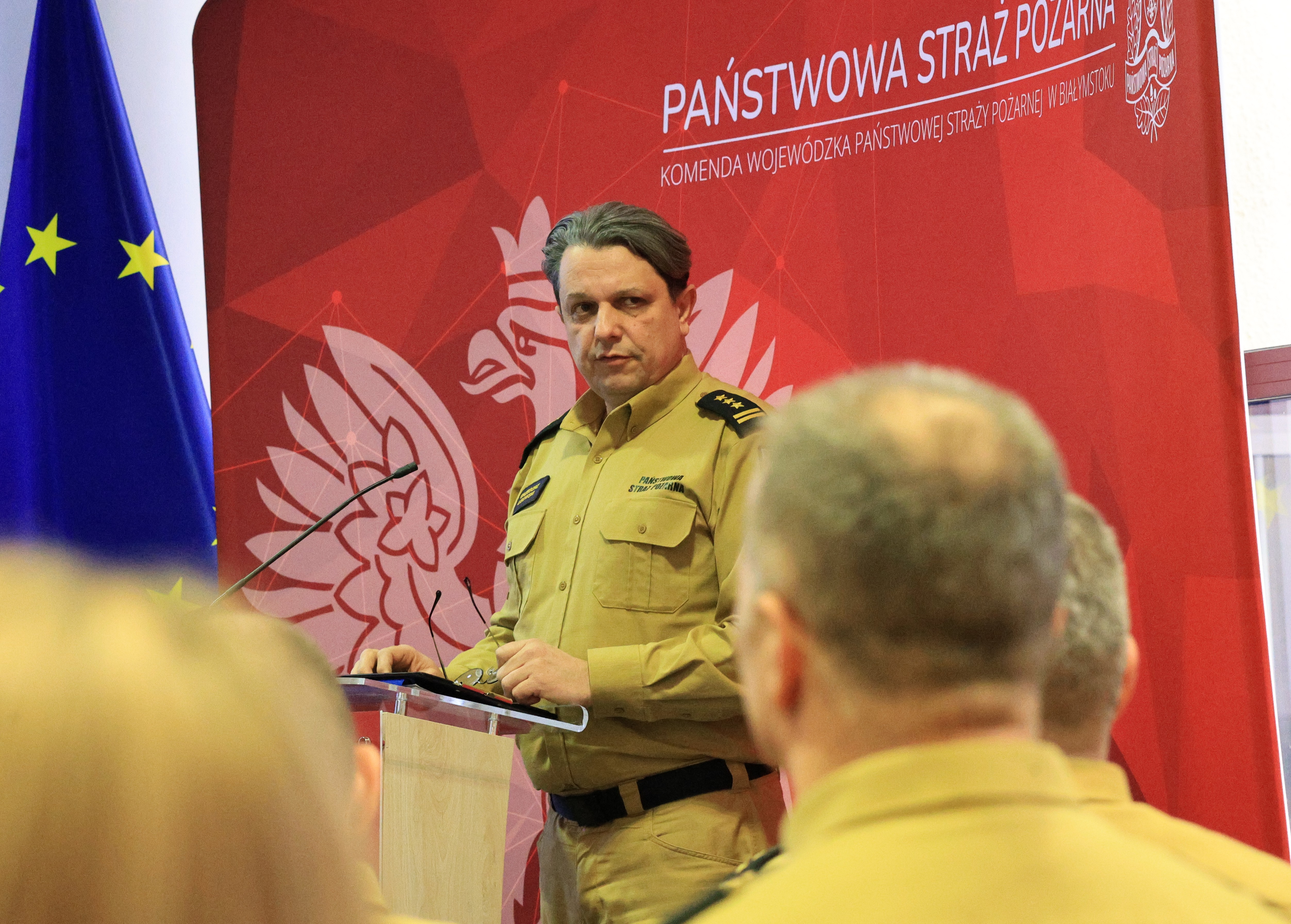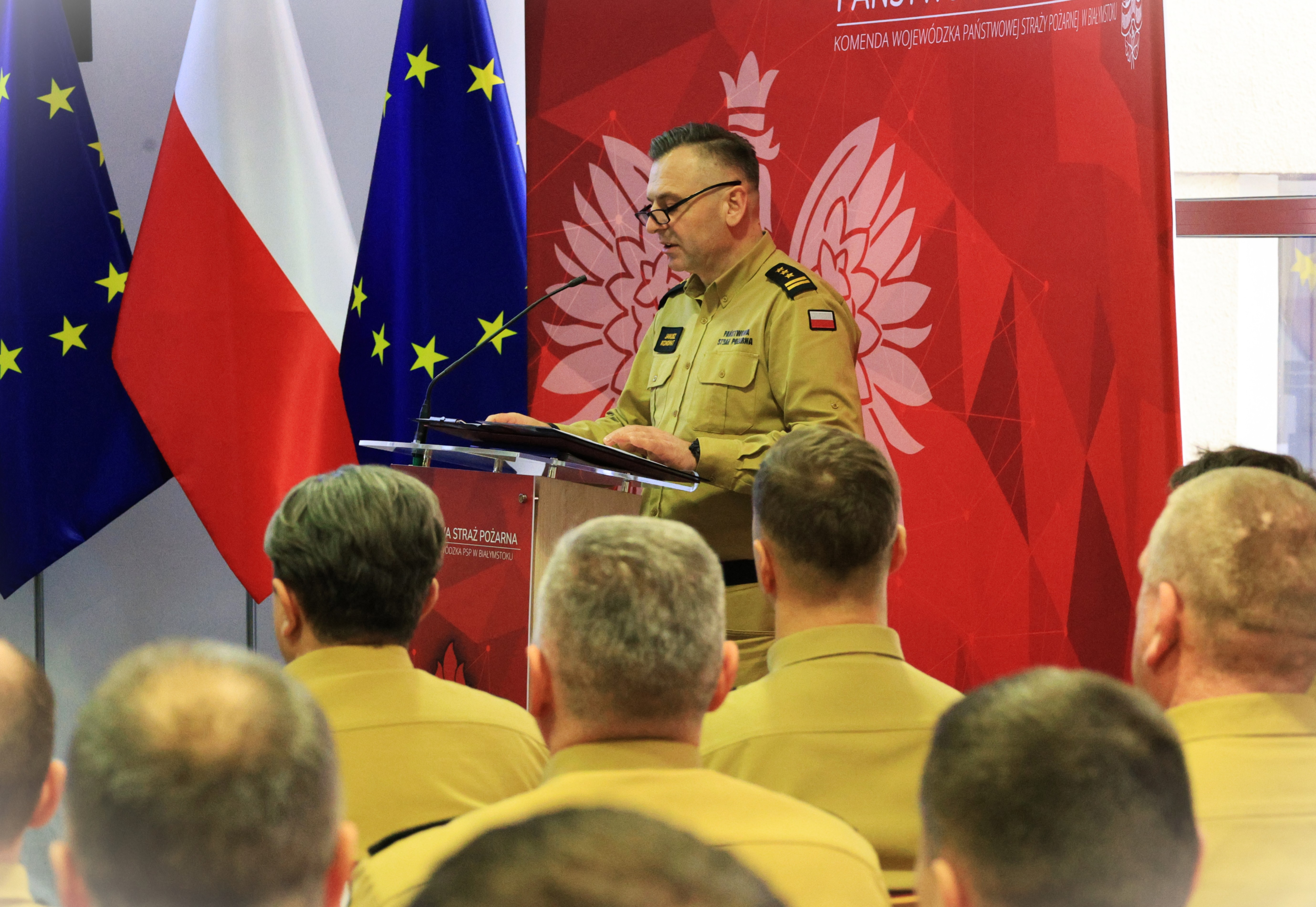 Następnie zastępca komendanta głównego Państwowej Straży Pożarnej - nadbryg. Paweł Frysztak podziękował wszystkim strażakom – za równo funkcjonariuszom PSP jak i druhom ochotnikom z terenu woj. podlaskiego za ich zaangażowanie w codzienną służbę i działania na rzecz ochrony przeciwpożarowej, a także podkreślił rolę współpracy z innymi instytucjami.